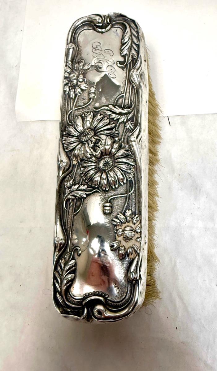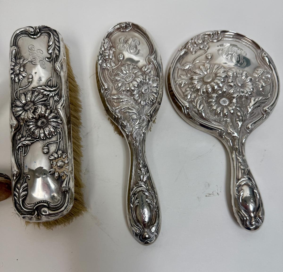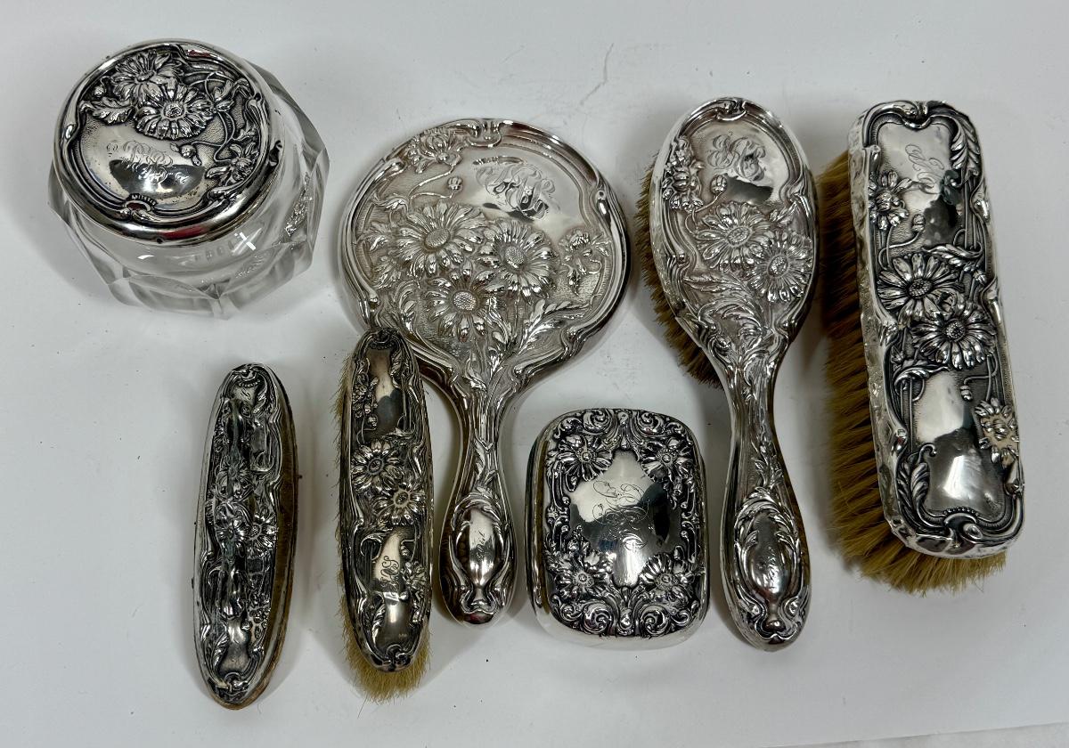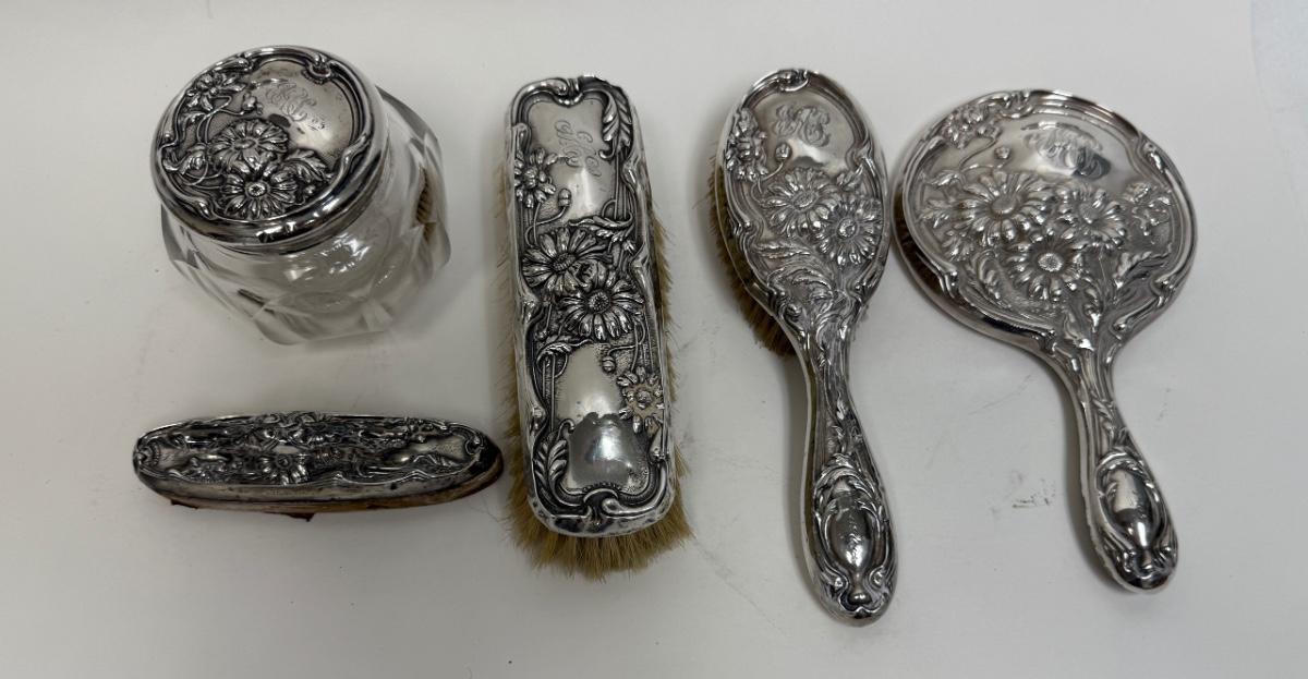925 Sterling Silver Vanity 7 piece Set Monogramed 1902 Pat Floral Pattern - Mirror, (3) Brushes, Nail Buffer, Glass Jar, Soap Box