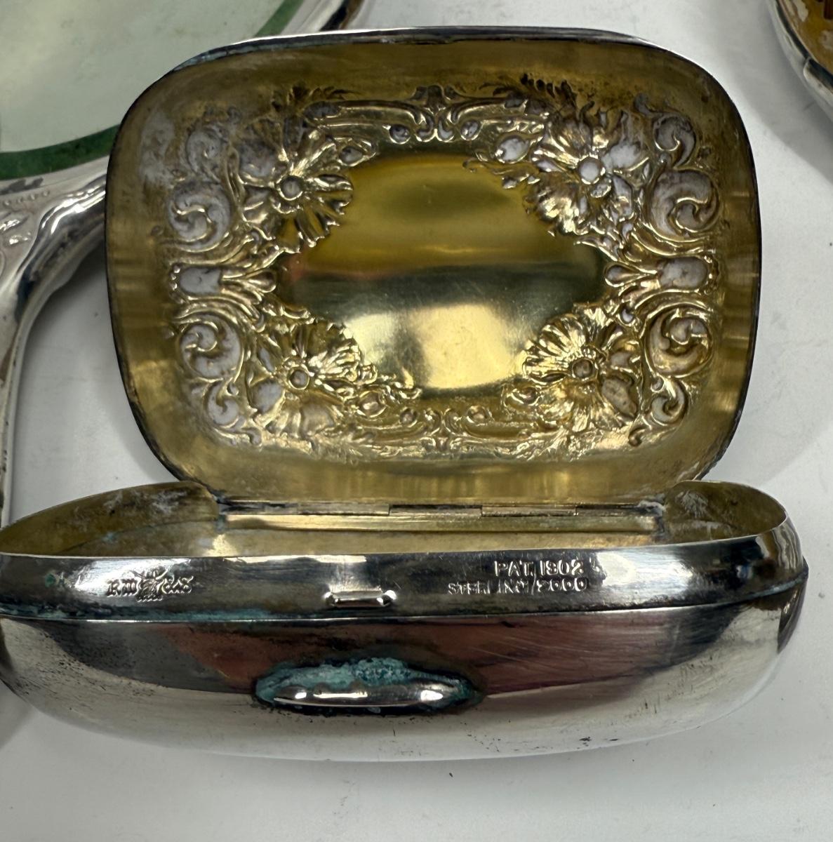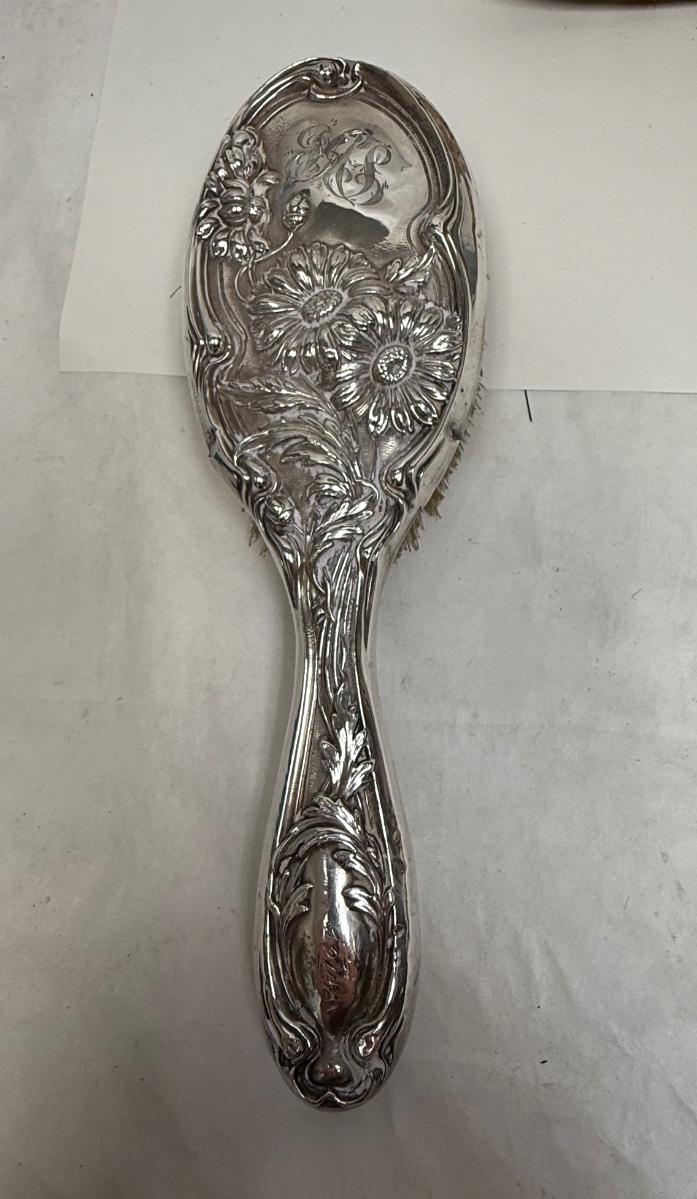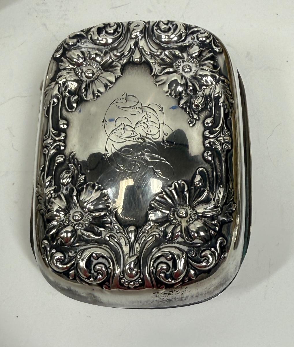 925 Sterling Silver Vanity 7 piece Set Monogramed 1902 Pat Floral Pattern - Mirror, (3) Brushes, Nail Buffer, Glass Jar, Soap Box