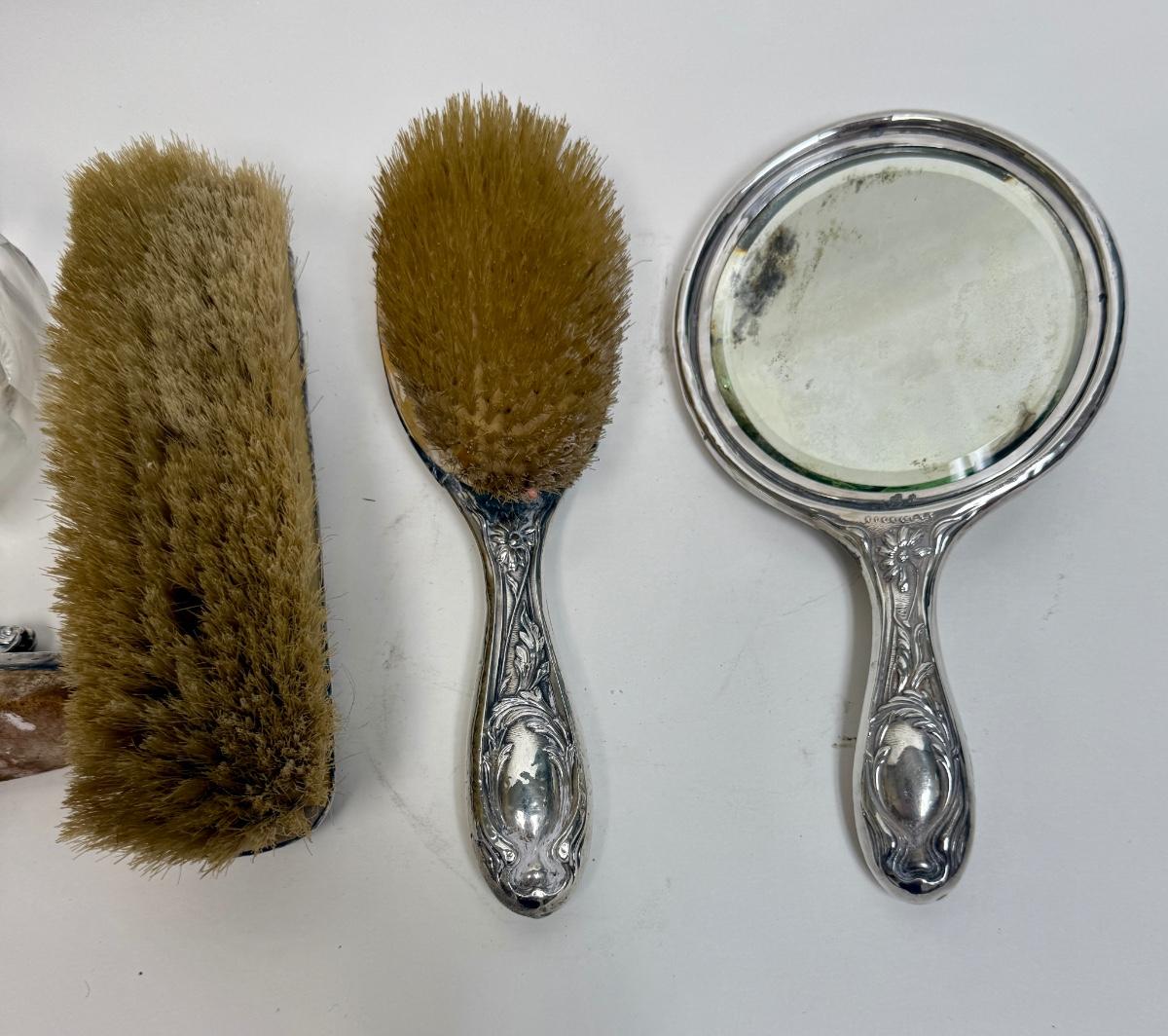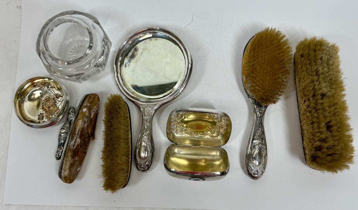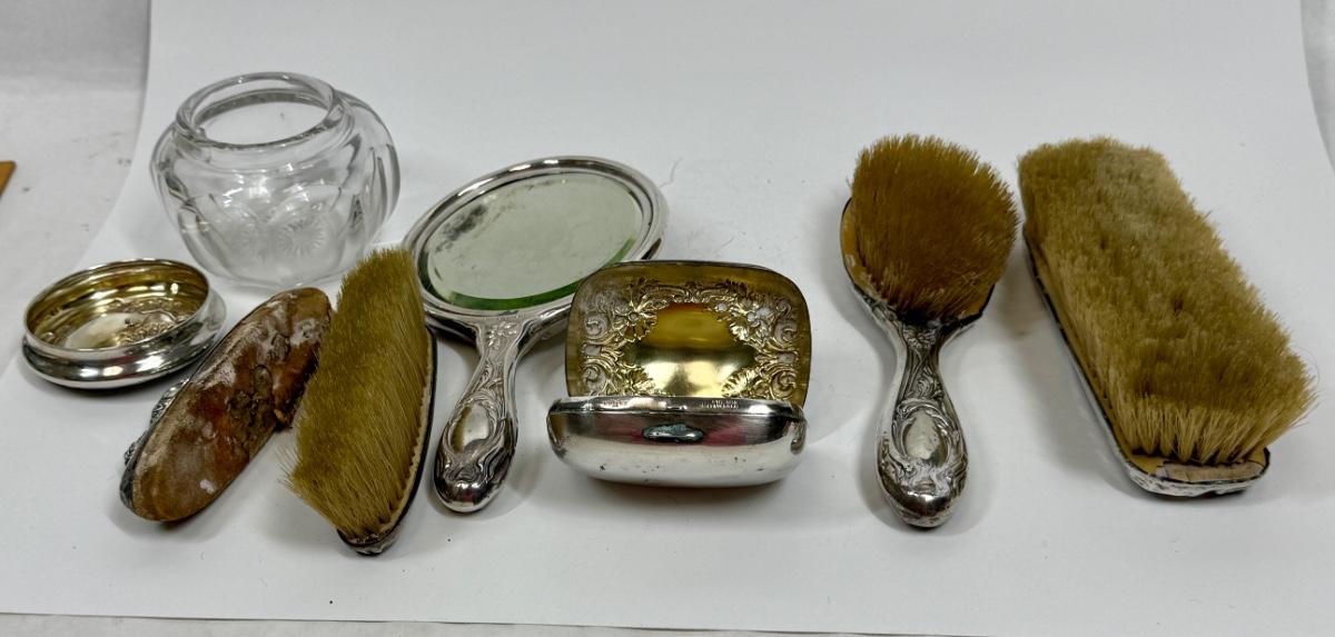 In fair to good condition - there are dings and dents, and some deterioration of nail buffer pad, mirror clarity which is normal for the age of the pieces.. See photos for condition. All pieces are marked Sterling except for jar lid, but it looks like the other pieces. Total Weight for all pieces except glass jar is 782g.