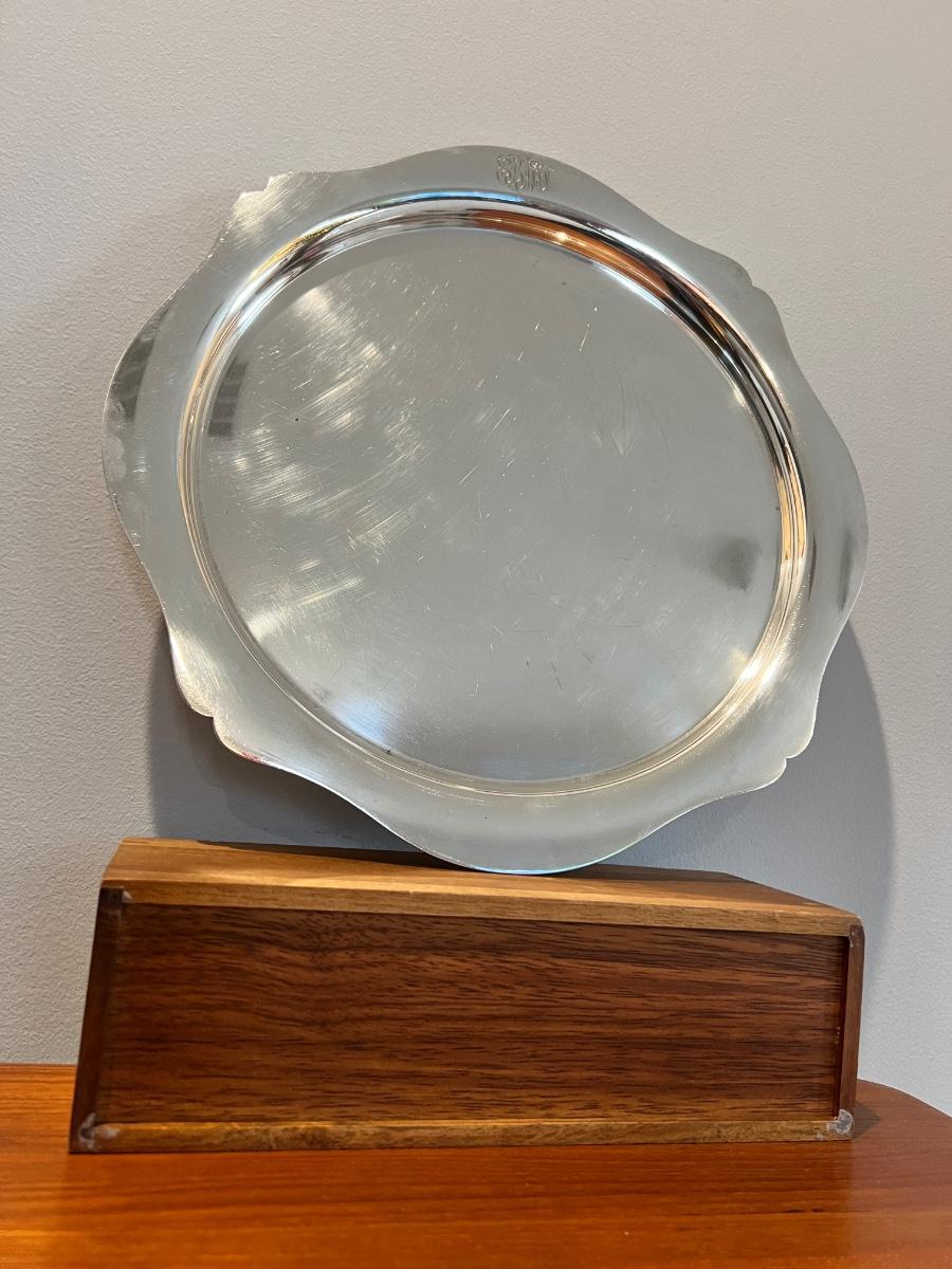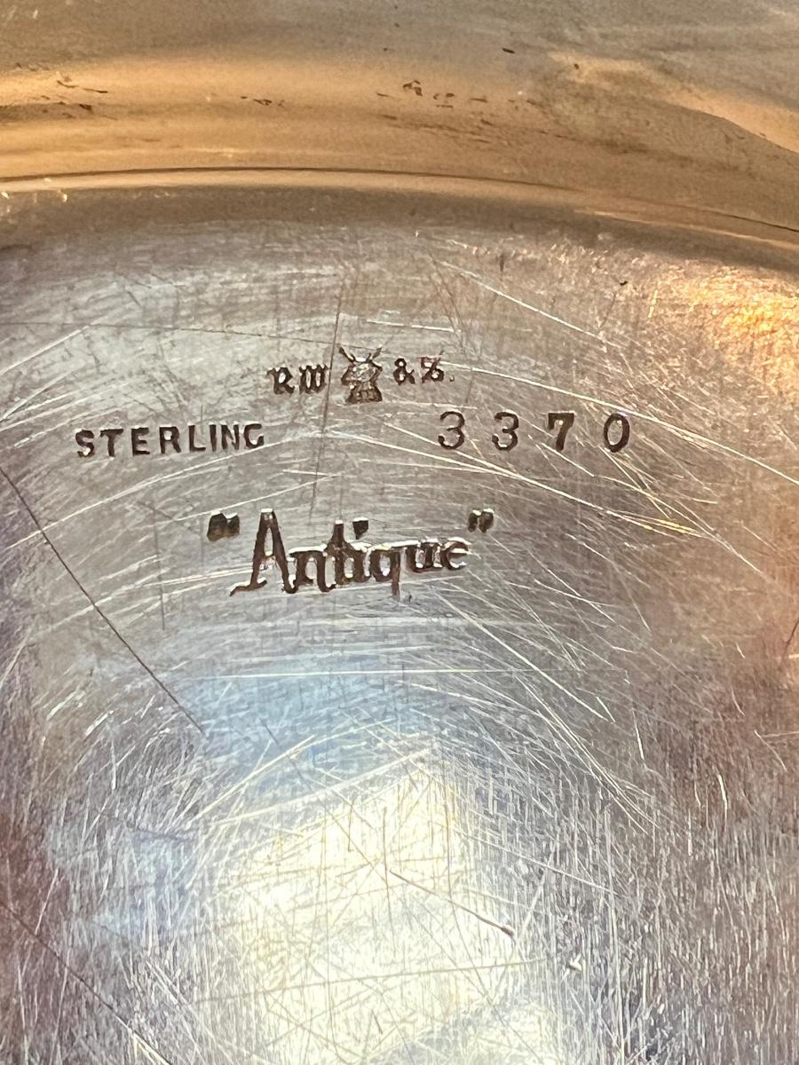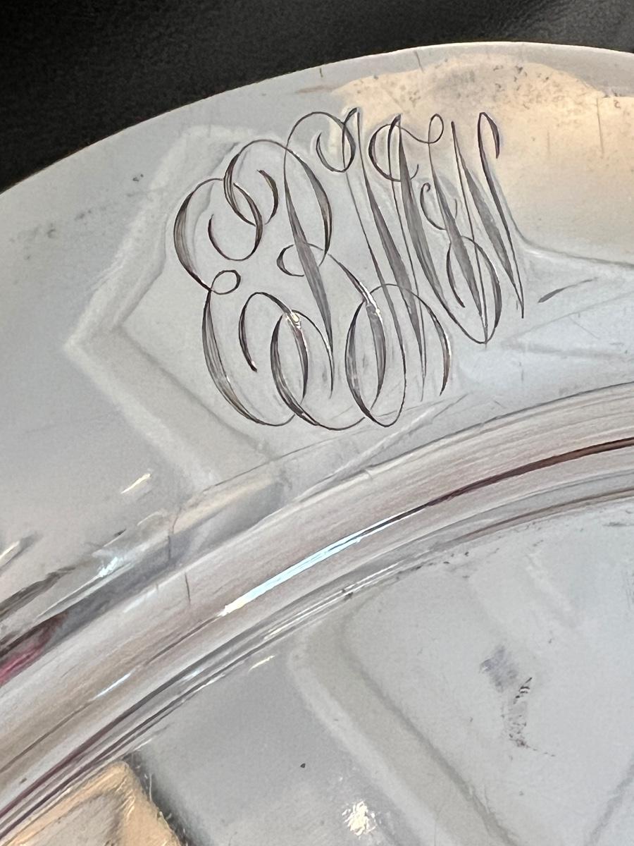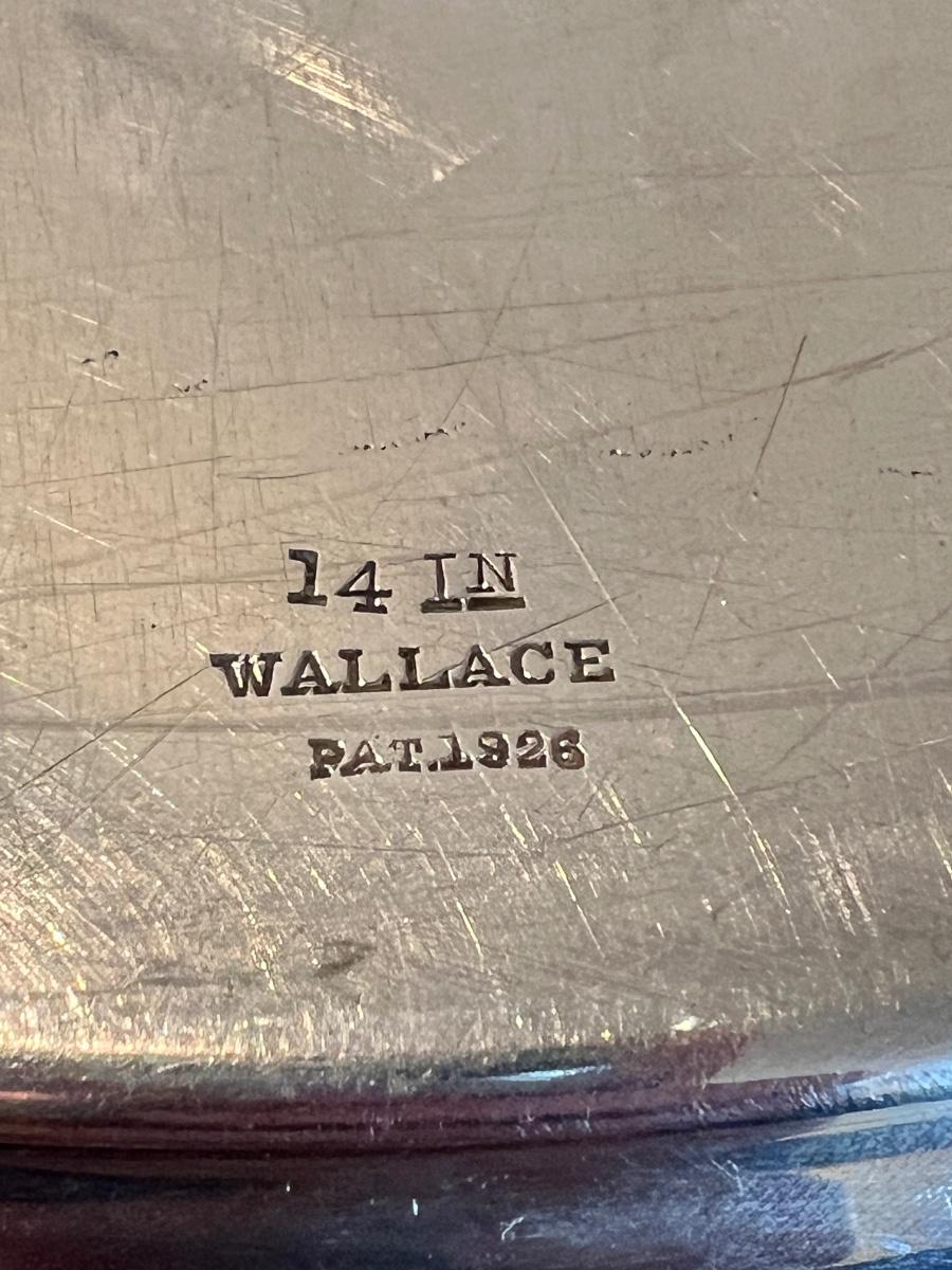 14” diameter antique Wallace sterling silver tray in pattern “1926” weighing 1,310 grams. Engraved with monogram.
