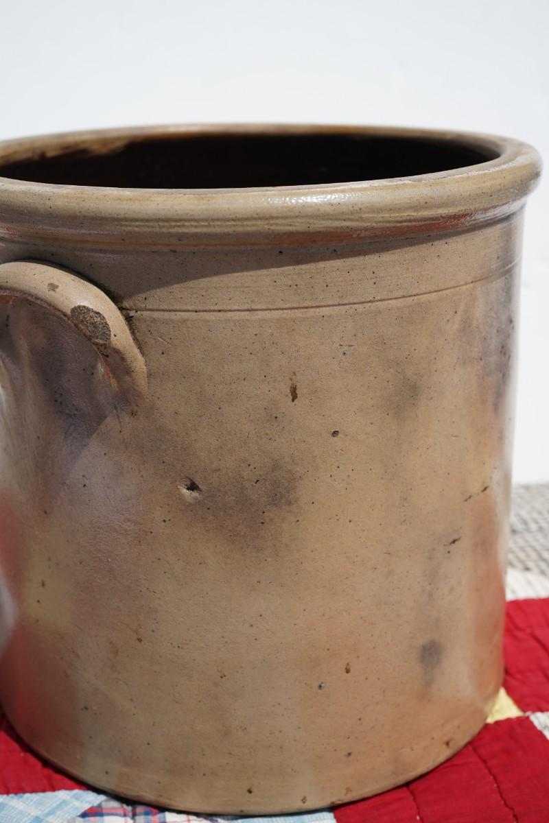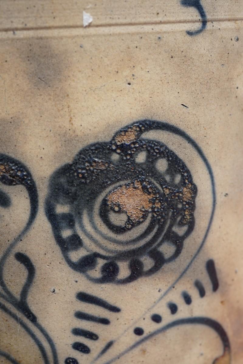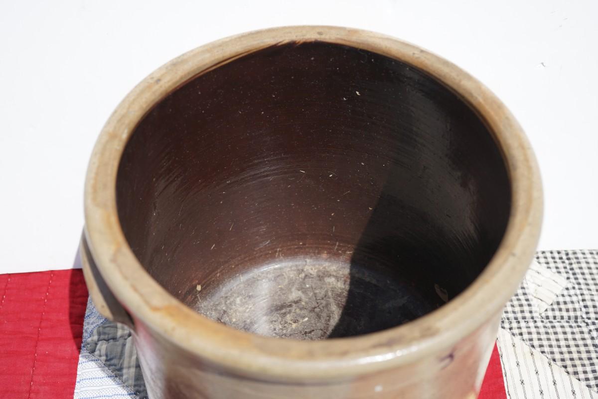 Early 19th century blue decorated crock with applied handles. hand decorated in cobalt blue flower.
