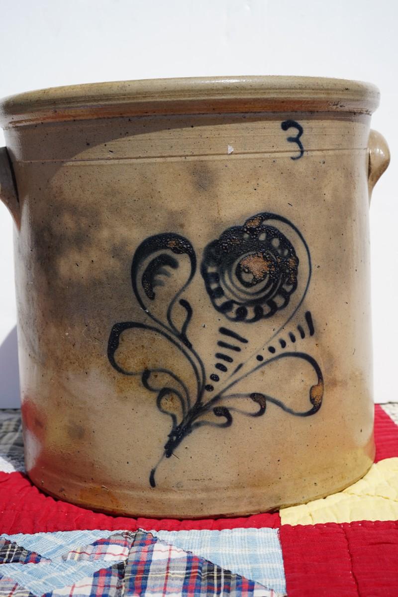 ANTIQUE STONEWARE # 3 GALLON BLUE DECORATED W/FLOWER NEW ENGLAND CROCK