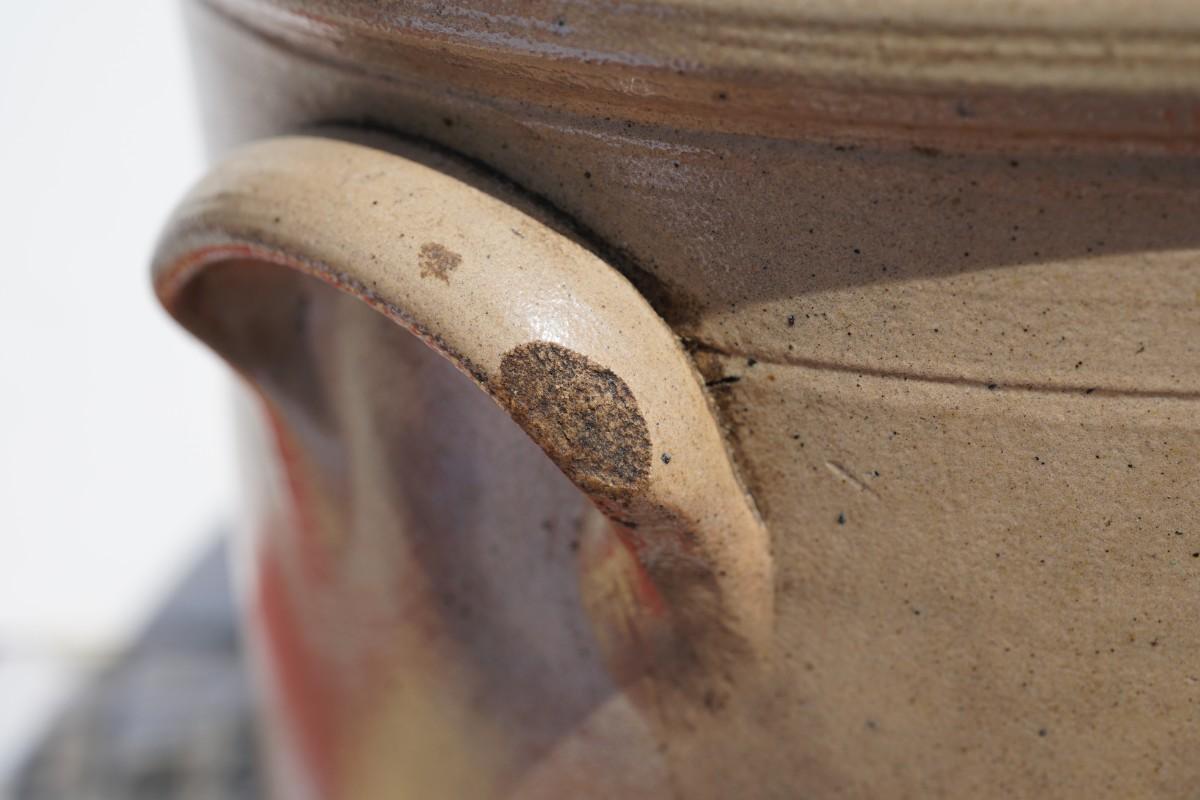 chip on handle. surface chips on the front by the flower. also severe staining to the glaze