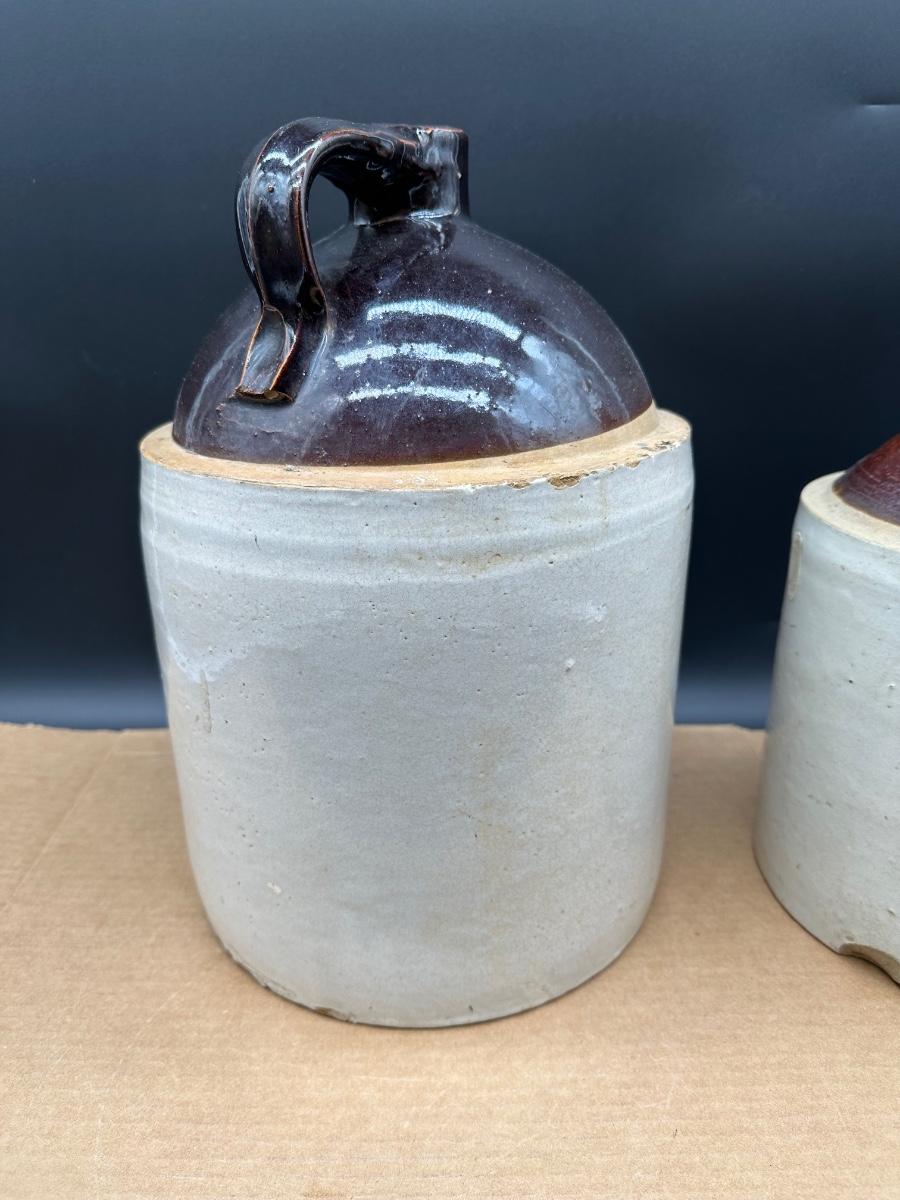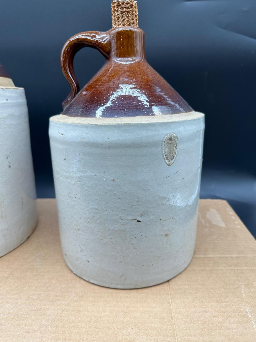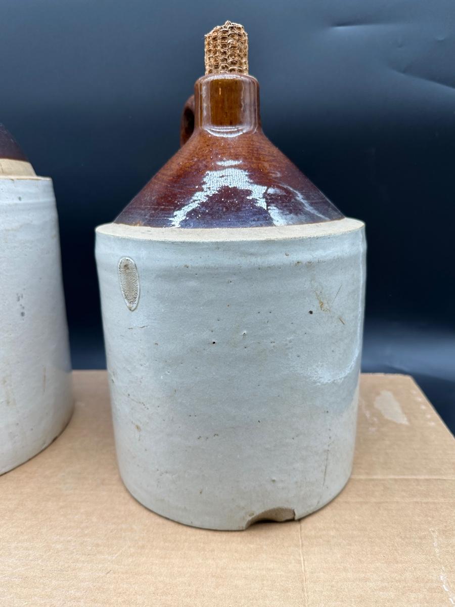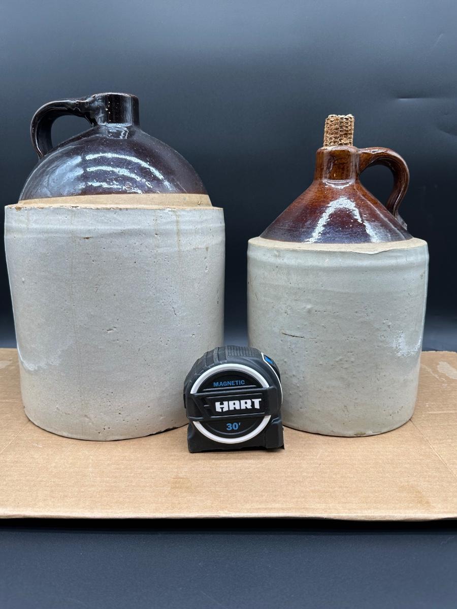 Both show hand-thrown characteristics, kiln firing marks, and natural glaze variations consistent with late 19th to early 20th century utilitarian stoneware used for whiskey, moonshine, or general storage.