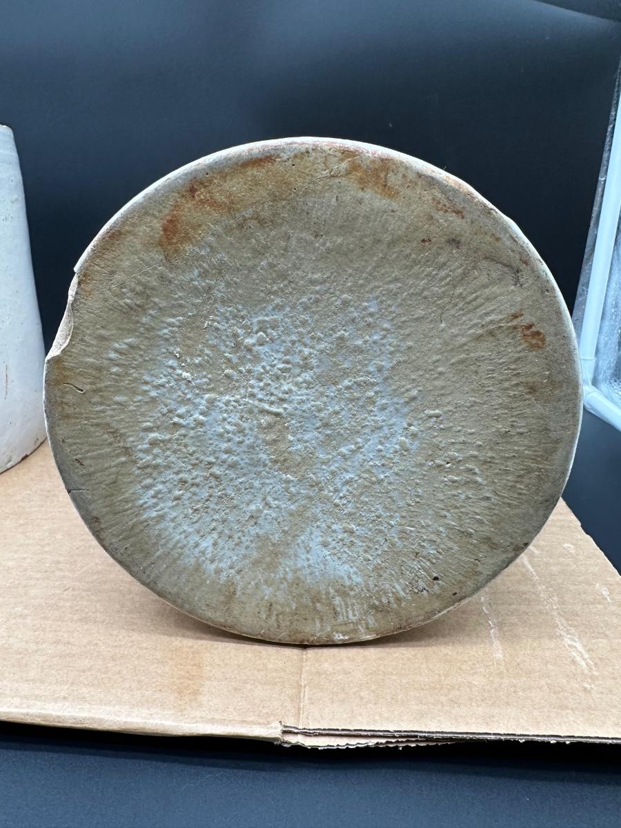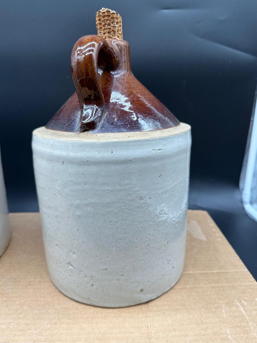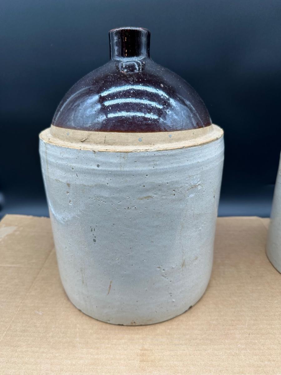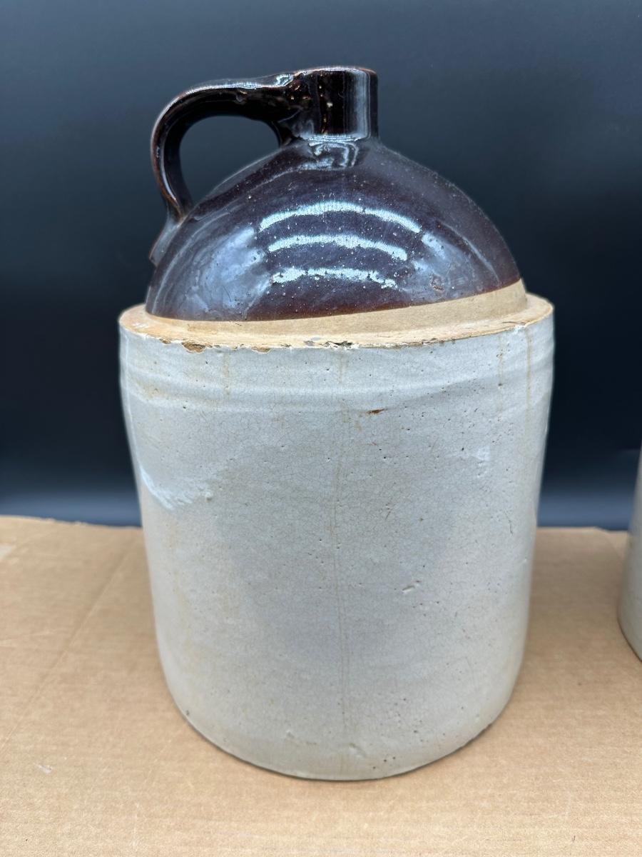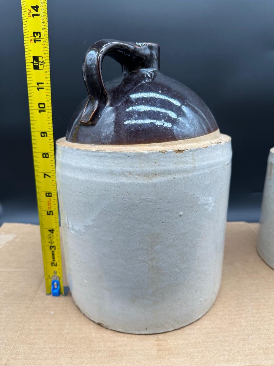 Both show hand-thrown characteristics, kiln firing marks, and natural glaze variations consistent with late 19th to early 20th century utilitarian stoneware used for whiskey, moonshine, or general storage.