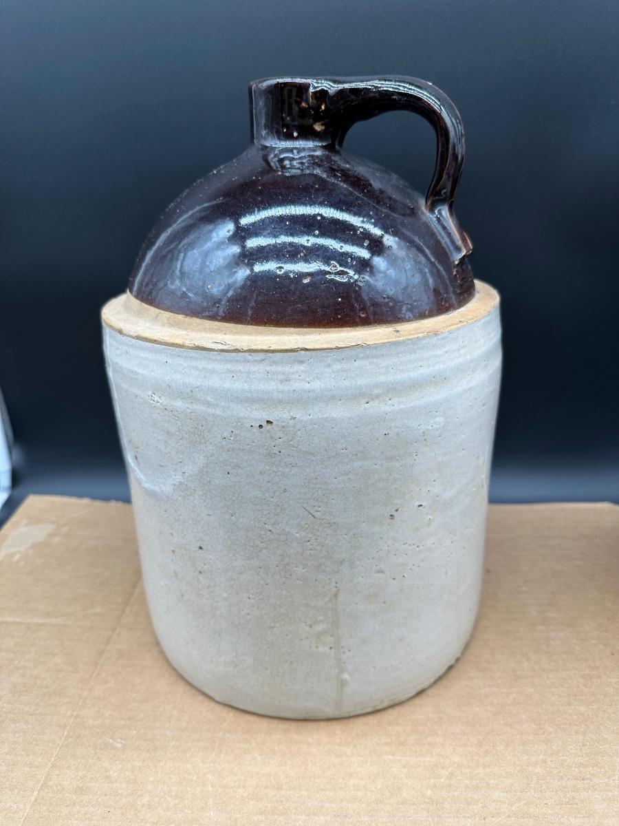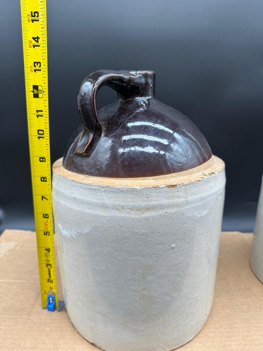 Antique Stoneware Whiskey Jugs – Salt Glaze – Brown Top – Pair