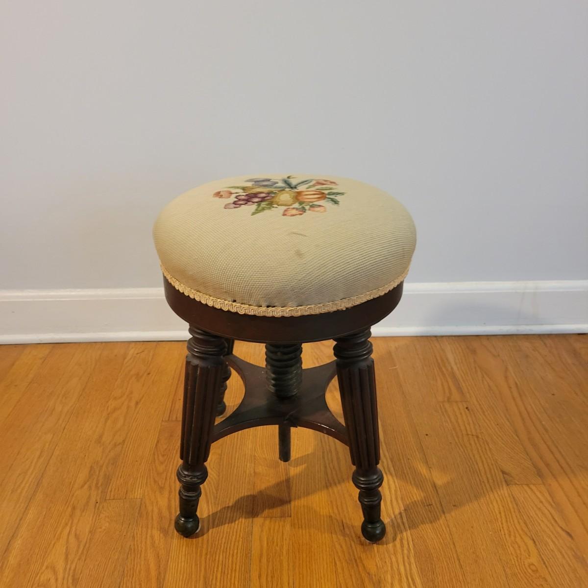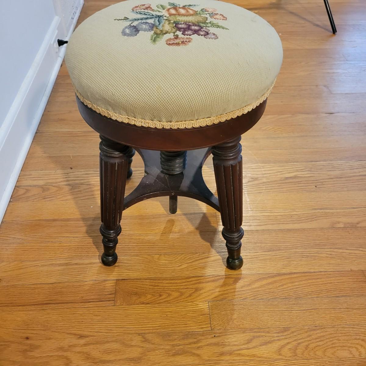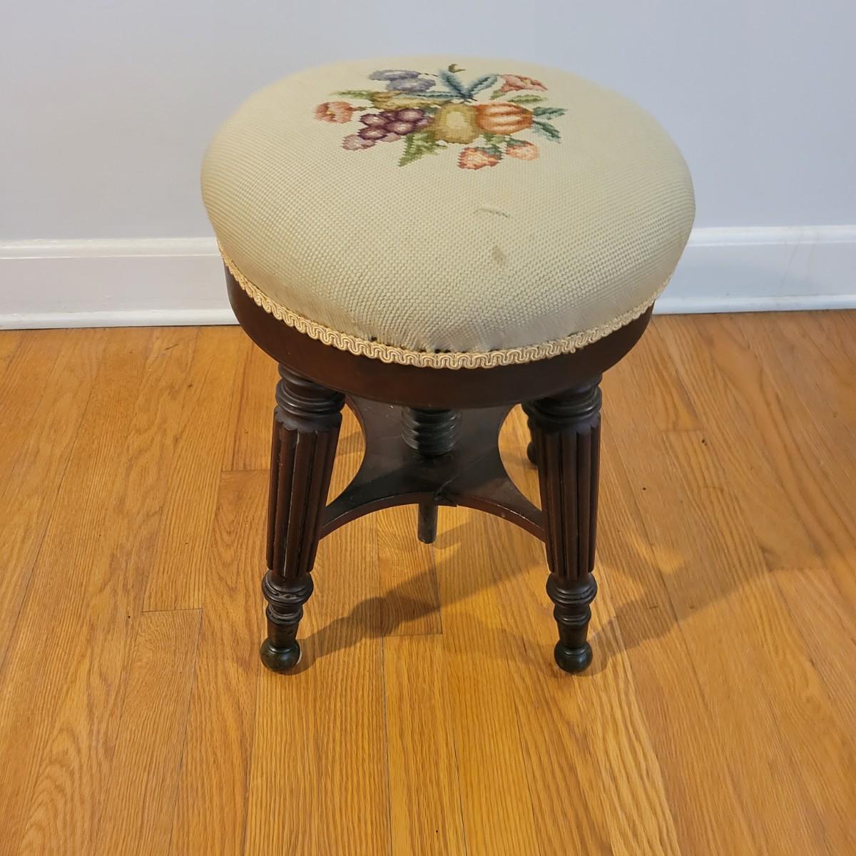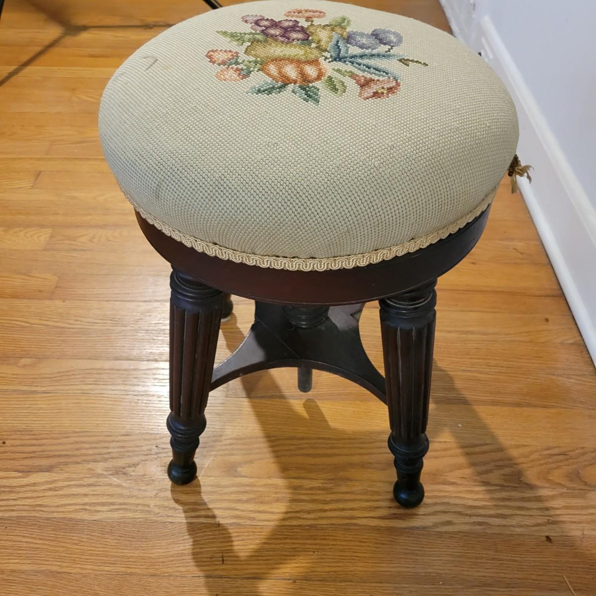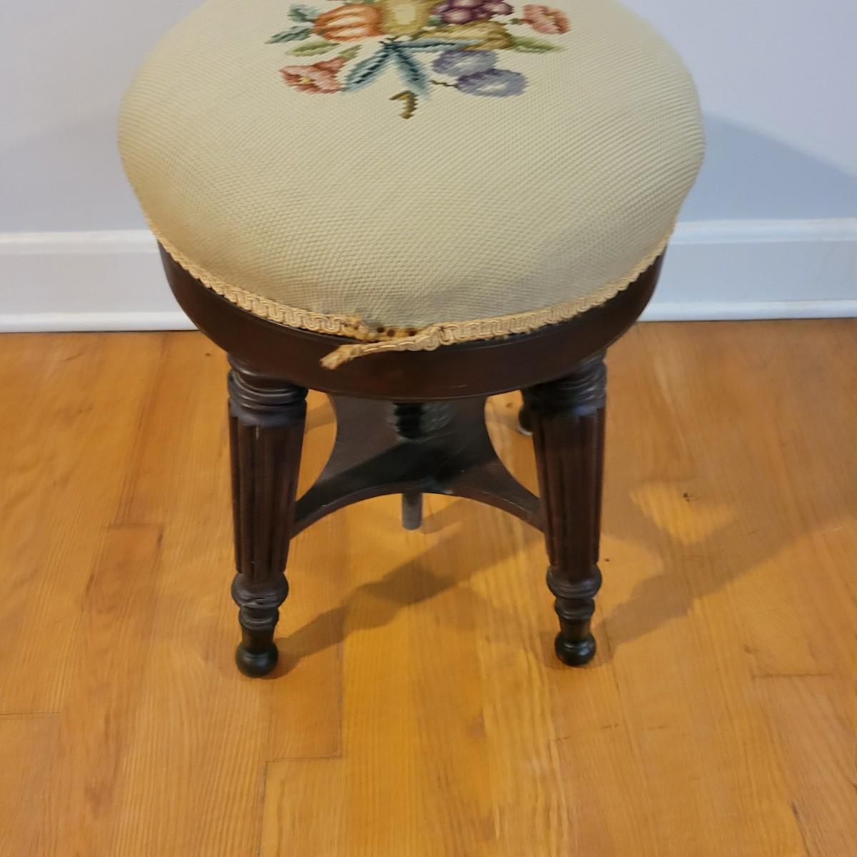 A unique antique stool with a needle point cover. Stool is in good/fair condition, as it is showing its age in a few areas. There is a loose thread in the needle point along with a small stain and a loose piece of trim. The wood frame also shows some damage in a few areas, see attached pictures for more detail. Stool measures approximately 14" x 18". This is the original stool that came with the Box piano later in the sale. Local pickup only.