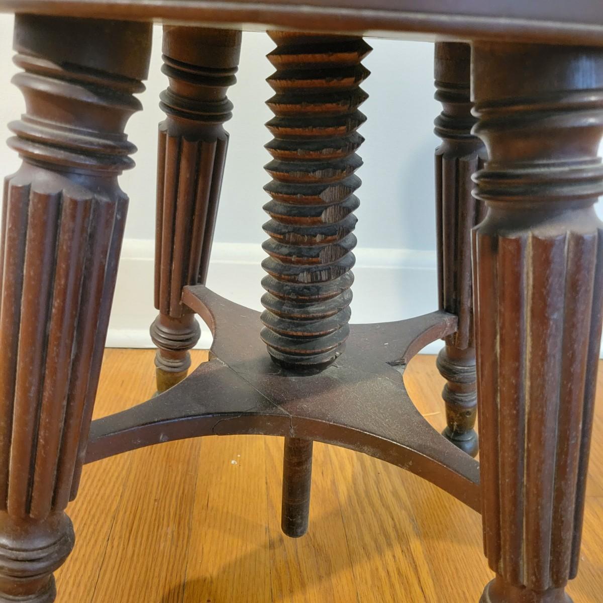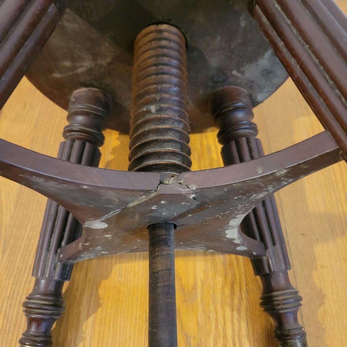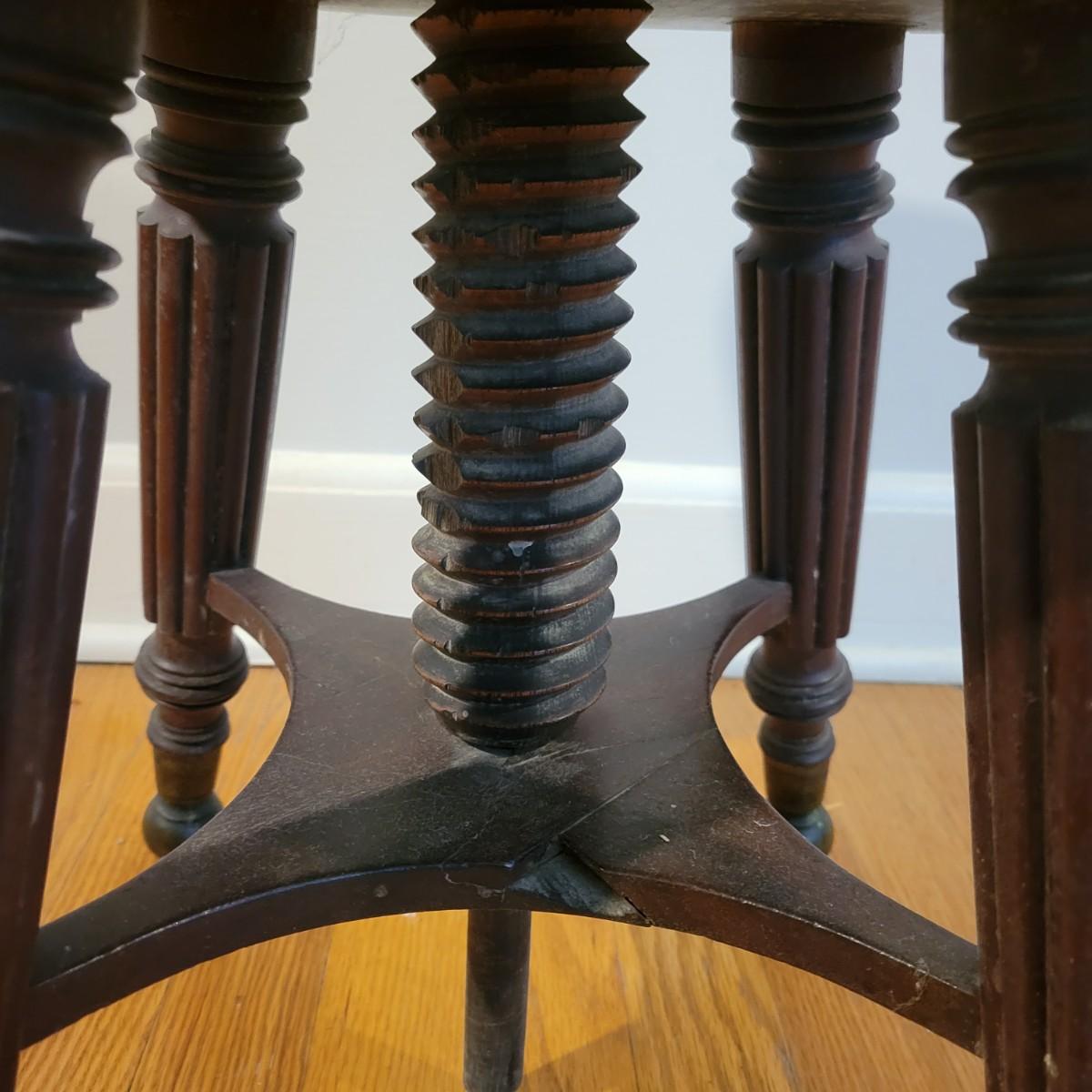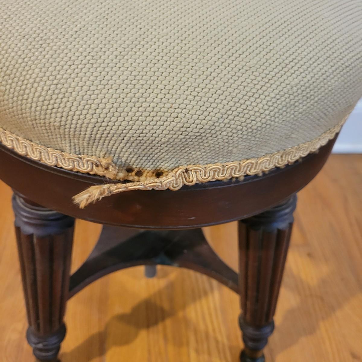 A unique antique stool with a needle point cover. Stool is in good/fair condition, as it is showing its age in a few areas. There is a loose thread in the needle point along with a small stain and a loose piece of trim. The wood frame also shows some damage in a few areas, see attached pictures for more detail. Stool measures approximately 14" x 18". This is the original stool that came with the Box piano later in the sale. Local pickup only.