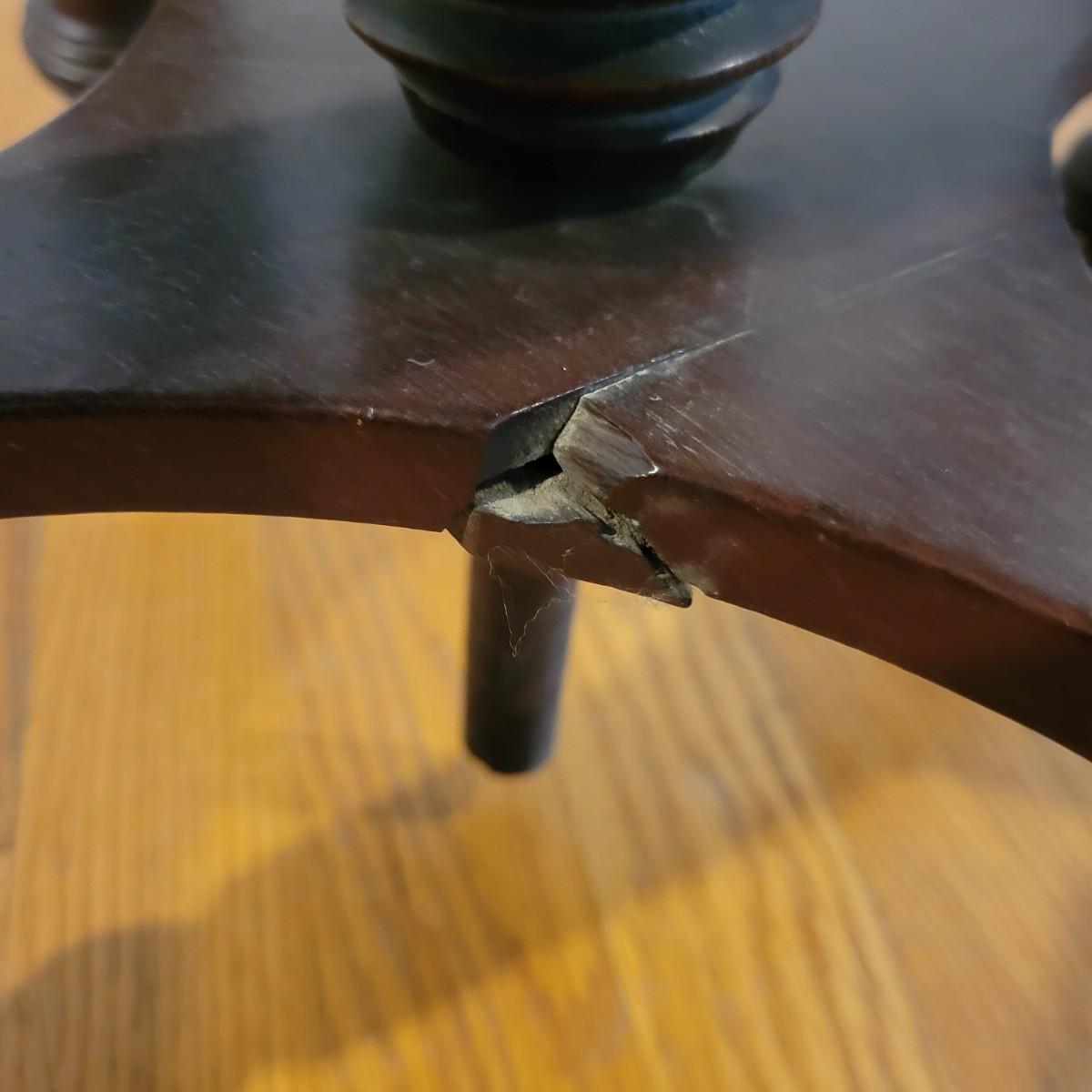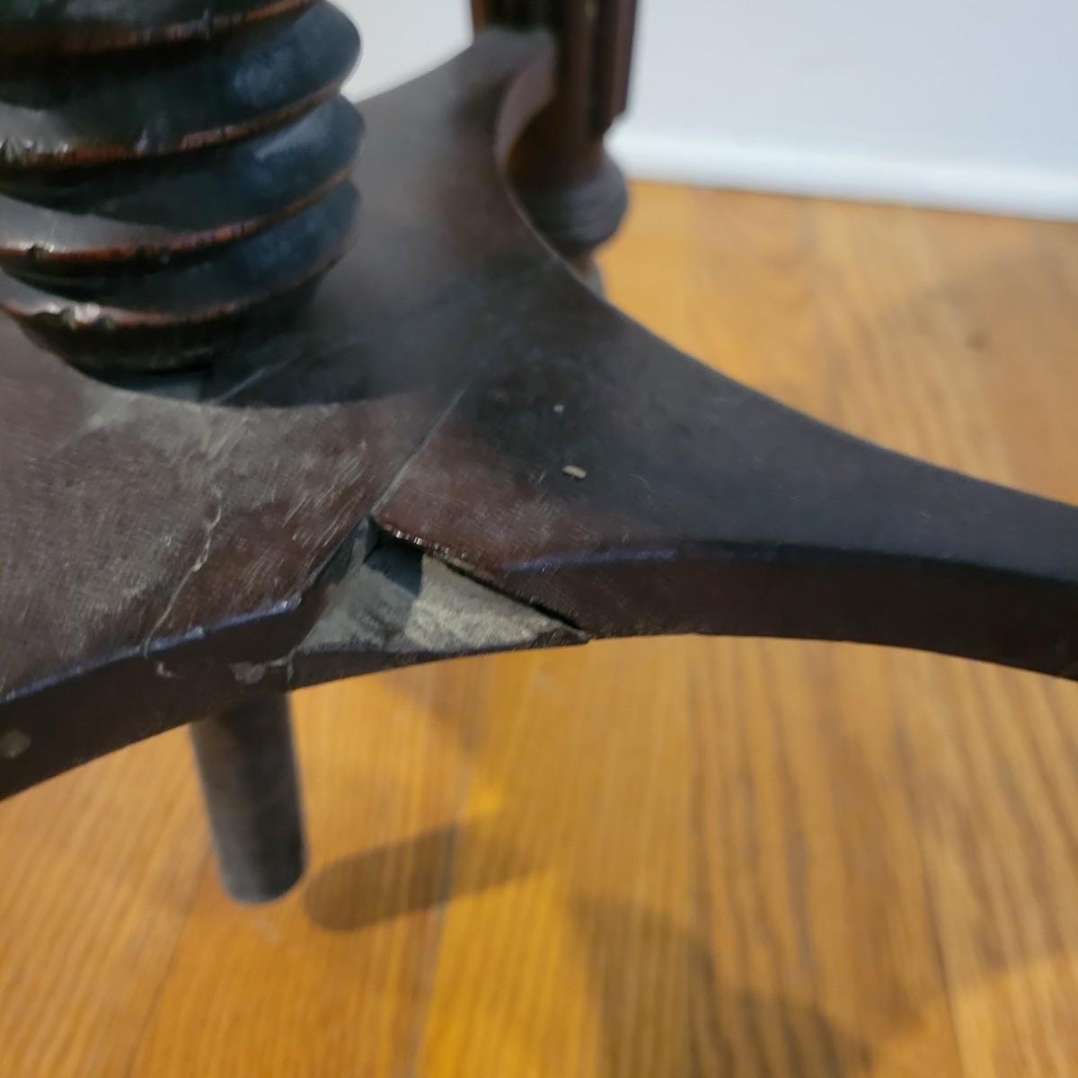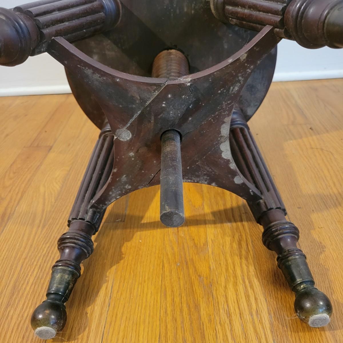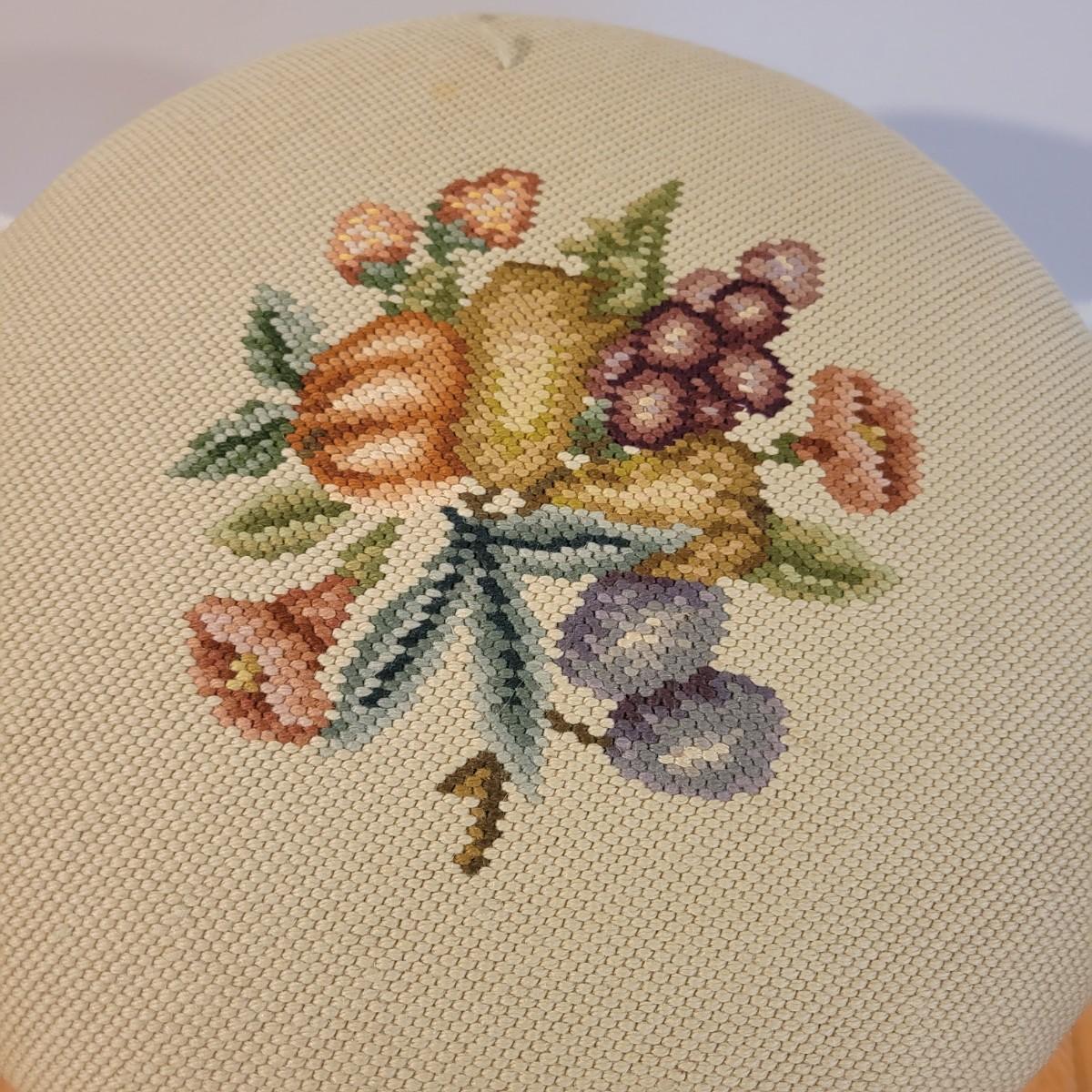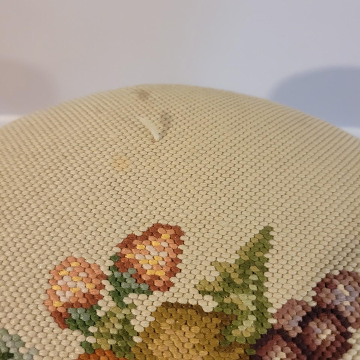 A unique antique stool with a needle point cover. Stool is in good/fair condition, as it is showing its age in a few areas. There is a loose thread in the needle point along with a small stain and a loose piece of trim. The wood frame also shows some damage in a few areas, see attached pictures for more detail. Stool measures approximately 14" x 18". This is the original stool that came with the Box piano later in the sale. Local pickup only.