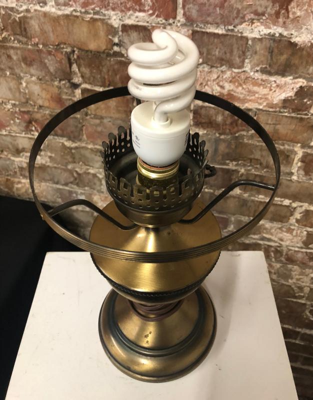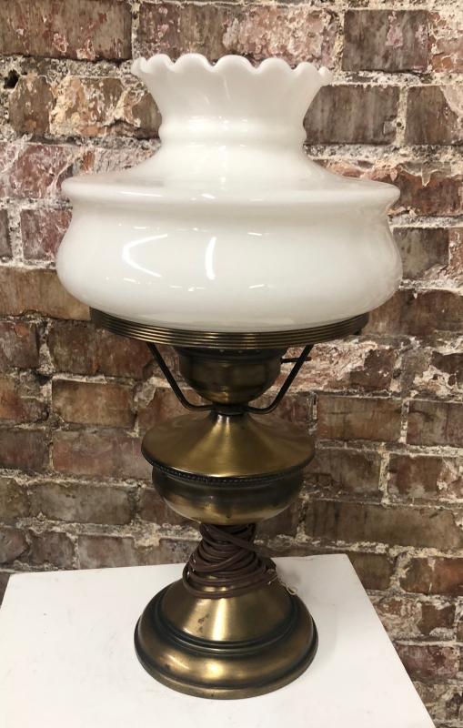 Here is an antique style brass table lamp with milk glass shade...17" tall..Good condition...