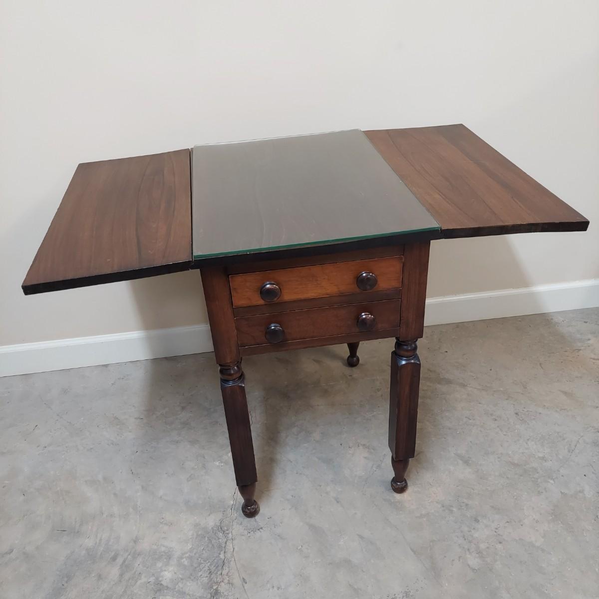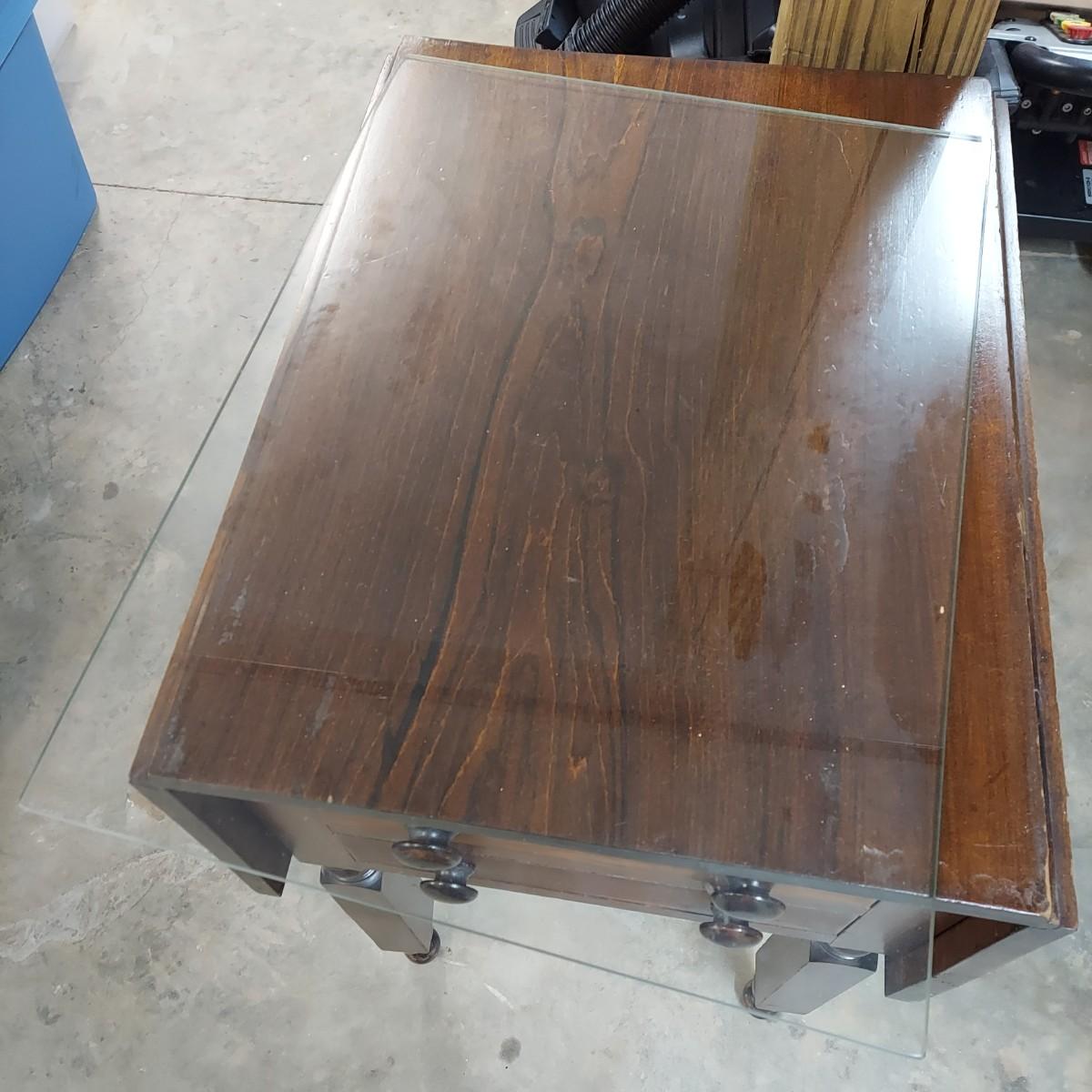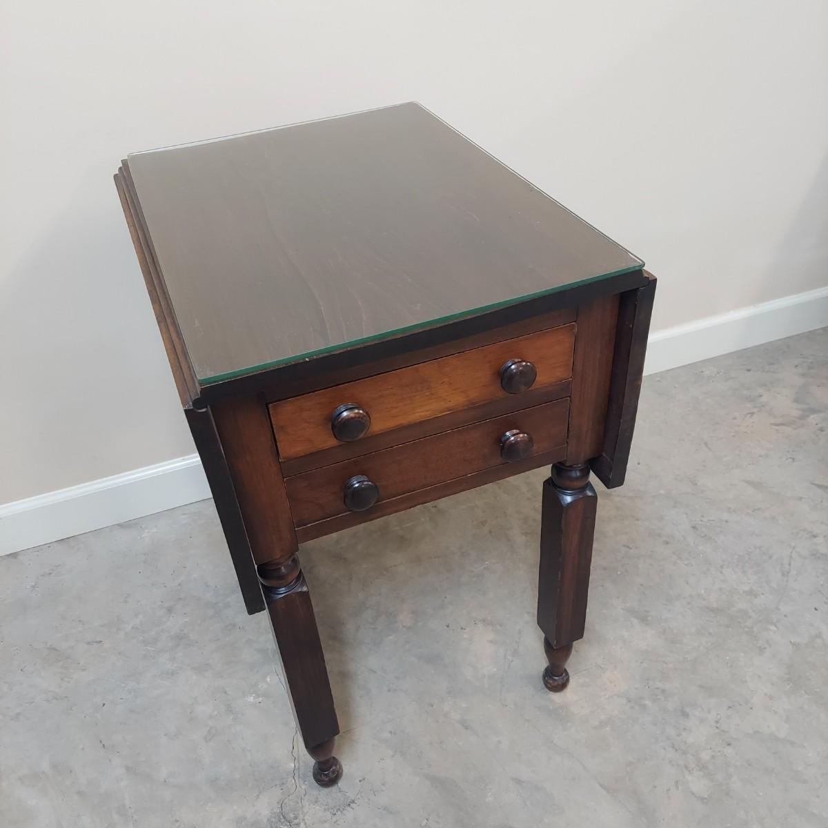 Small antique style side table with drop leaf top. Has a piece of glass that fits the top center. The top is completely loose from the base. Table measures 18.5” x 23” x 29”H with leafs down. Each leaf adds 11”. Please see photos for details. Local Pickup Only.