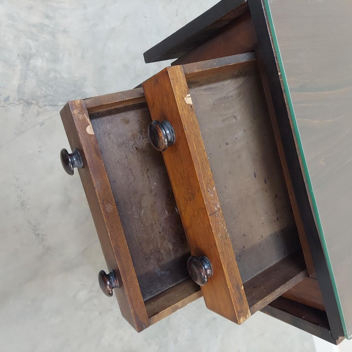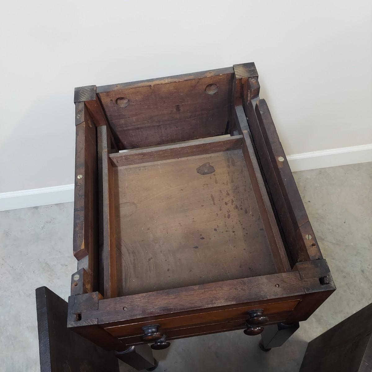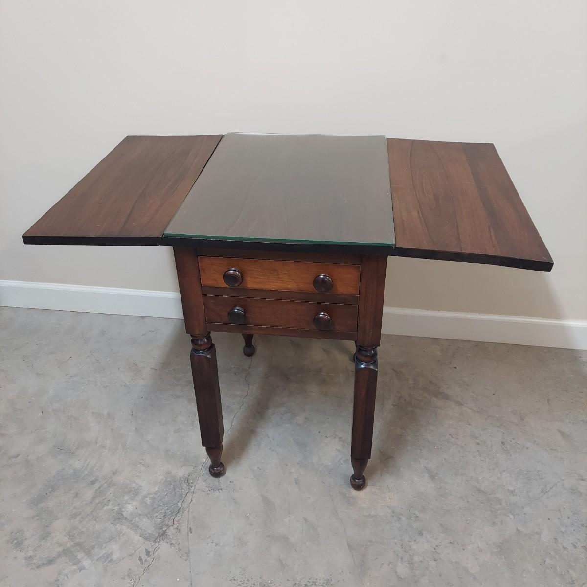 Small antique style side table with drop leaf top. Has a piece of glass that fits the top center. The top is completely loose from the base. Table measures 18.5” x 23” x 29”H with leafs down. Each leaf adds 11”. Please see photos for details. Local Pickup Only.