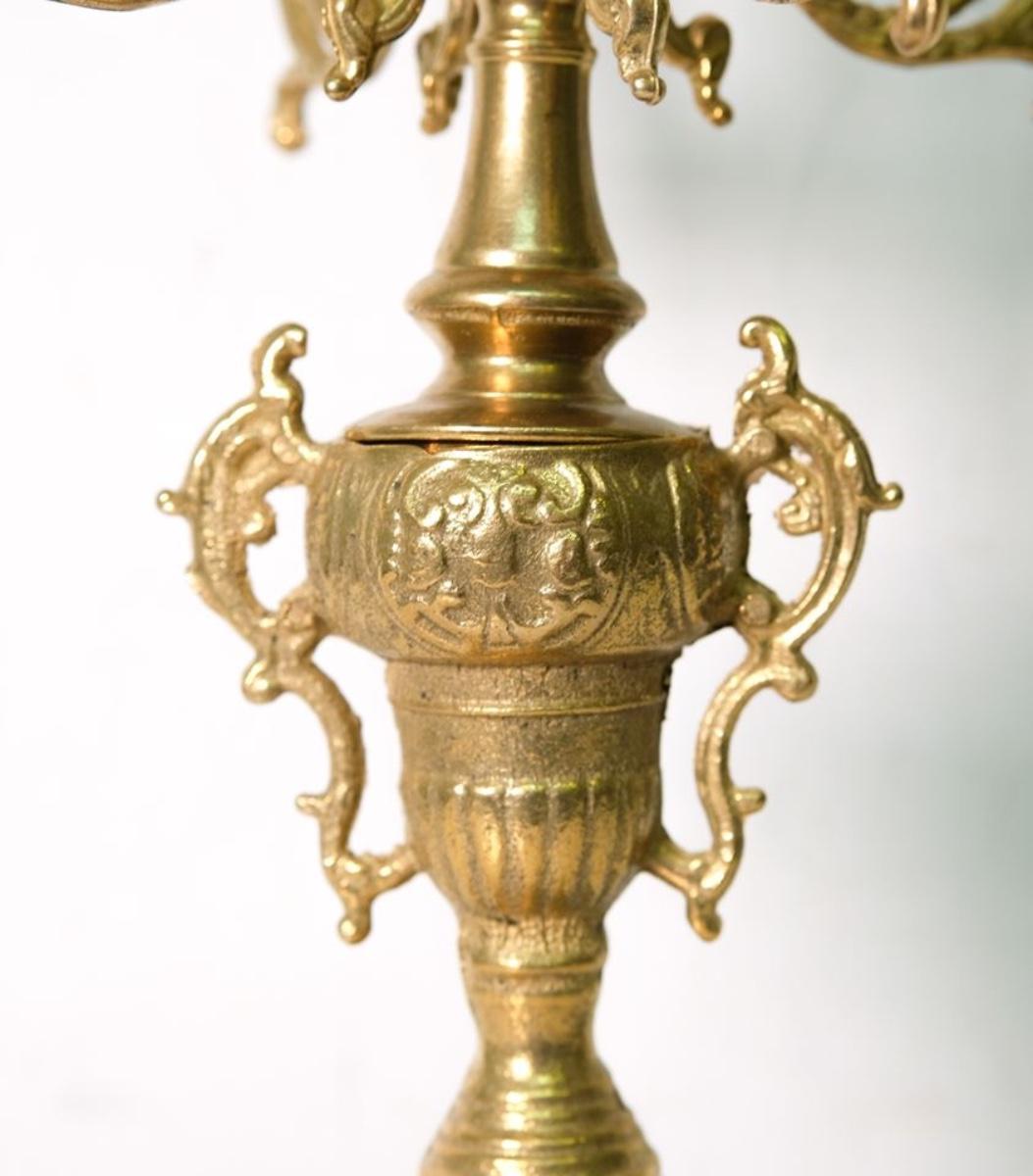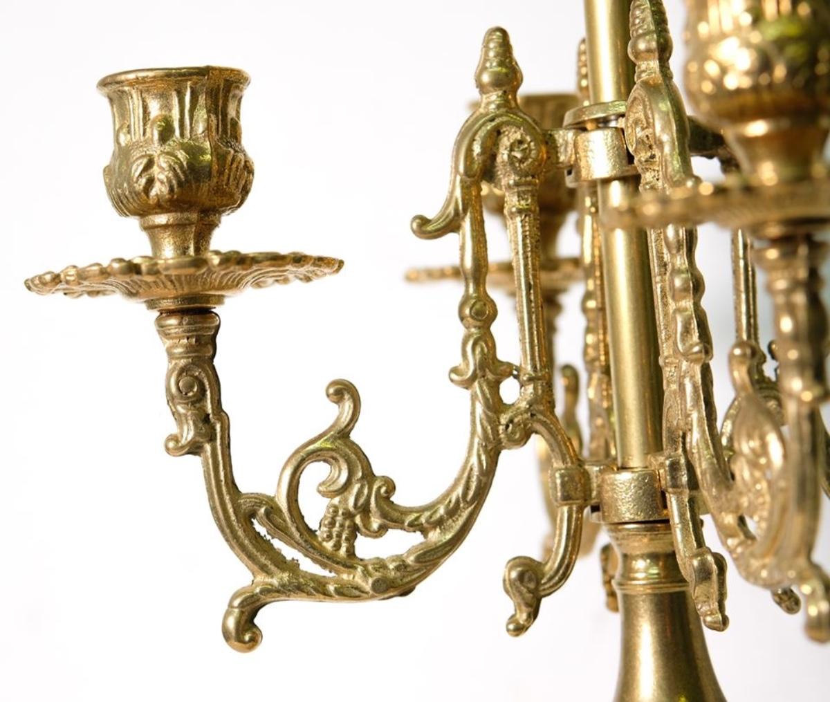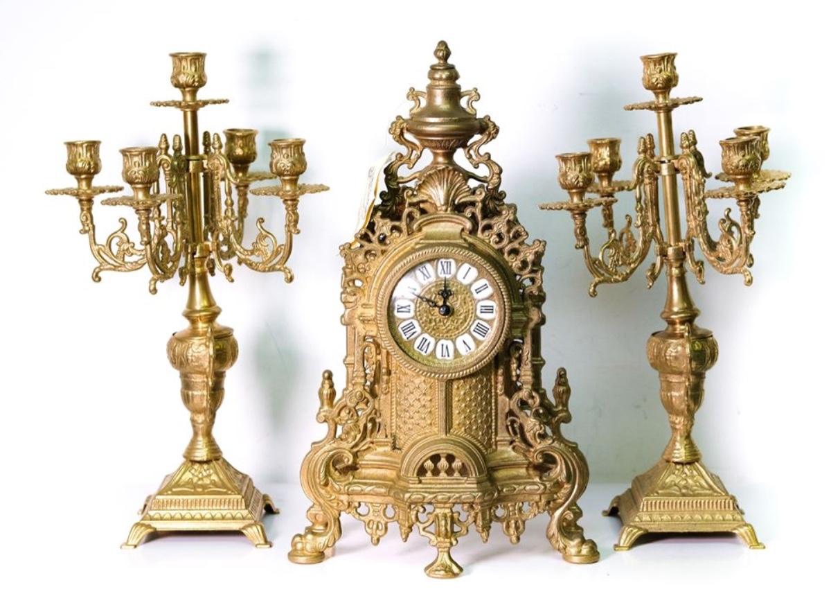 Olympus Solid Brass Mantel Clock with Matching Candelabras in French Gold Finish, Made in Italy with original tag. Clock runs off a 9 volt battery. Candelabras have places for 5 stick candles each. Set includes 1 Mantel clock and 2 candelabras. Clock size is 16 inches high, 10 inches wide. The Candelabras are 15.5 inches high by 8 inches (at the top portion). They are made from solid brass and finished in French Gold.