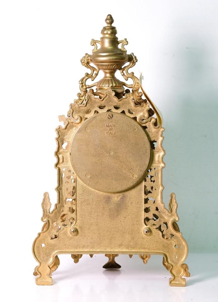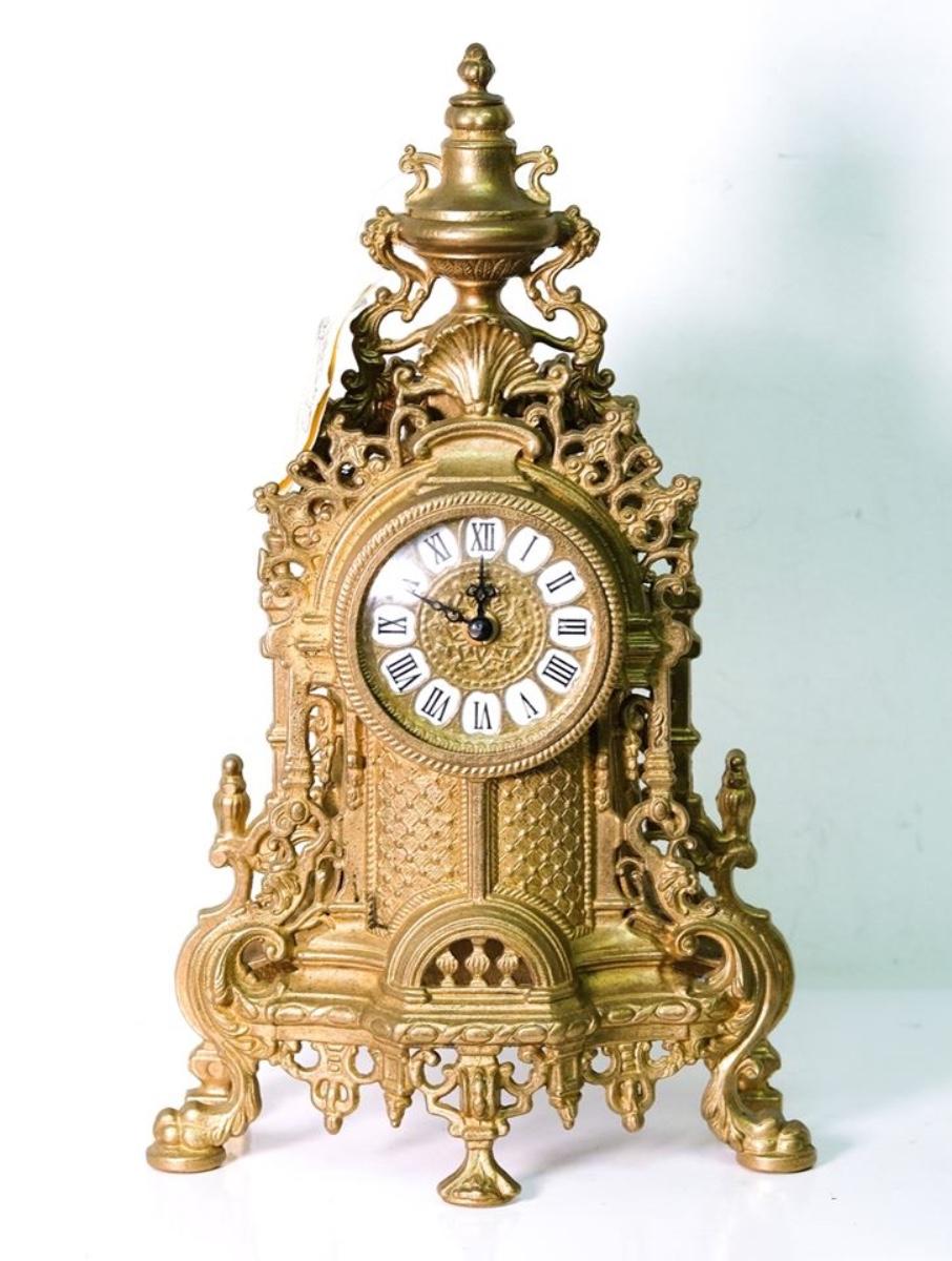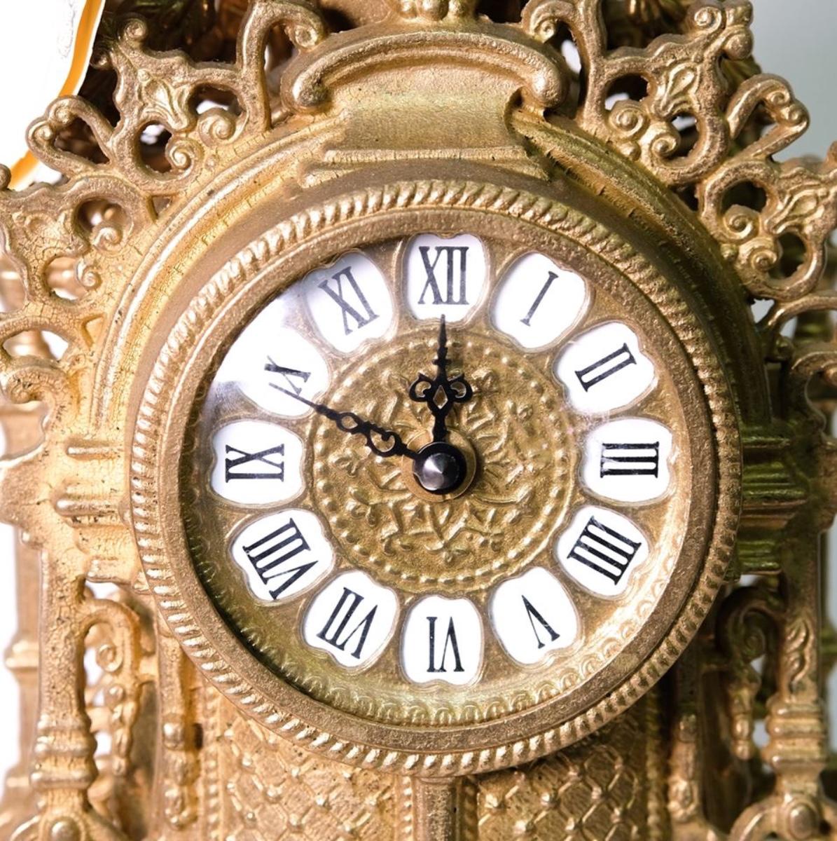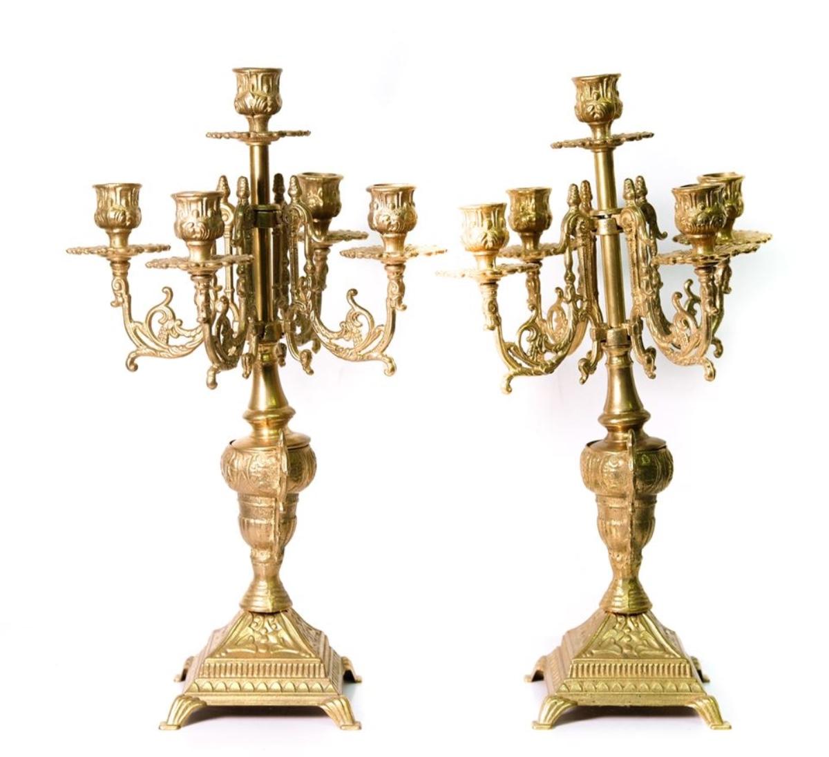 Olympus Solid Brass Mantel Clock with Matching Candelabras in French Gold Finish, Made in Italy with original tag. Clock runs off a 9 volt battery. Candelabras have places for 5 stick candles each. Set includes 1 Mantel clock and 2 candelabras. Clock size is 16 inches high, 10 inches wide. The Candelabras are 15.5 inches high by 8 inches (at the top portion). They are made from solid brass and finished in French Gold.