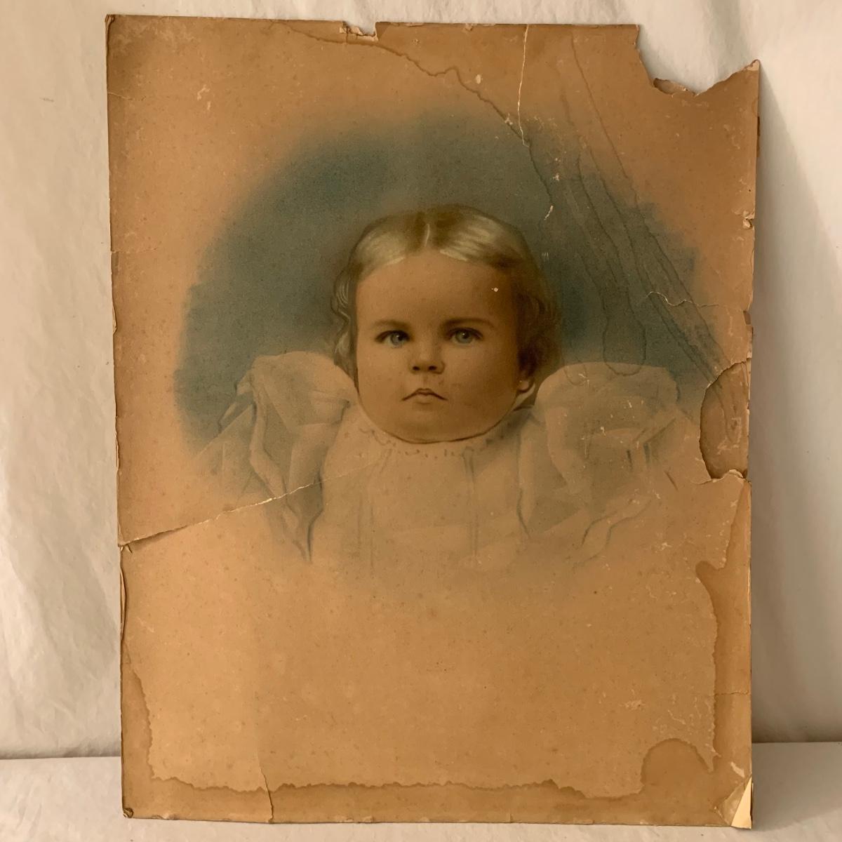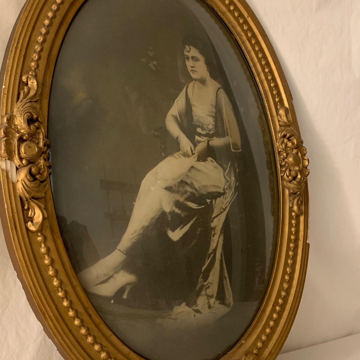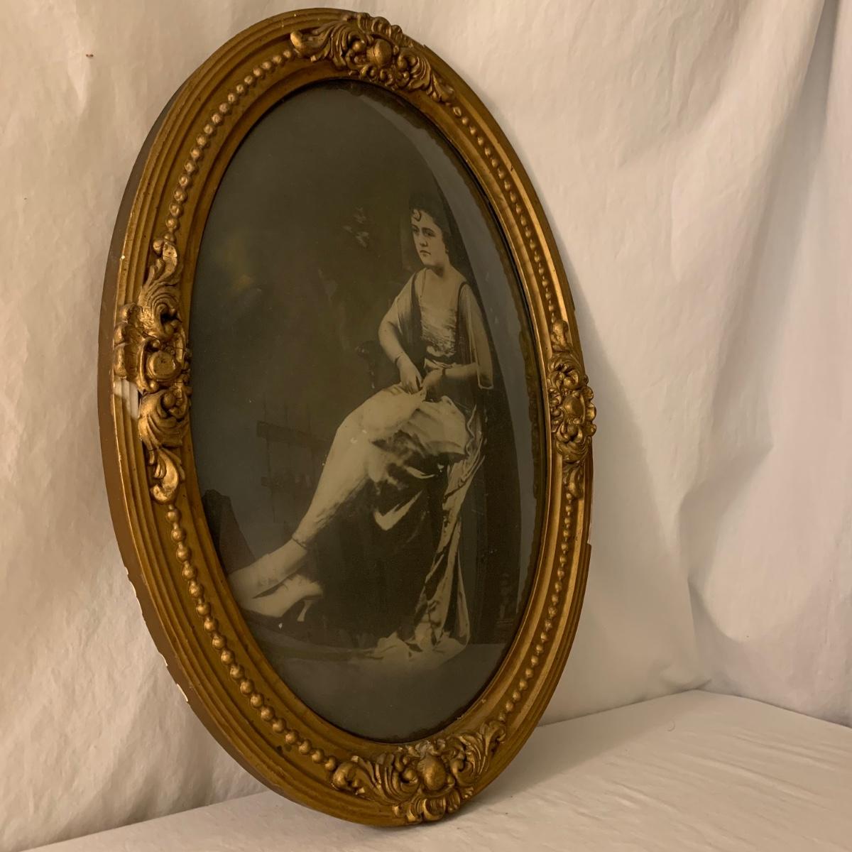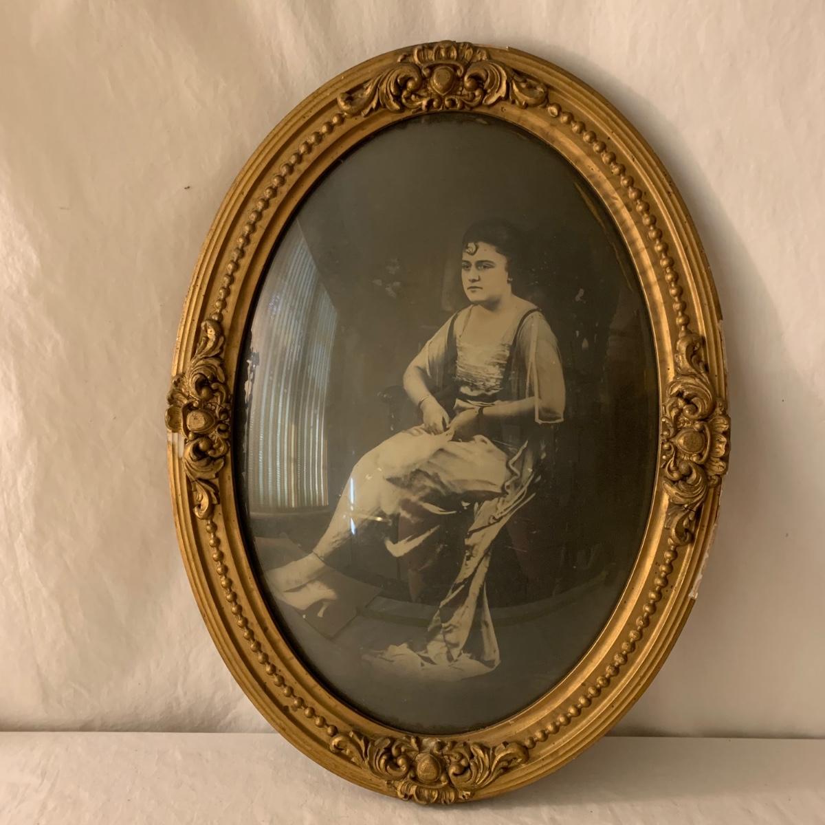 Four antique style photographs, three of which are framed. The large rectangular frame is wood. It measures 19.5” x 1.75” x 23.5”. The frame and photo are in good condition. The oval frame has a convex glass front. It appears to be made of wood with resin accents, painted gold. The frame is in fair condition (see photos), but the photograph is in good condition. The frame measures 17” x 23”. The unframed photo of the baby is 16” x 20”. It is in fair condition with quite torn and water stained edges. The frame with the couple is metal and is in worn, but sturdy condition. It is 3.5” x 4.5”. Shipping available.