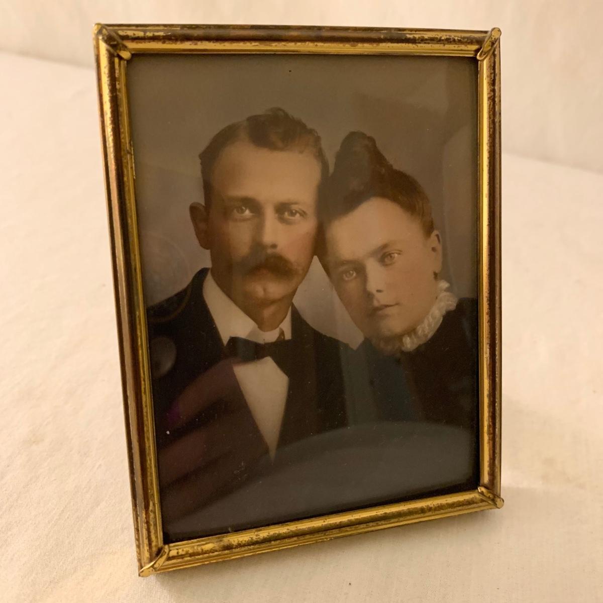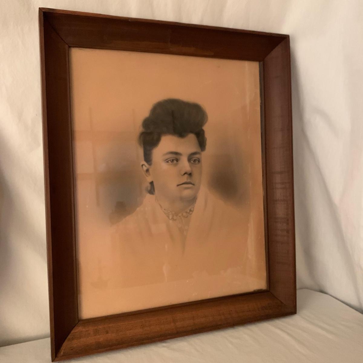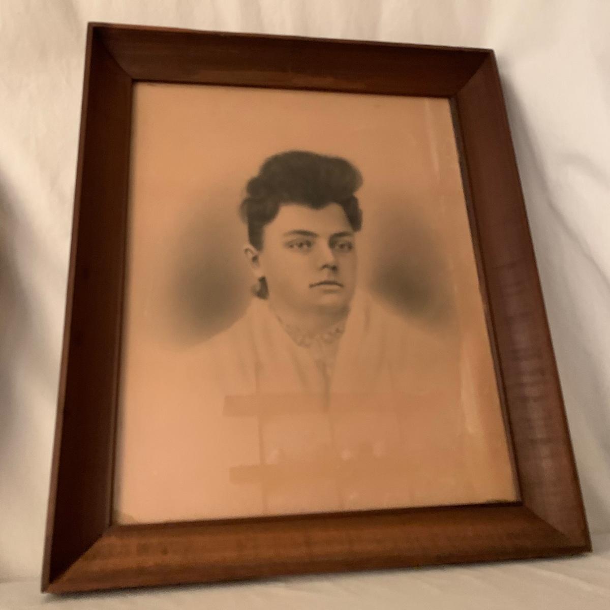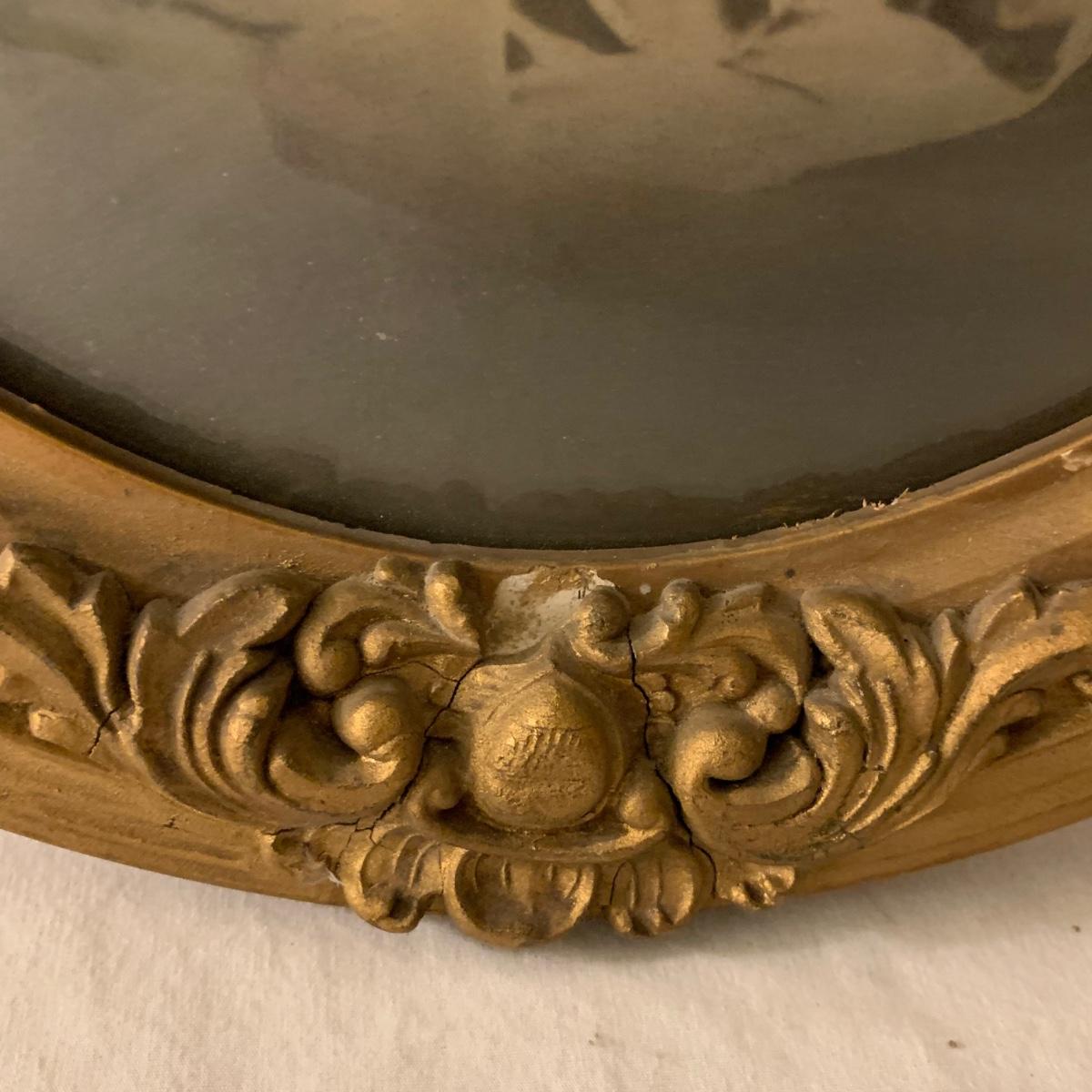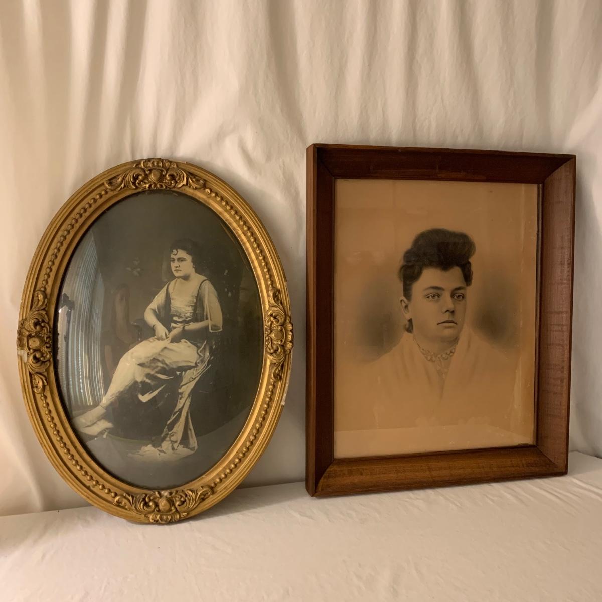 Four antique style photographs, three of which are framed. The large rectangular frame is wood. It measures 19.5” x 1.75” x 23.5”. The frame and photo are in good condition. The oval frame has a convex glass front. It appears to be made of wood with resin accents, painted gold. The frame is in fair condition (see photos), but the photograph is in good condition. The frame measures 17” x 23”. The unframed photo of the baby is 16” x 20”. It is in fair condition with quite torn and water stained edges. The frame with the couple is metal and is in worn, but sturdy condition. It is 3.5” x 4.5”. Shipping available.