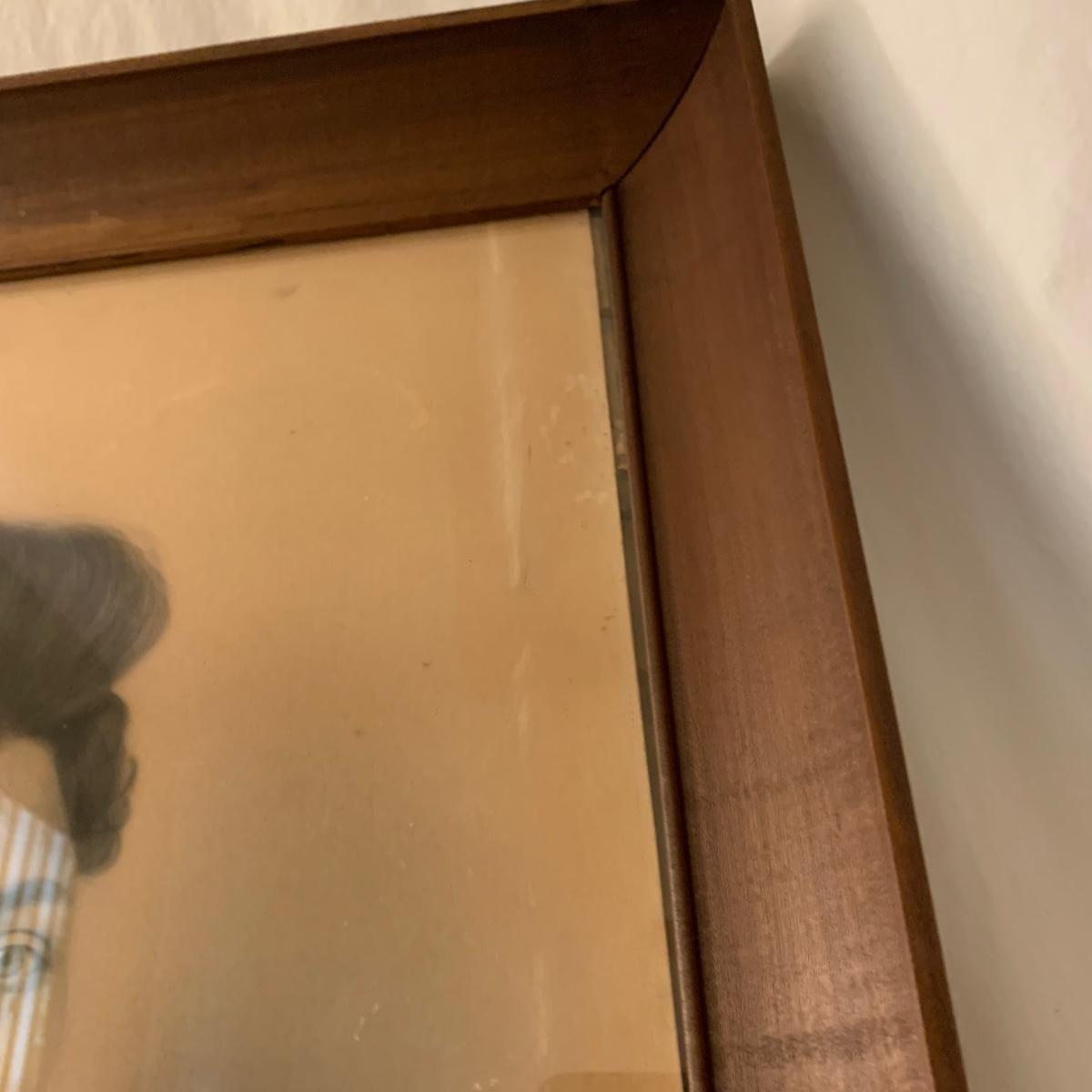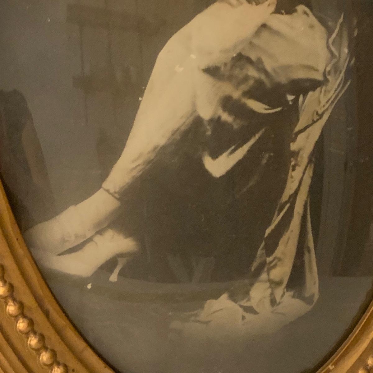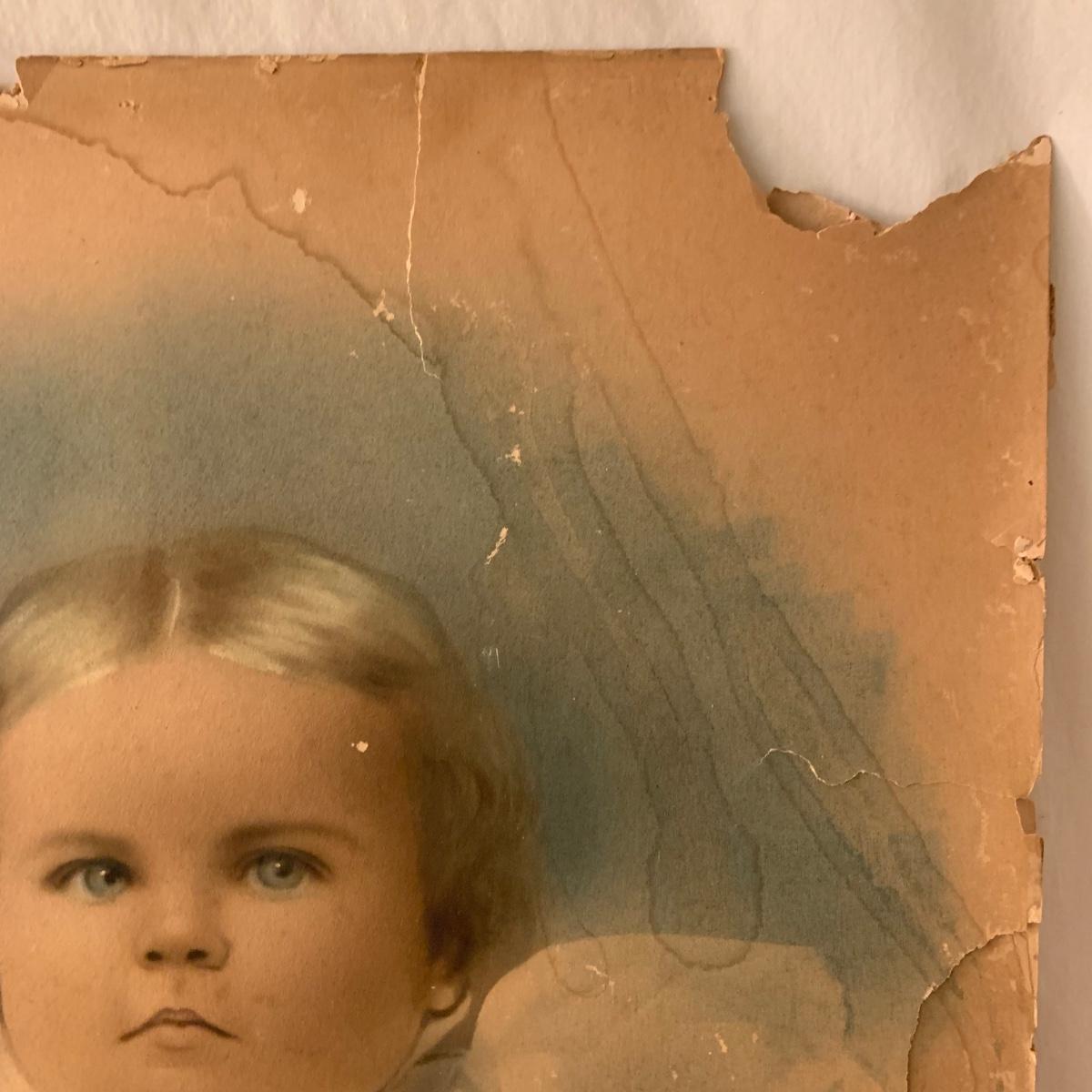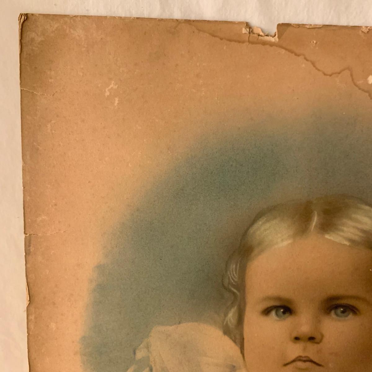Four antique style photographs, three of which are framed. The large rectangular frame is wood. It measures 19.5” x 1.75” x 23.5”. The frame and photo are in good condition. The oval frame has a convex glass front. It appears to be made of wood with resin accents, painted gold. The frame is in fair condition (see photos), but the photograph is in good condition. The frame measures 17” x 23”. The unframed photo of the baby is 16” x 20”. It is in fair condition with quite torn and water stained edges. The frame with the couple is metal and is in worn, but sturdy condition. It is 3.5” x 4.5”. Shipping available.