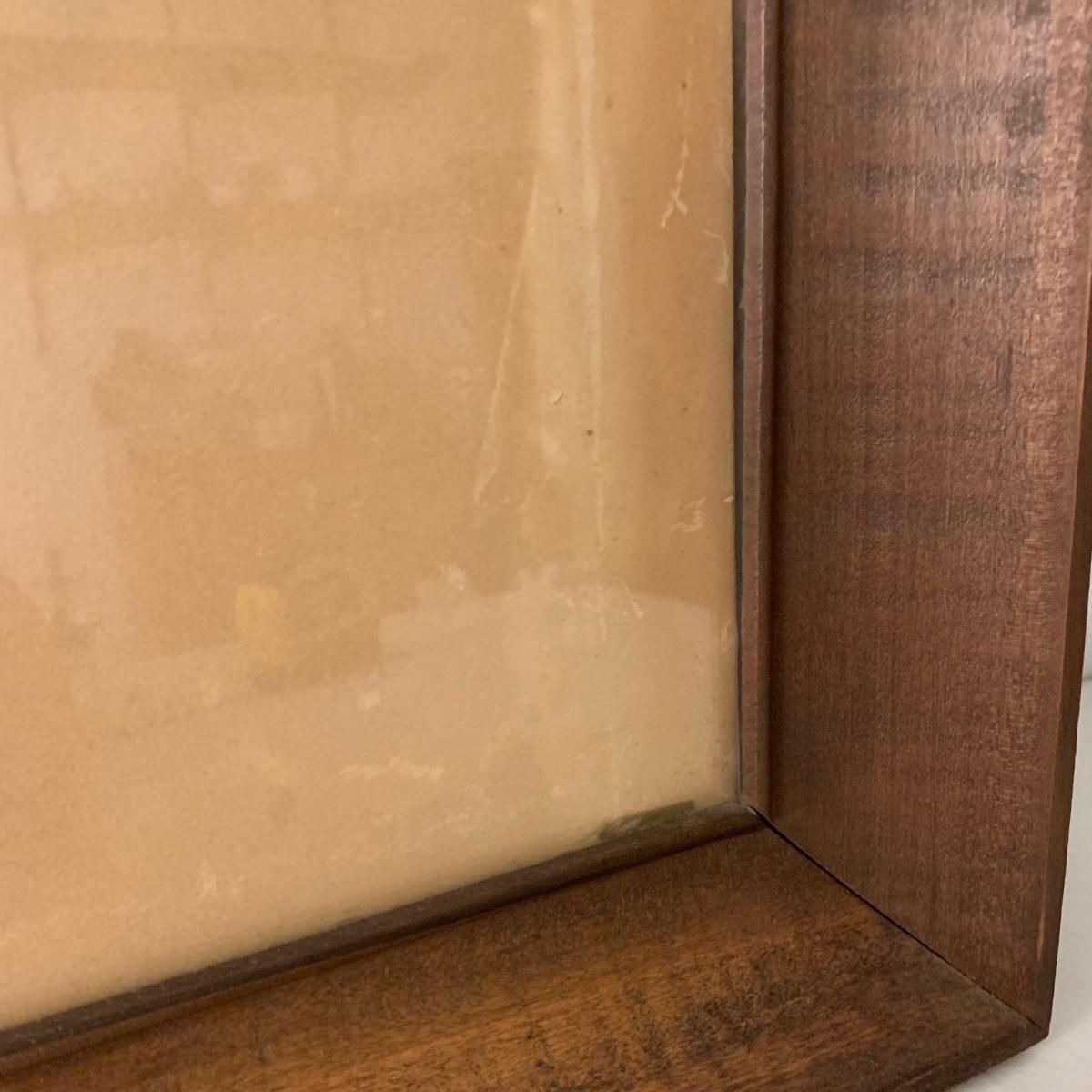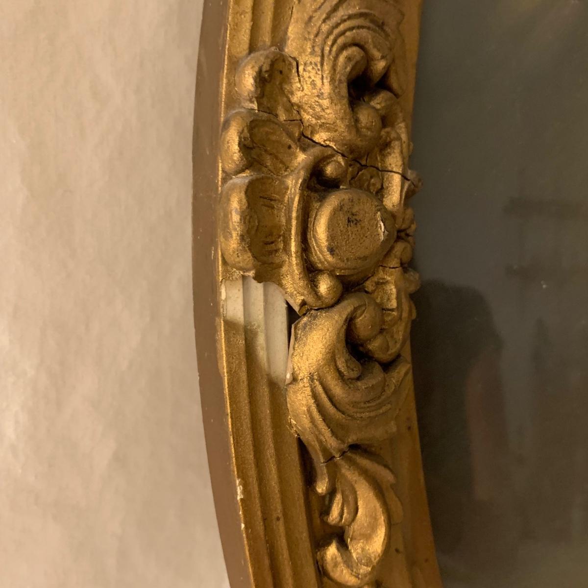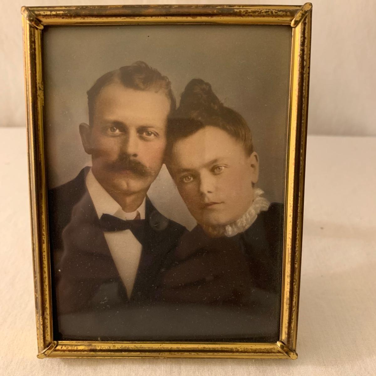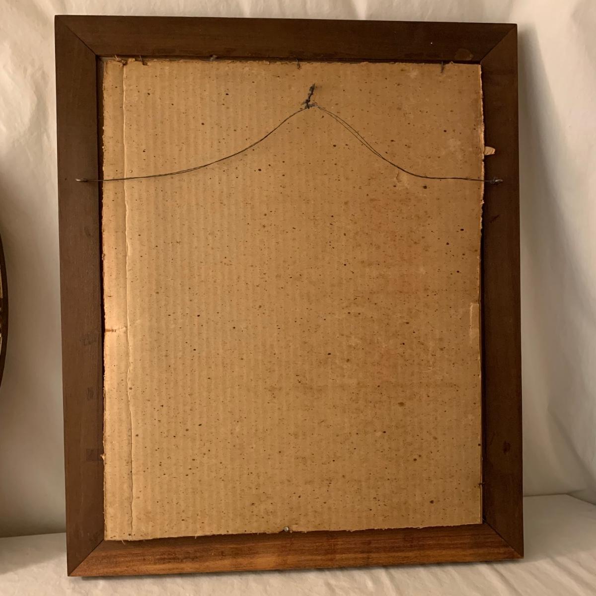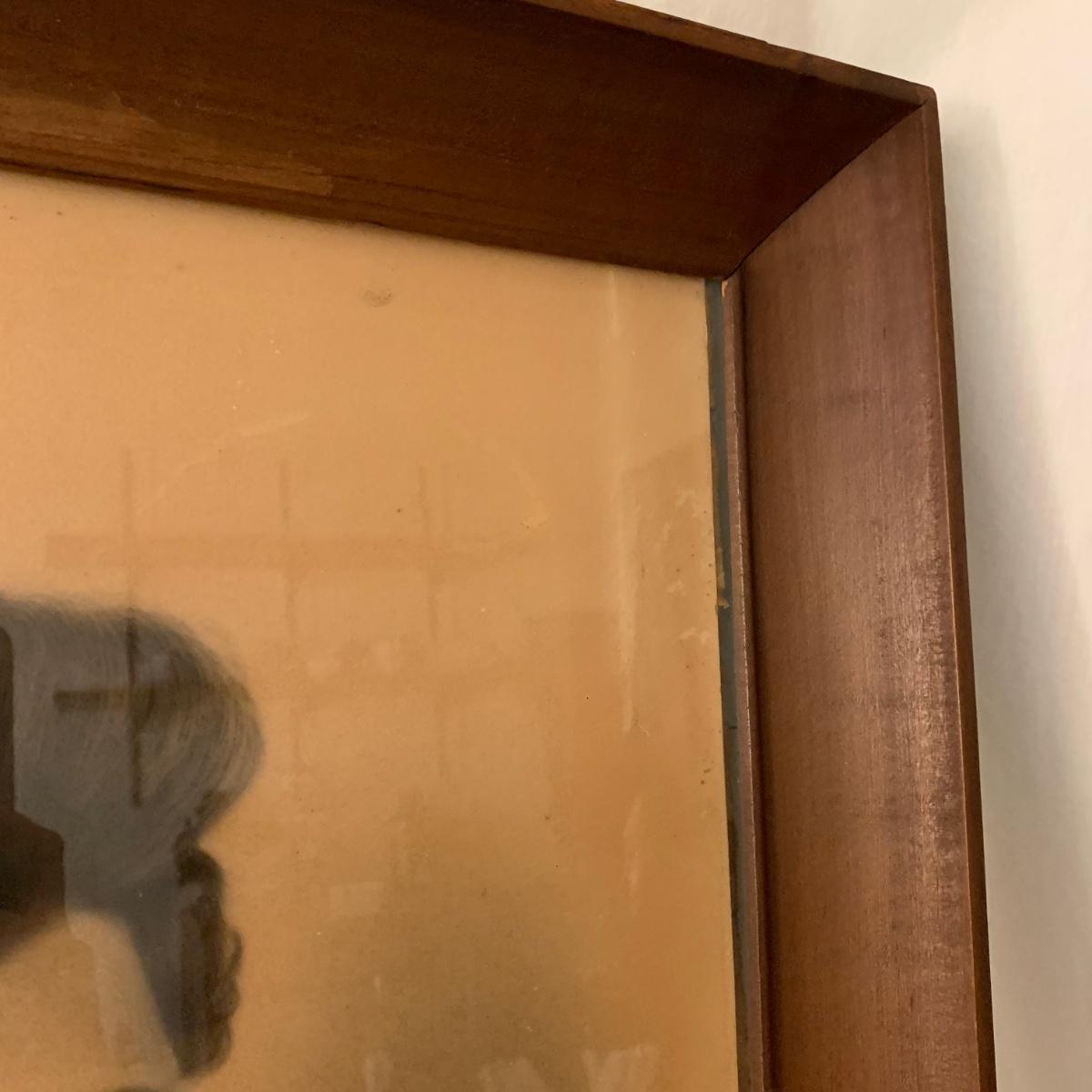 Four antique style photographs, three of which are framed. The large rectangular frame is wood. It measures 19.5” x 1.75” x 23.5”. The frame and photo are in good condition. The oval frame has a convex glass front. It appears to be made of wood with resin accents, painted gold. The frame is in fair condition (see photos), but the photograph is in good condition. The frame measures 17” x 23”. The unframed photo of the baby is 16” x 20”. It is in fair condition with quite torn and water stained edges. The frame with the couple is metal and is in worn, but sturdy condition. It is 3.5” x 4.5”. Shipping available.