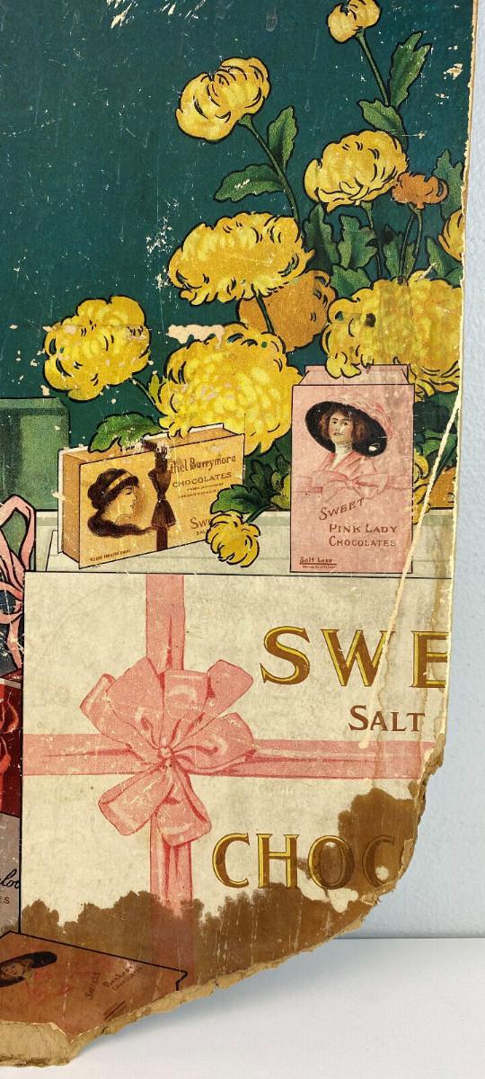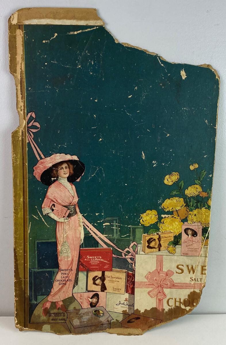 Here is a marvelous old advertising sign from Sweet's Candy. Despite damage with time, as shown...Measures approx. 26.5 x 16.5"...Heavy cardboard...This piece must have been used in their factory store? Inventory of candies on back...Circa 1910's...Featuring SWEET'S PINK LADY CHOCOLATE GIRL. ETHEL BARRYMORE CHOCOLATES. ALL CARAMEL CHOCOLATES. MAXINE ELLIOTT. JULIA MARLOWE...Leon Sweet started the Sweet Candy Company in Portland, Oregon in 1892...relocating to Salt Lake City, Utah, in 1900...where they remain and thrive to this day...still a family owned business...This rare piece is offered with no reserve...