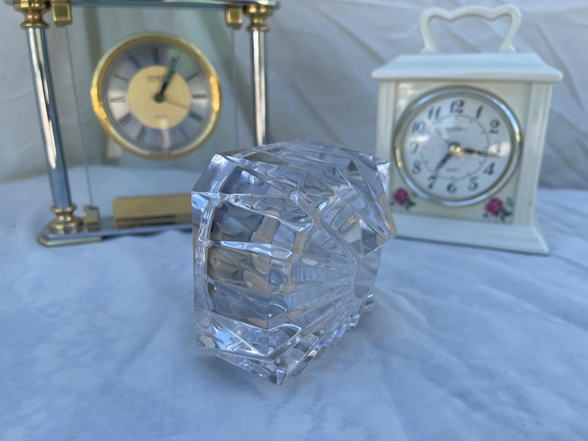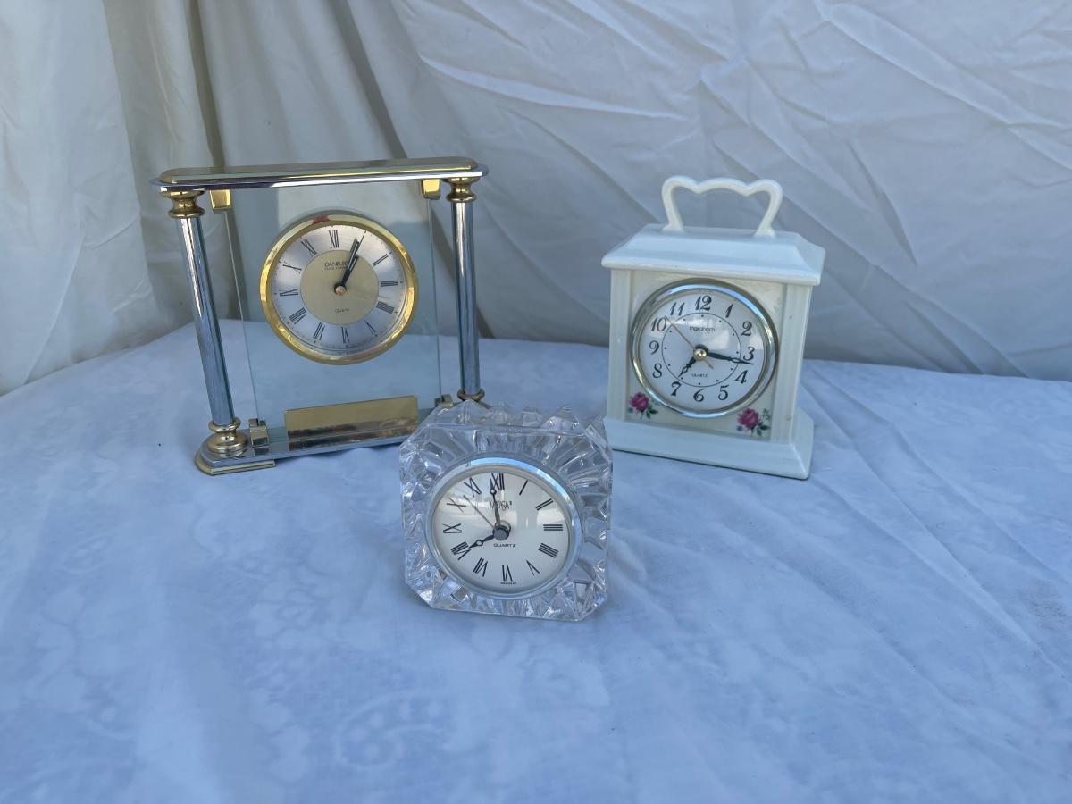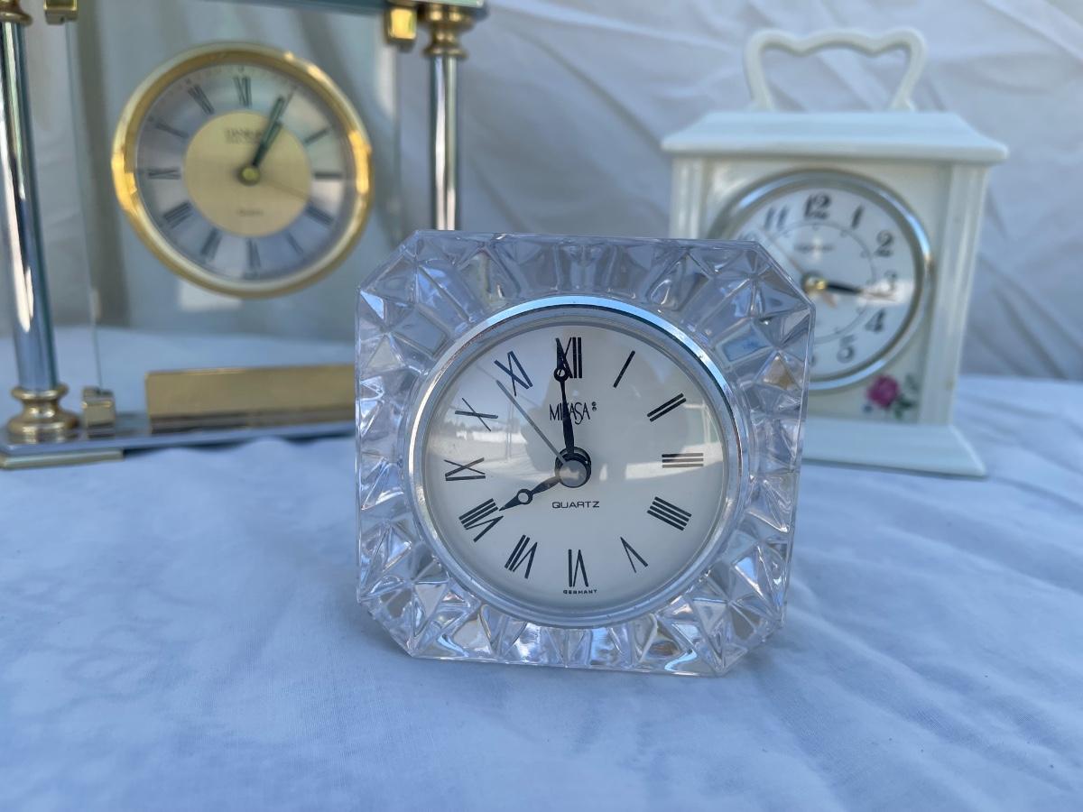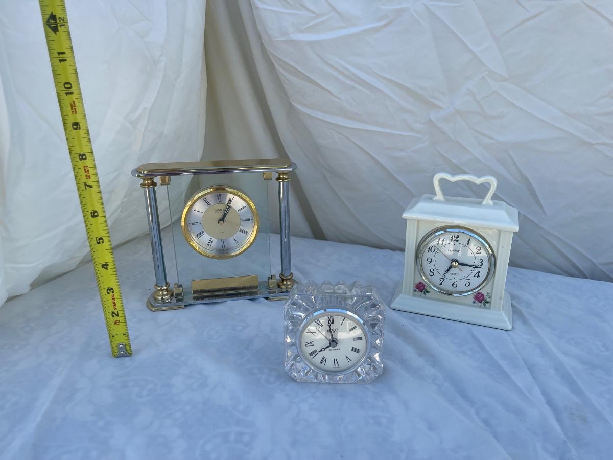 3 antique battery operated table clocks, selling as a set. Front clock is carved glass, approximately 3"x2"x3". Back left clock is set in glass with gold and silver accents, has "Mom & Dad" etched into gold plate beneath face, and is approximately 6"x1"x6". Back right clock has cute flower details on white ceramic house with removable face to access battery and ornament on top; approximately 5"x3"x5".