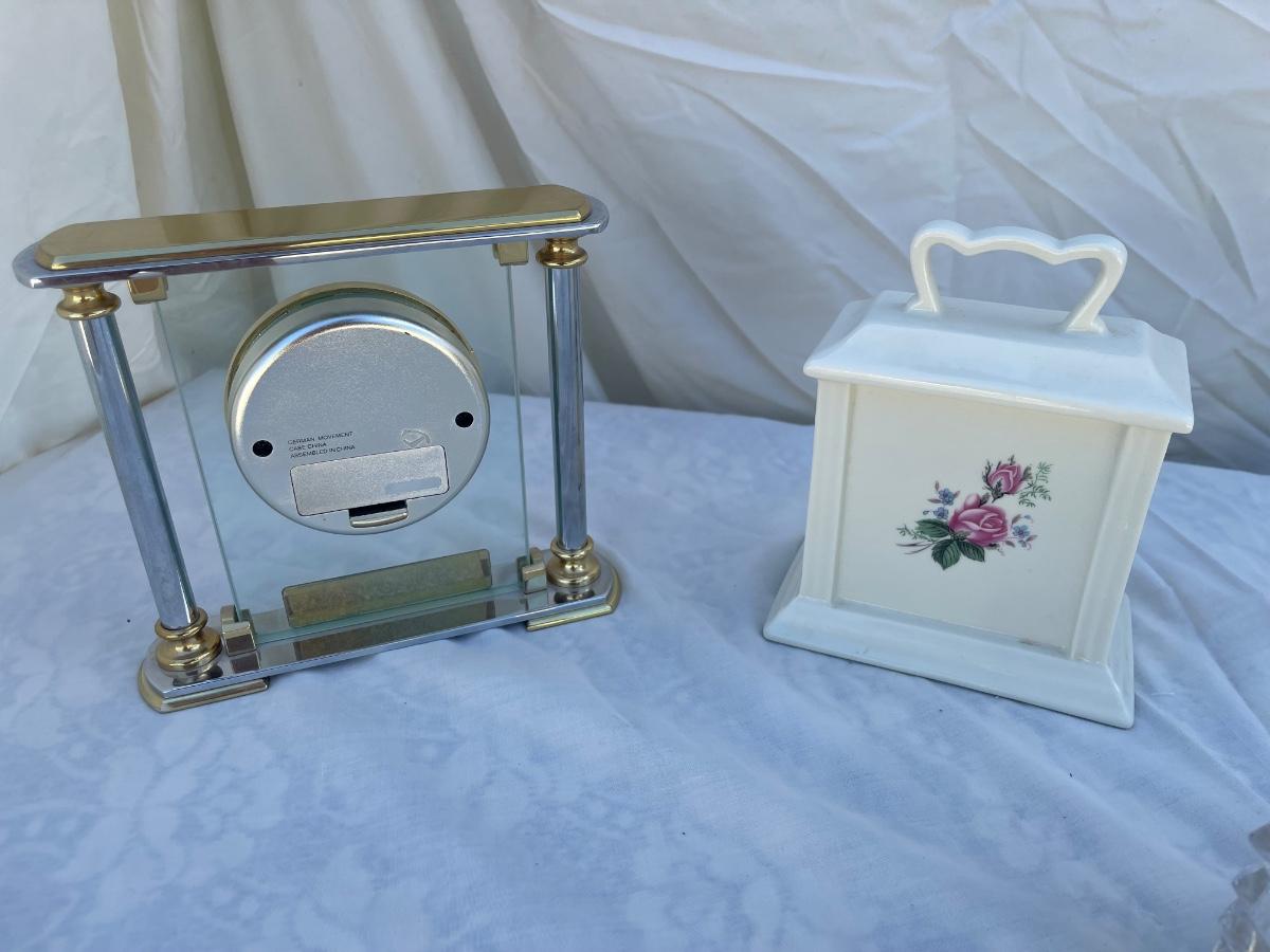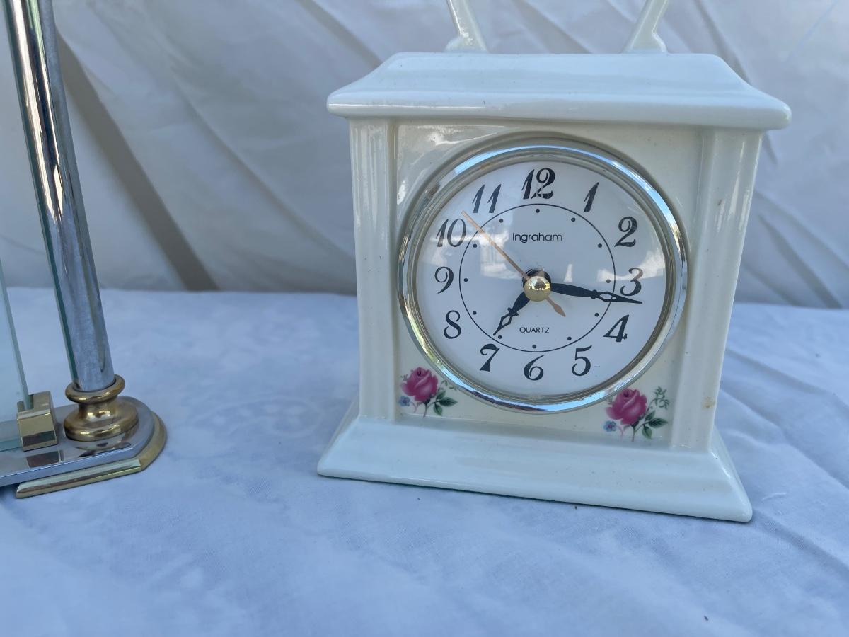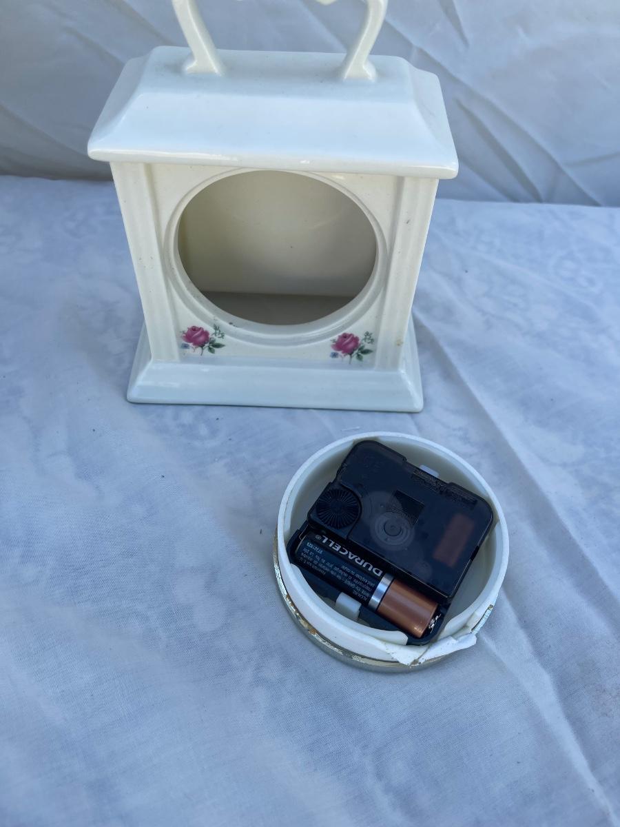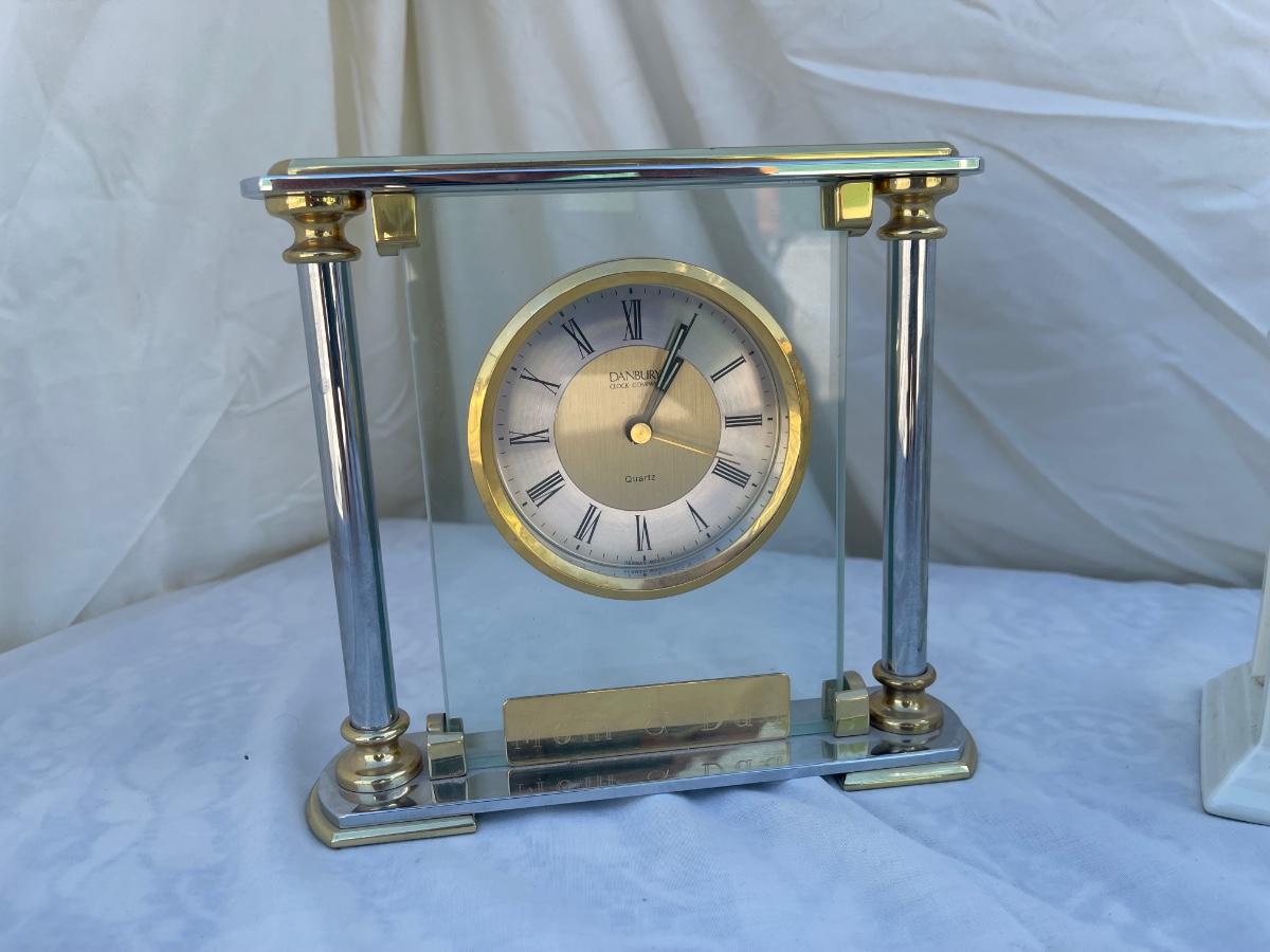 3 antique battery operated table clocks, selling as a set. Front clock is carved glass, approximately 3"x2"x3". Back left clock is set in glass with gold and silver accents, has "Mom & Dad" etched into gold plate beneath face, and is approximately 6"x1"x6". Back right clock has cute flower details on white ceramic house with removable face to access battery and ornament on top; approximately 5"x3"x5".