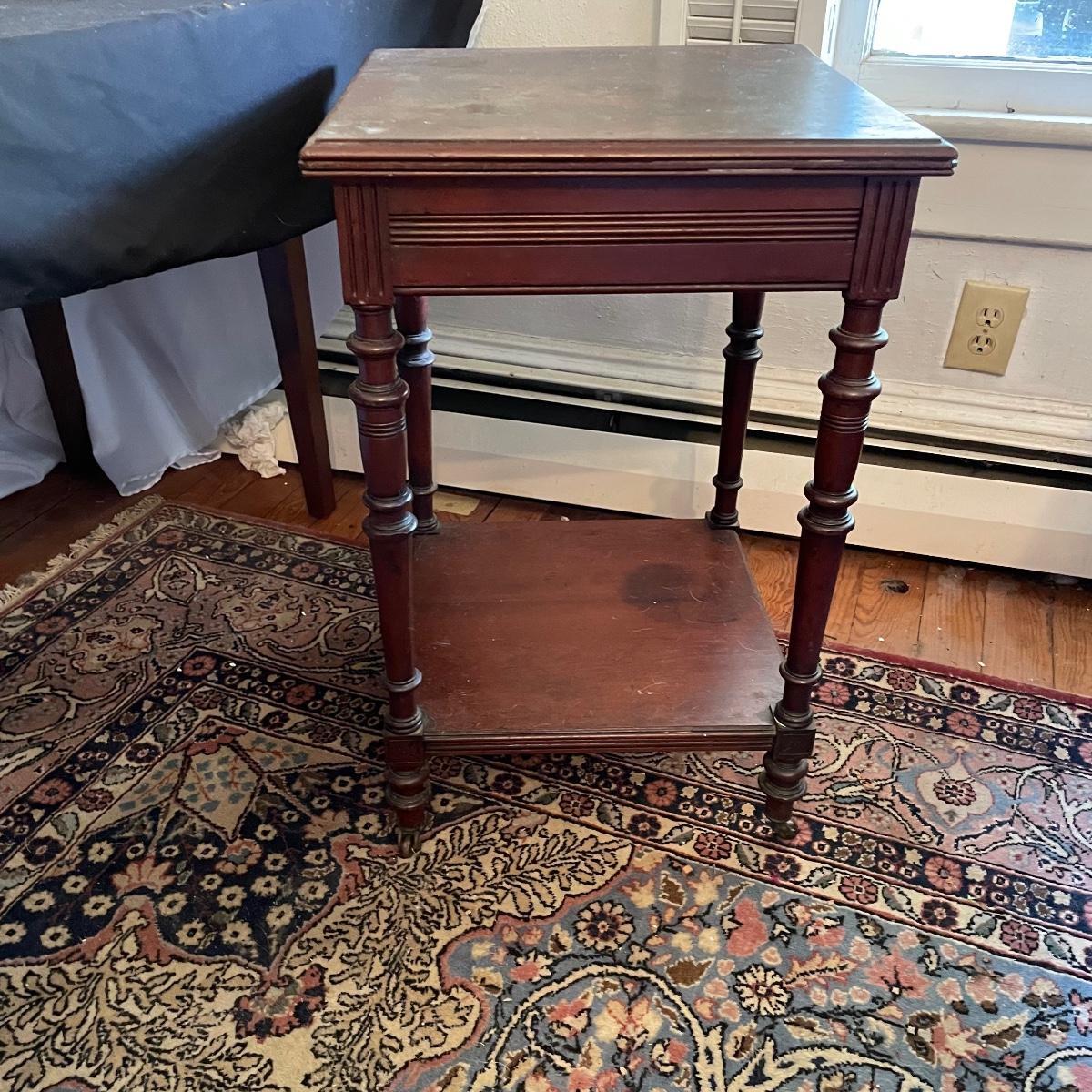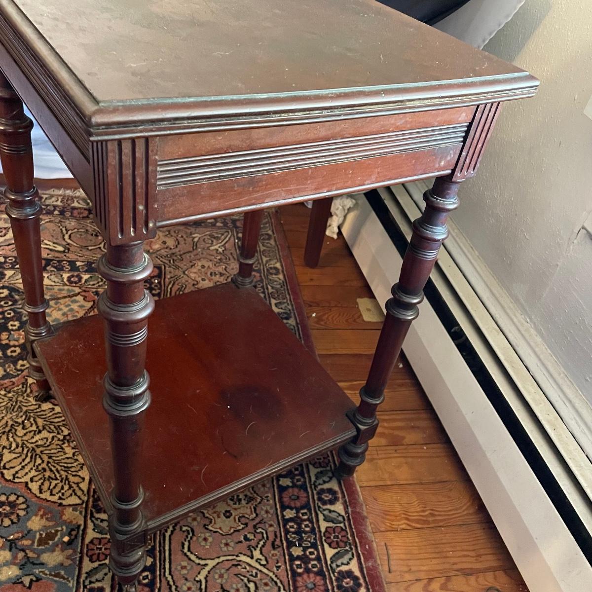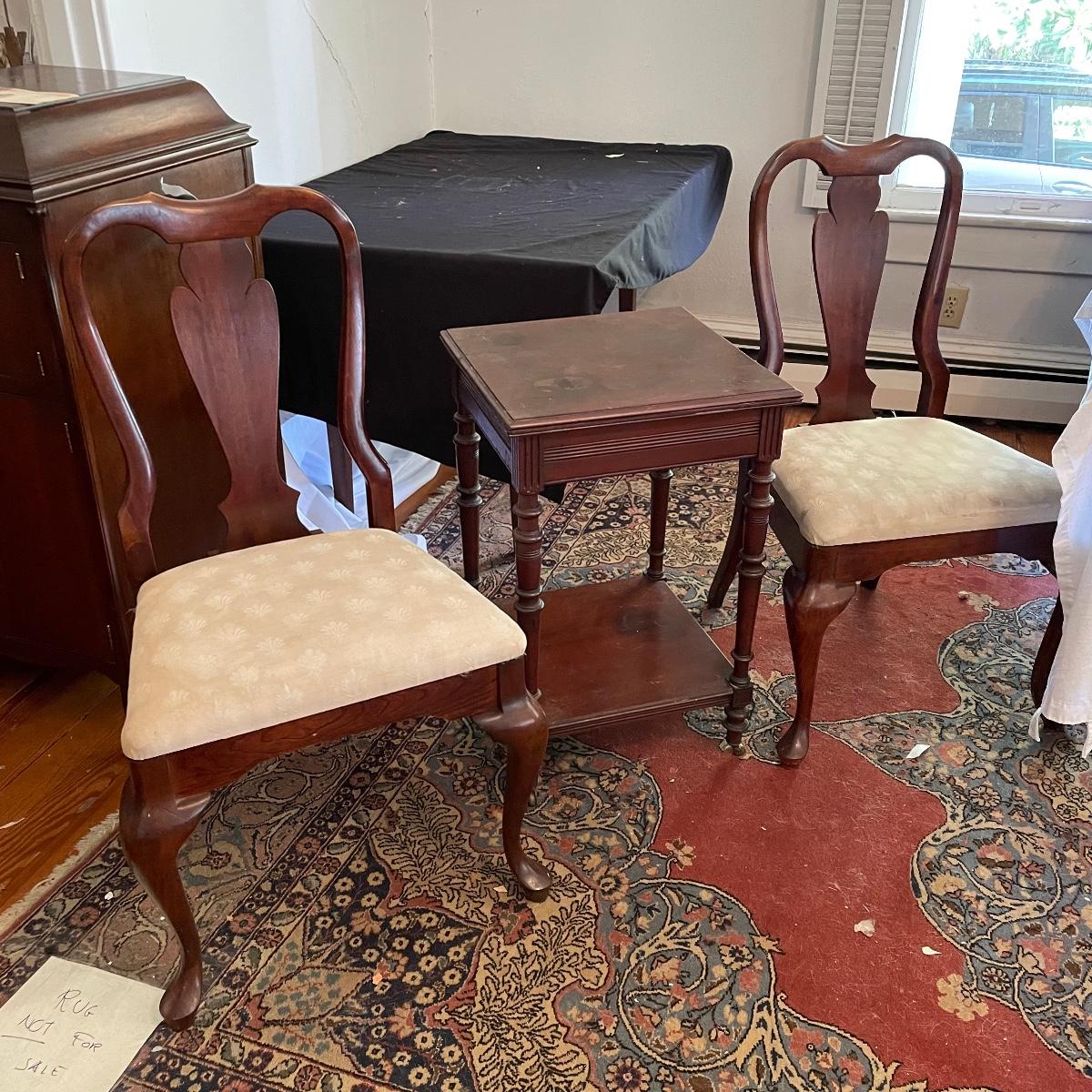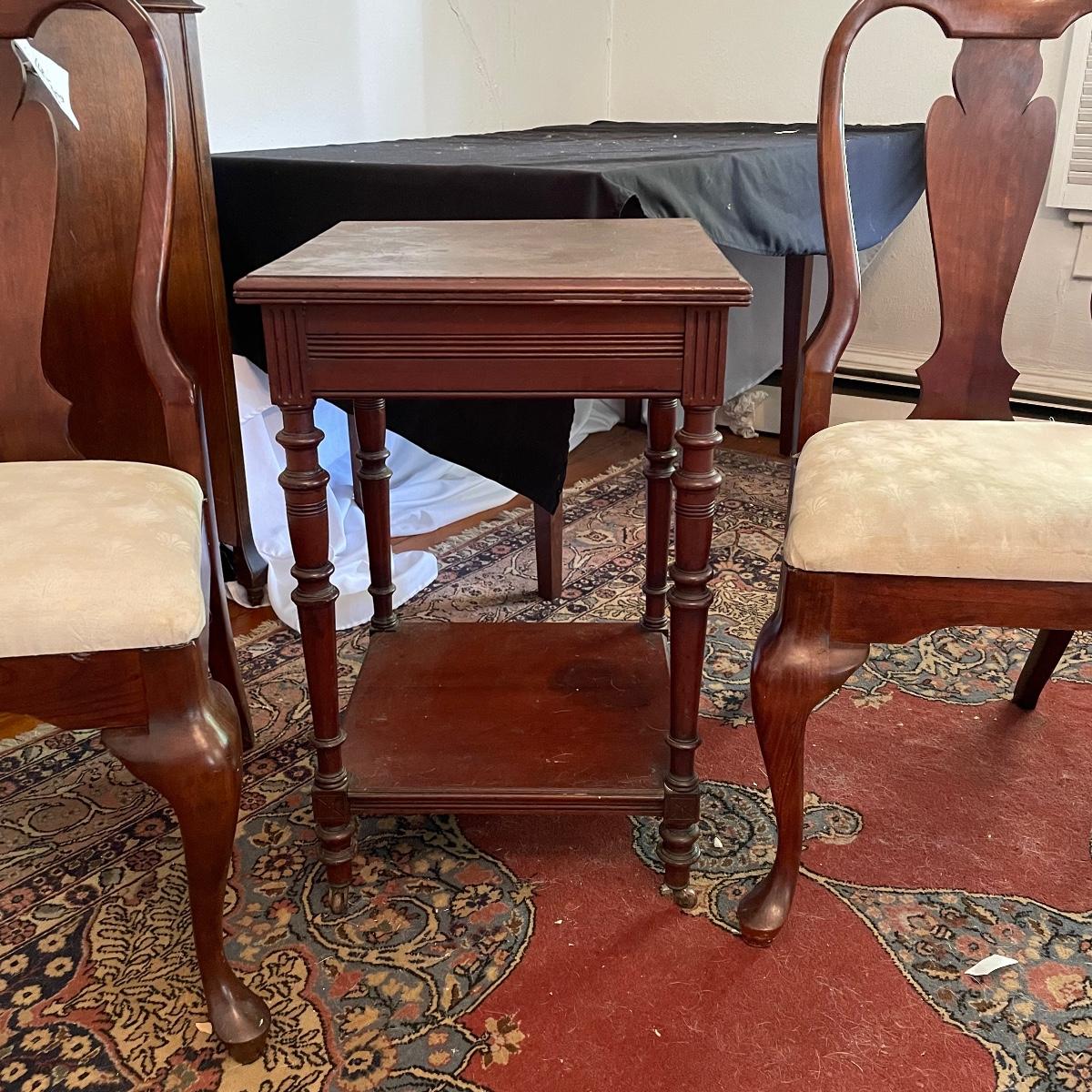 This tall solid wood side table has ornately turned legs that are on good quality casters. The table does have some ring marks, etc see images. The two matching dining chairs are in need of cleaning, possibly even new upholstery; they measure 23” x 23” x 38” with a seat height of 20”. Table measures 18” x 17.5” x 28”.