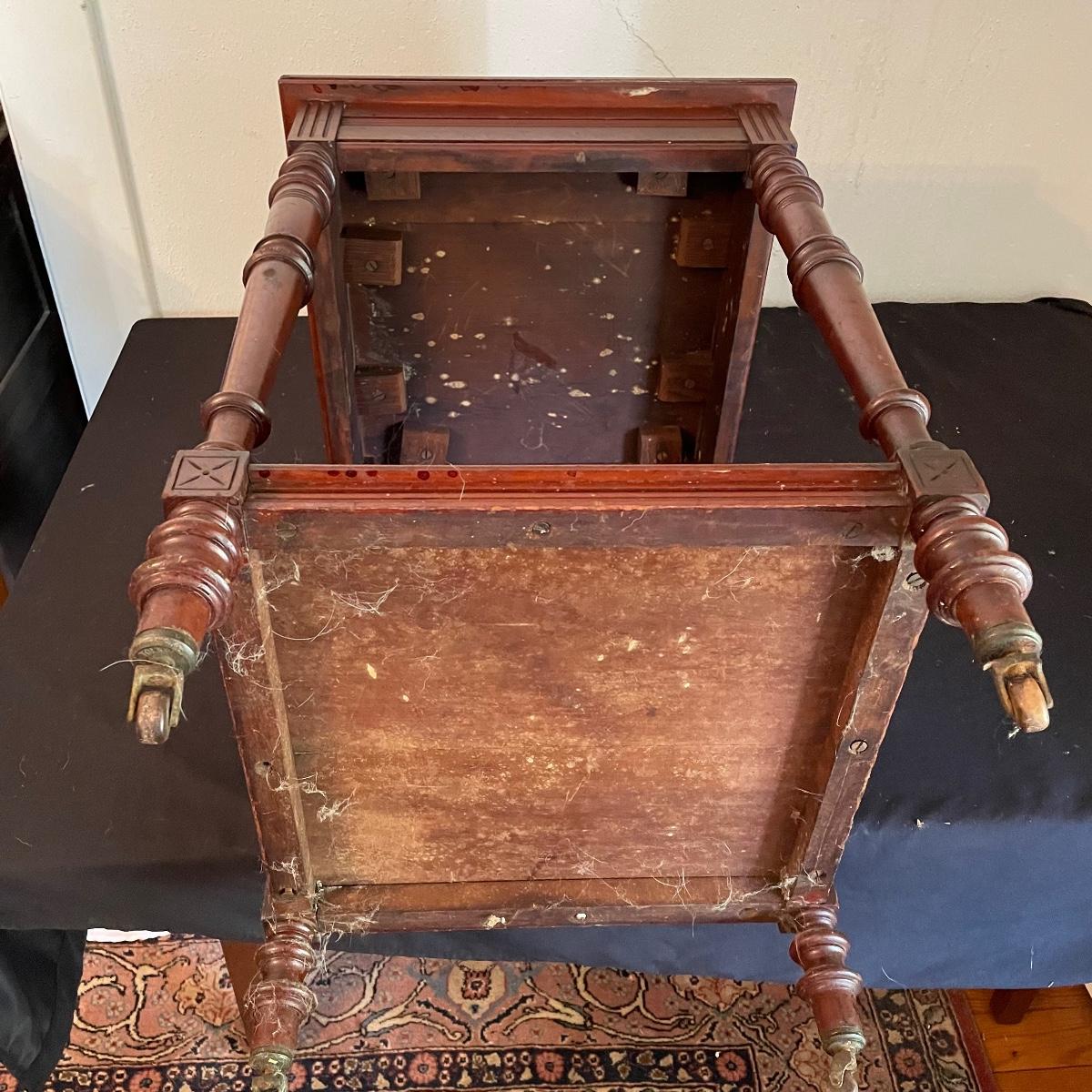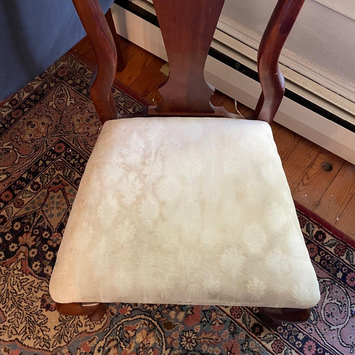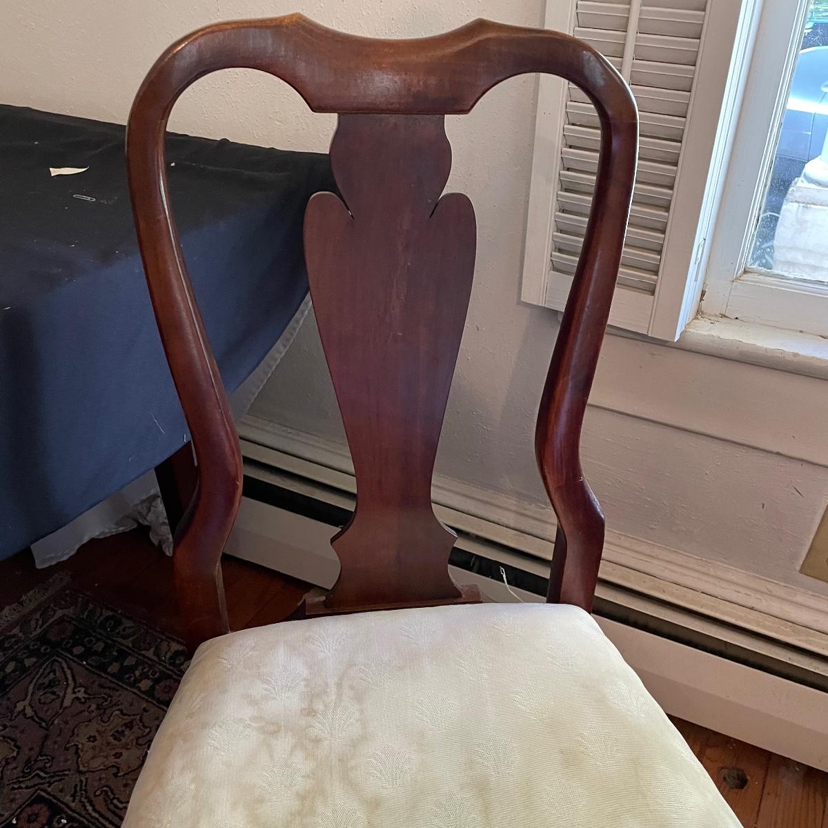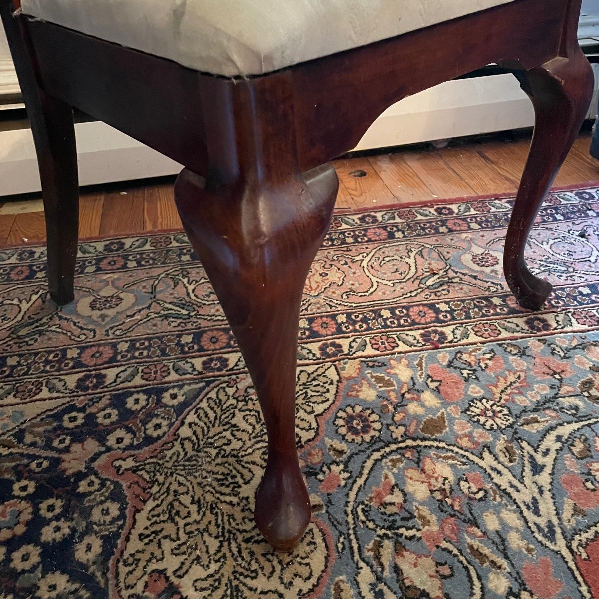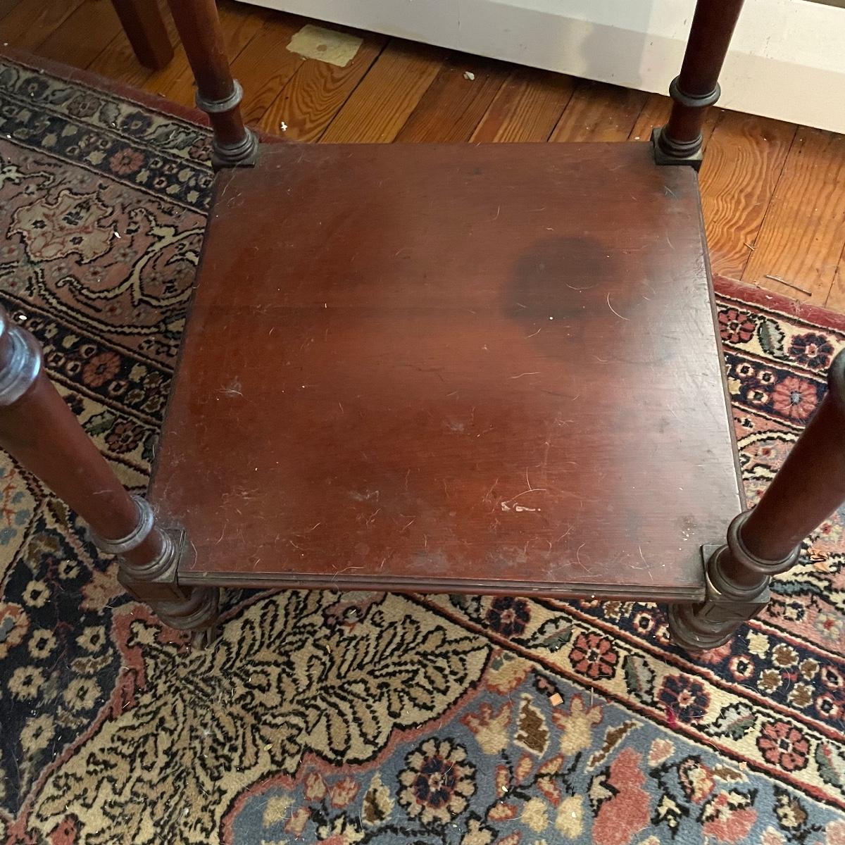 This tall solid wood side table has ornately turned legs that are on good quality casters. The table does have some ring marks, etc see images. The two matching dining chairs are in need of cleaning, possibly even new upholstery; they measure 23” x 23” x 38” with a seat height of 20”. Table measures 18” x 17.5” x 28”.