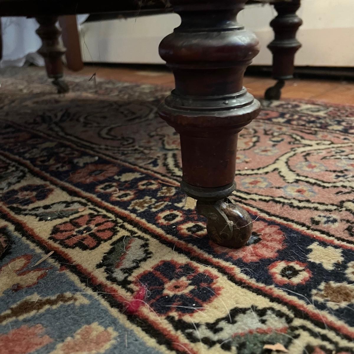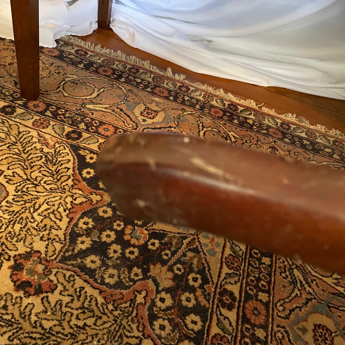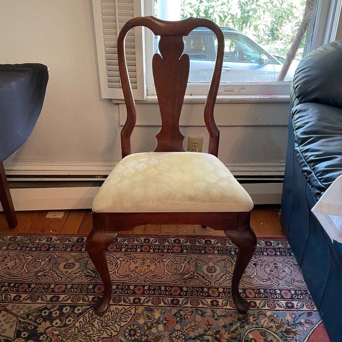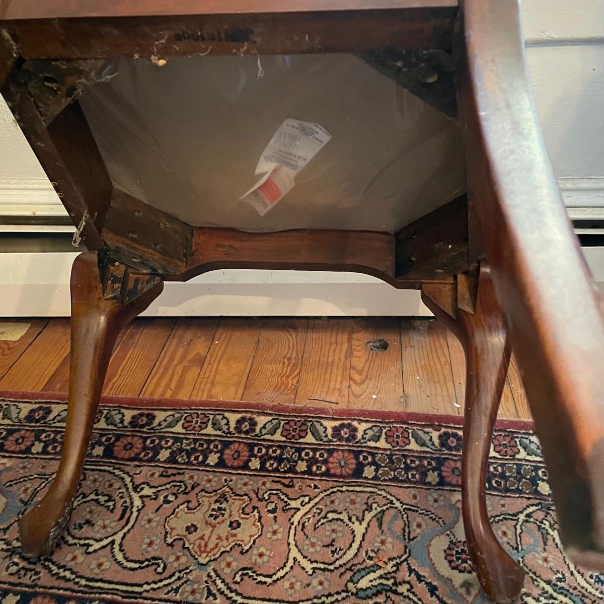 This tall solid wood side table has ornately turned legs that are on good quality casters. The table does have some ring marks, etc see images. The two matching dining chairs are in need of cleaning, possibly even new upholstery; they measure 23” x 23” x 38” with a seat height of 20”. Table measures 18” x 17.5” x 28”.