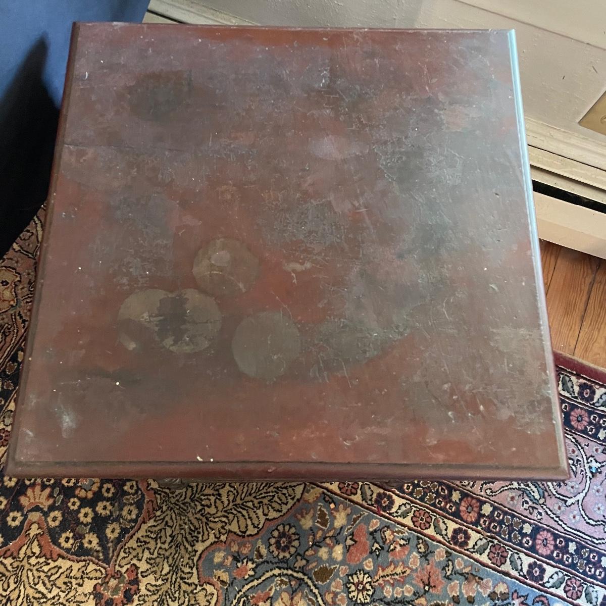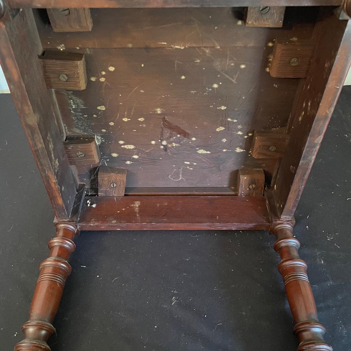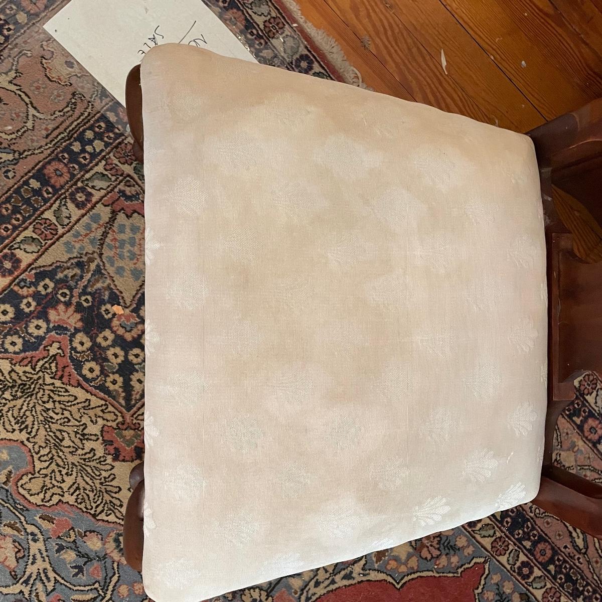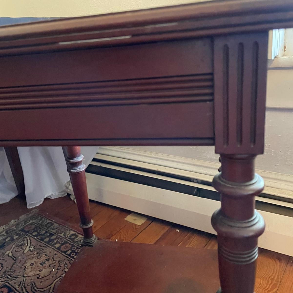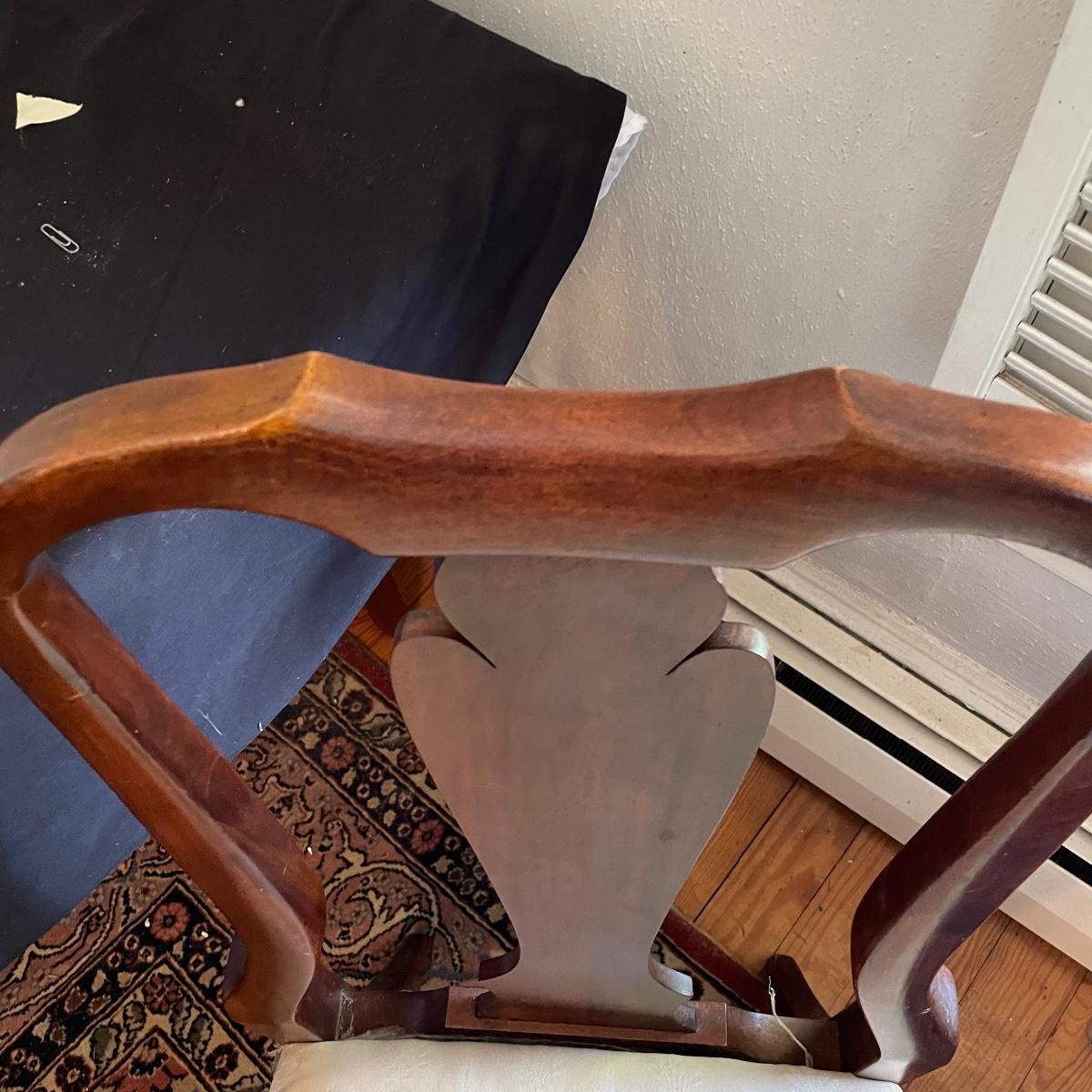 This tall solid wood side table has ornately turned legs that are on good quality casters. The table does have some ring marks, etc see images. The two matching dining chairs are in need of cleaning, possibly even new upholstery; they measure 23” x 23” x 38” with a seat height of 20”. Table measures 18” x 17.5” x 28”.