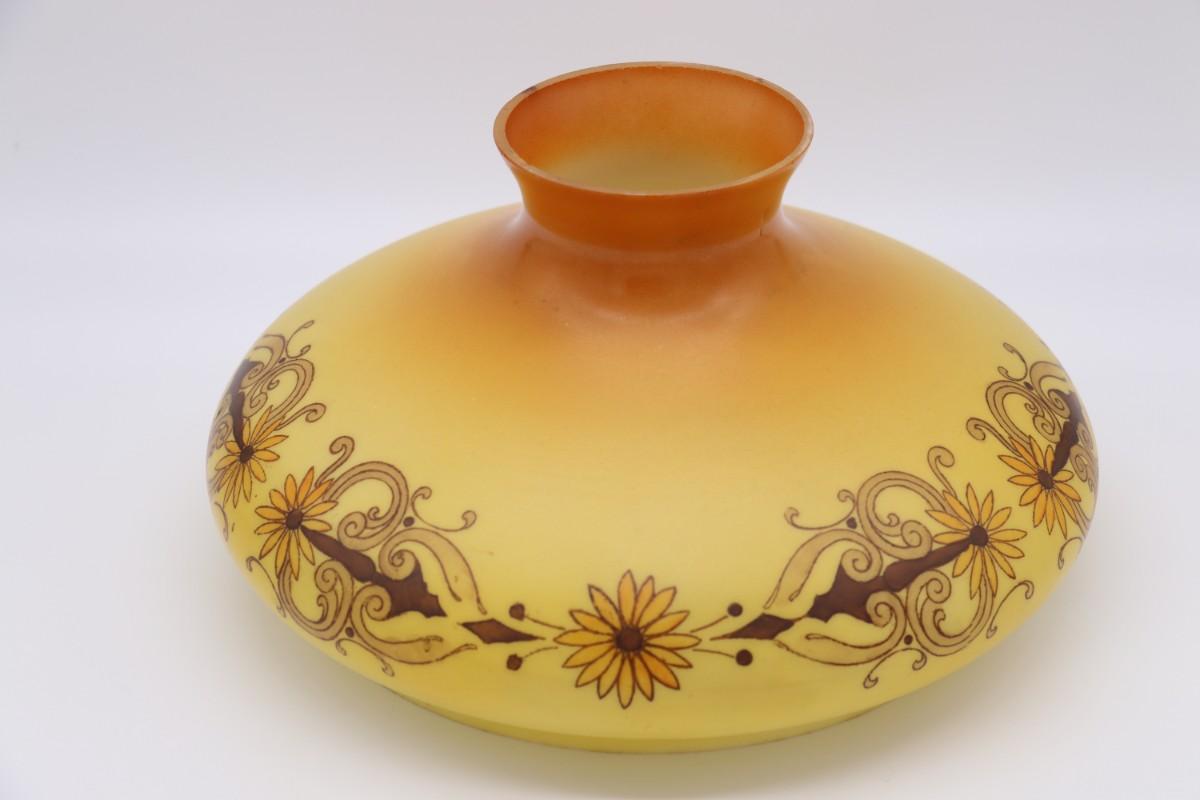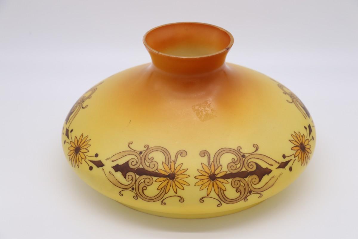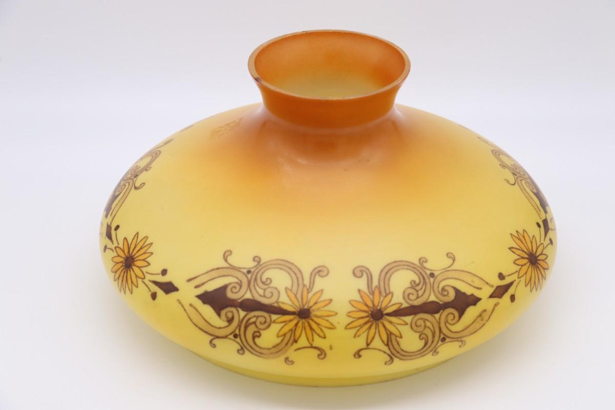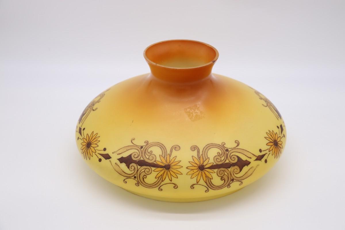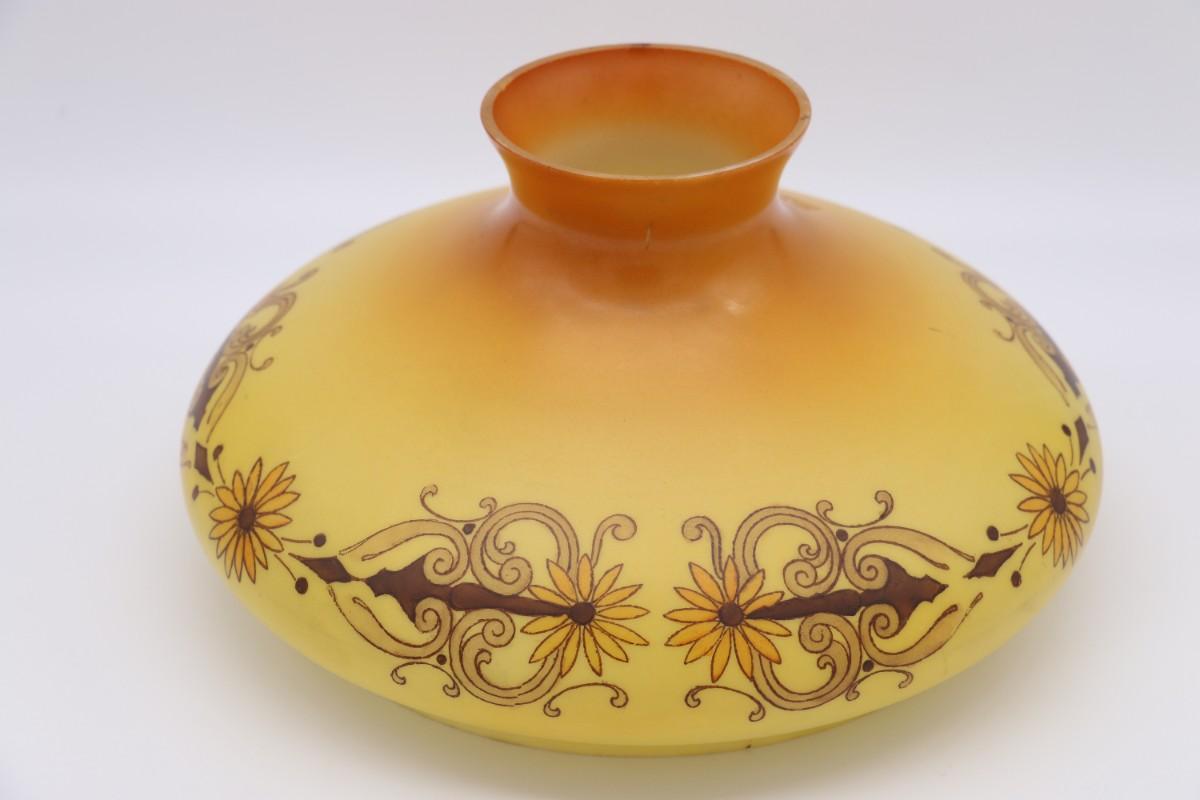 Antique Tam O Shanter Kerosene Lamp Shade Attributed to Handel. 10 inch base. Vintage yellow, orange, and brown floral pattern painted onto shade. Singed and numbered (Handel, 3345). From the estate of an antique store owner and lamp enthusiast. Condition as shown.