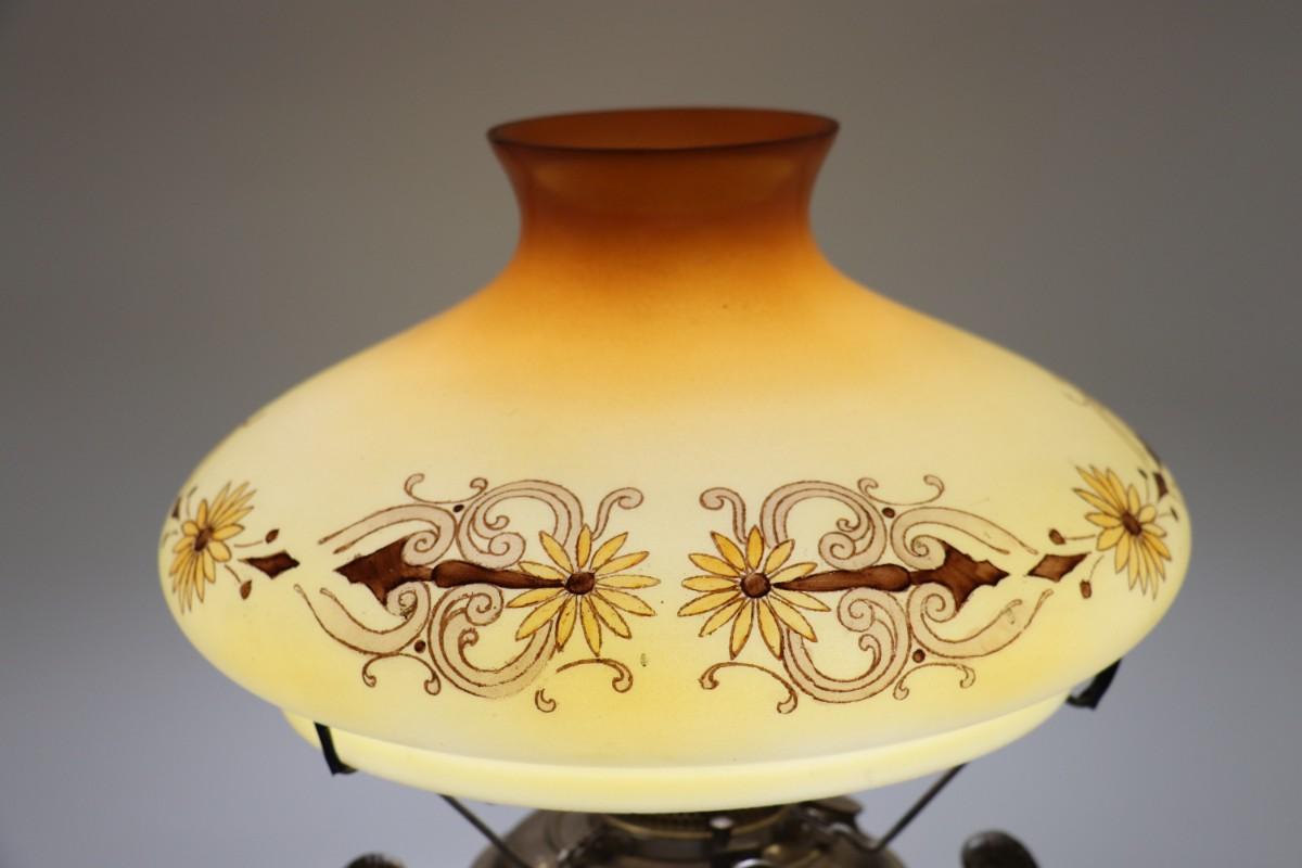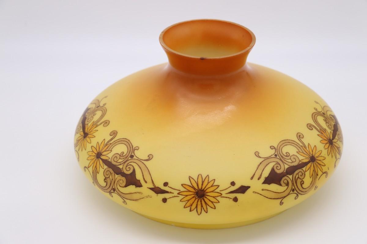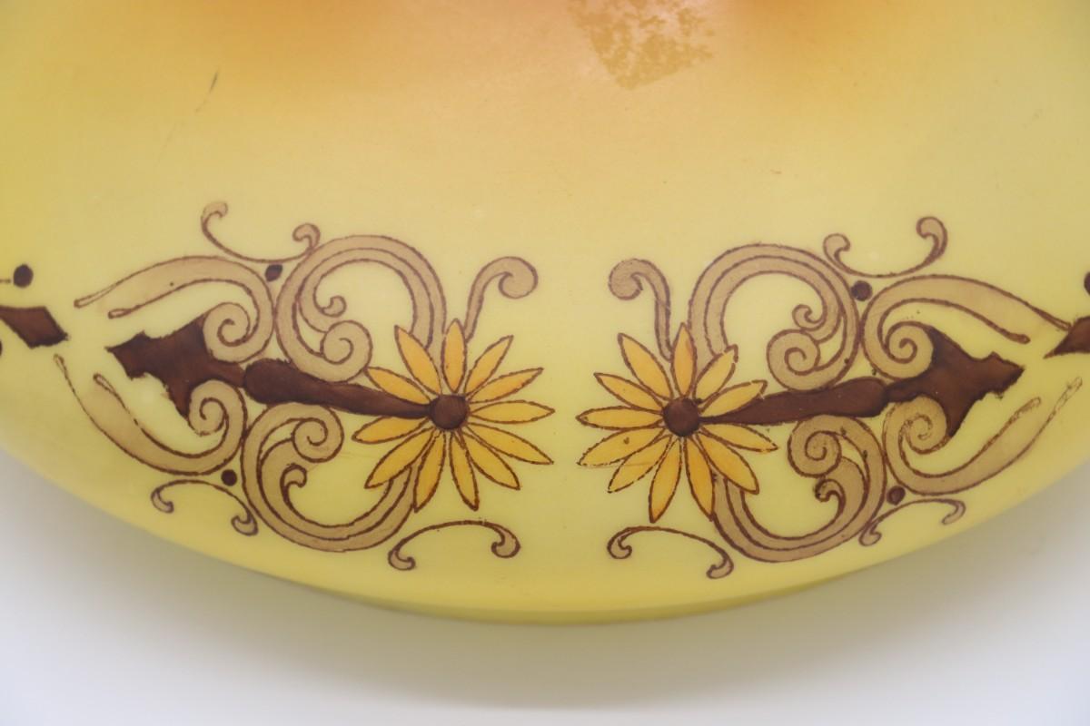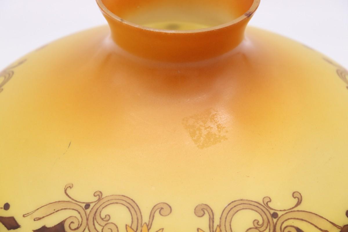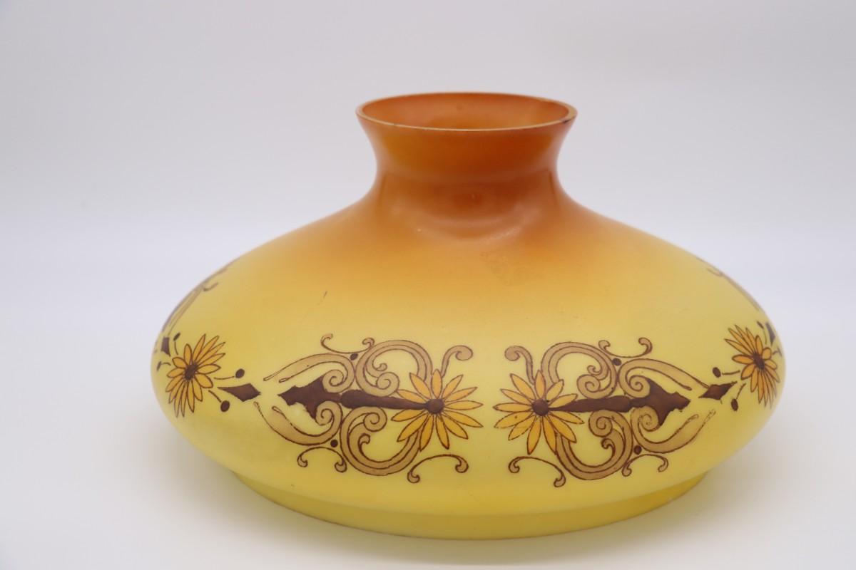 Antique Tam O Shanter Kerosene Lamp Shade Attributed to Handel. 10 inch base. Vintage yellow, orange, and brown floral pattern painted onto shade. Singed and numbered (Handel, 3345). From the estate of an antique store owner and lamp enthusiast. Condition as shown.