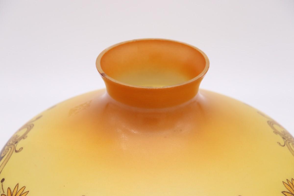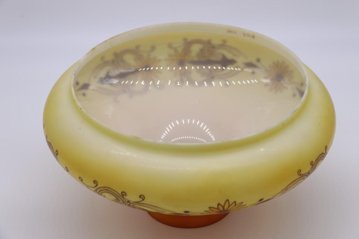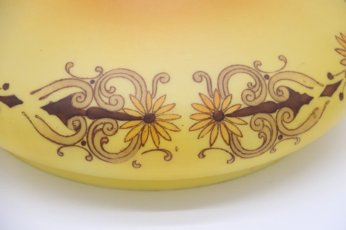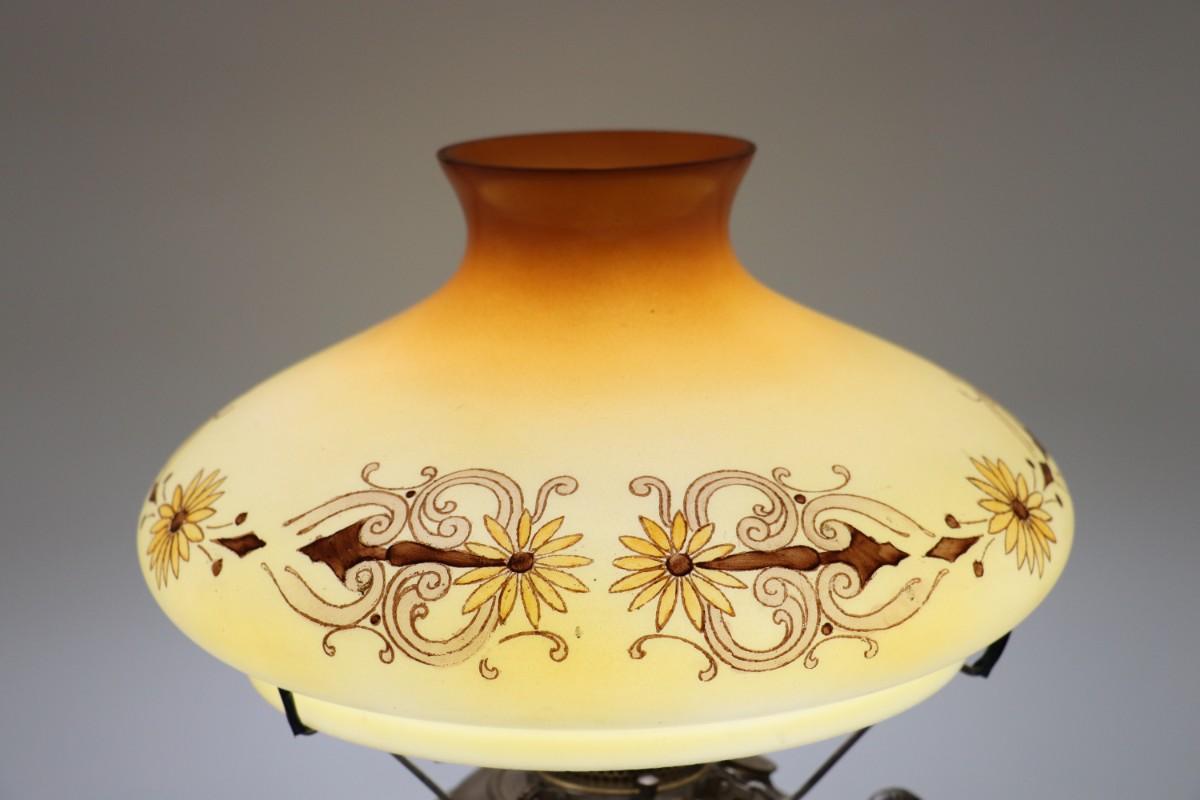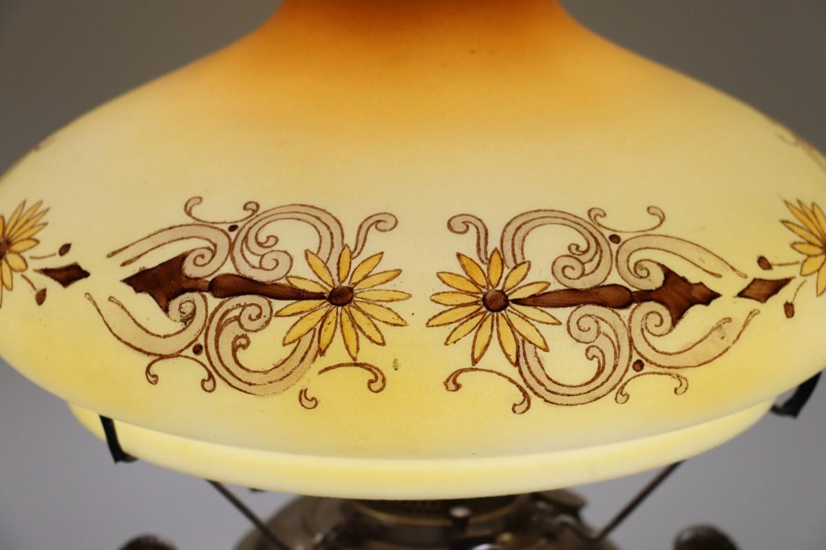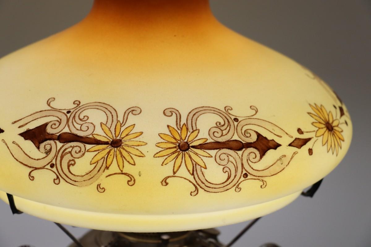 Antique Tam O Shanter Kerosene Lamp Shade Attributed to Handel. 10 inch base. Vintage yellow, orange, and brown floral pattern painted onto shade. Singed and numbered (Handel, 3345). From the estate of an antique store owner and lamp enthusiast. Condition as shown.