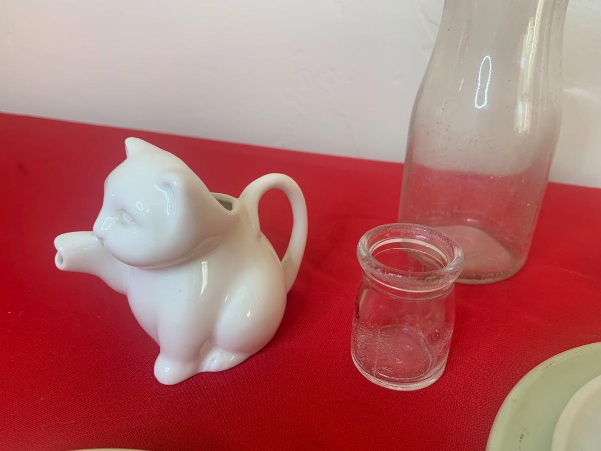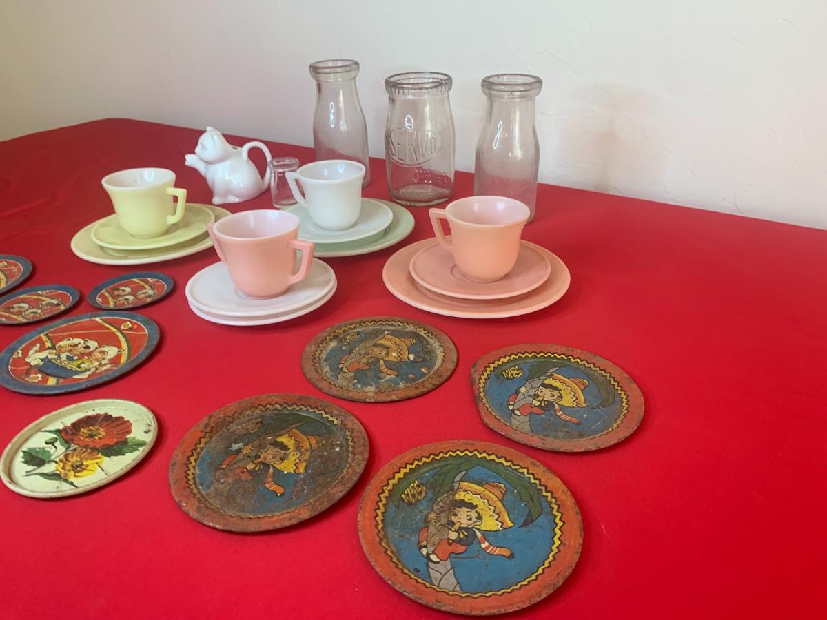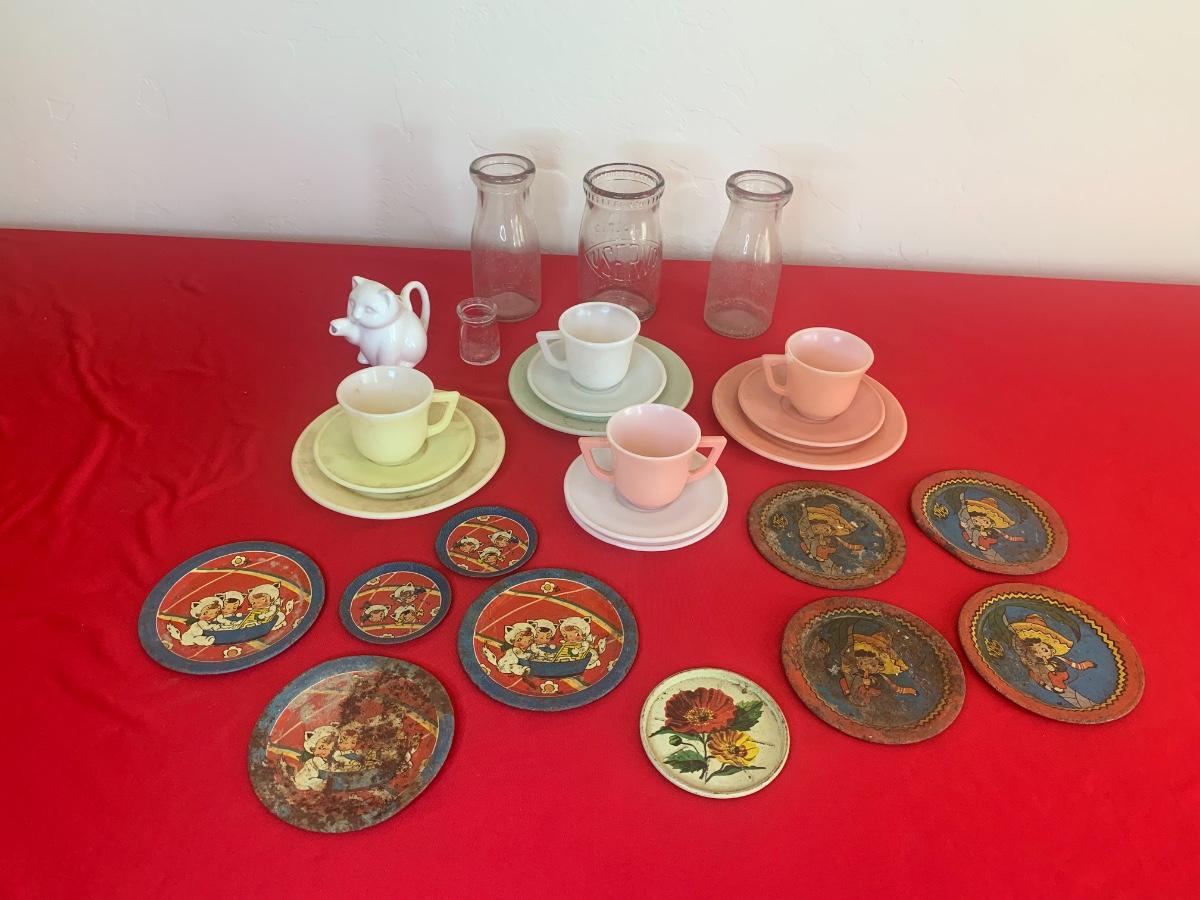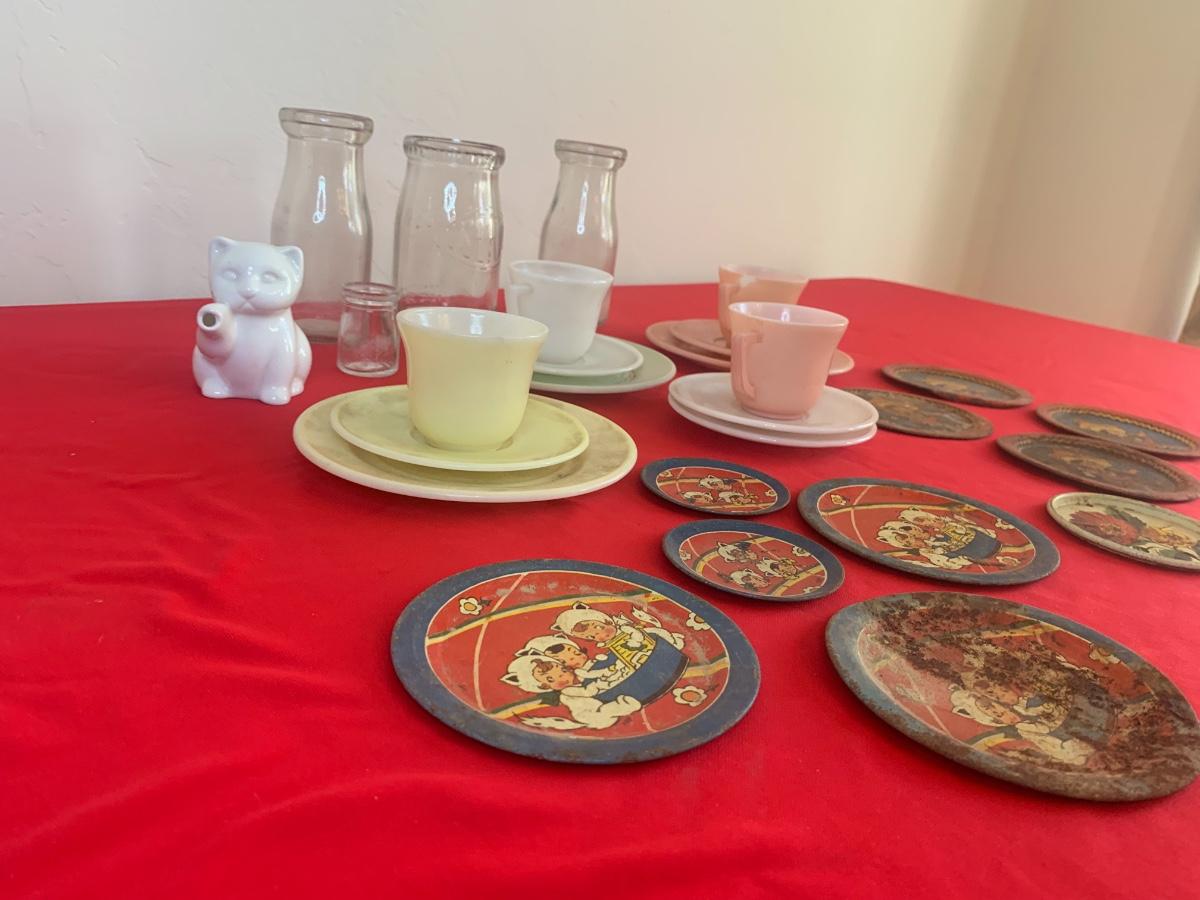 Lot includes a few 40s/50s Hazel Atlas milk glass child’s size tea cup sets, old milk bottles, mini cat creamer and some well loved tin dishes.