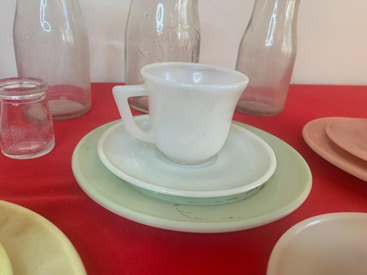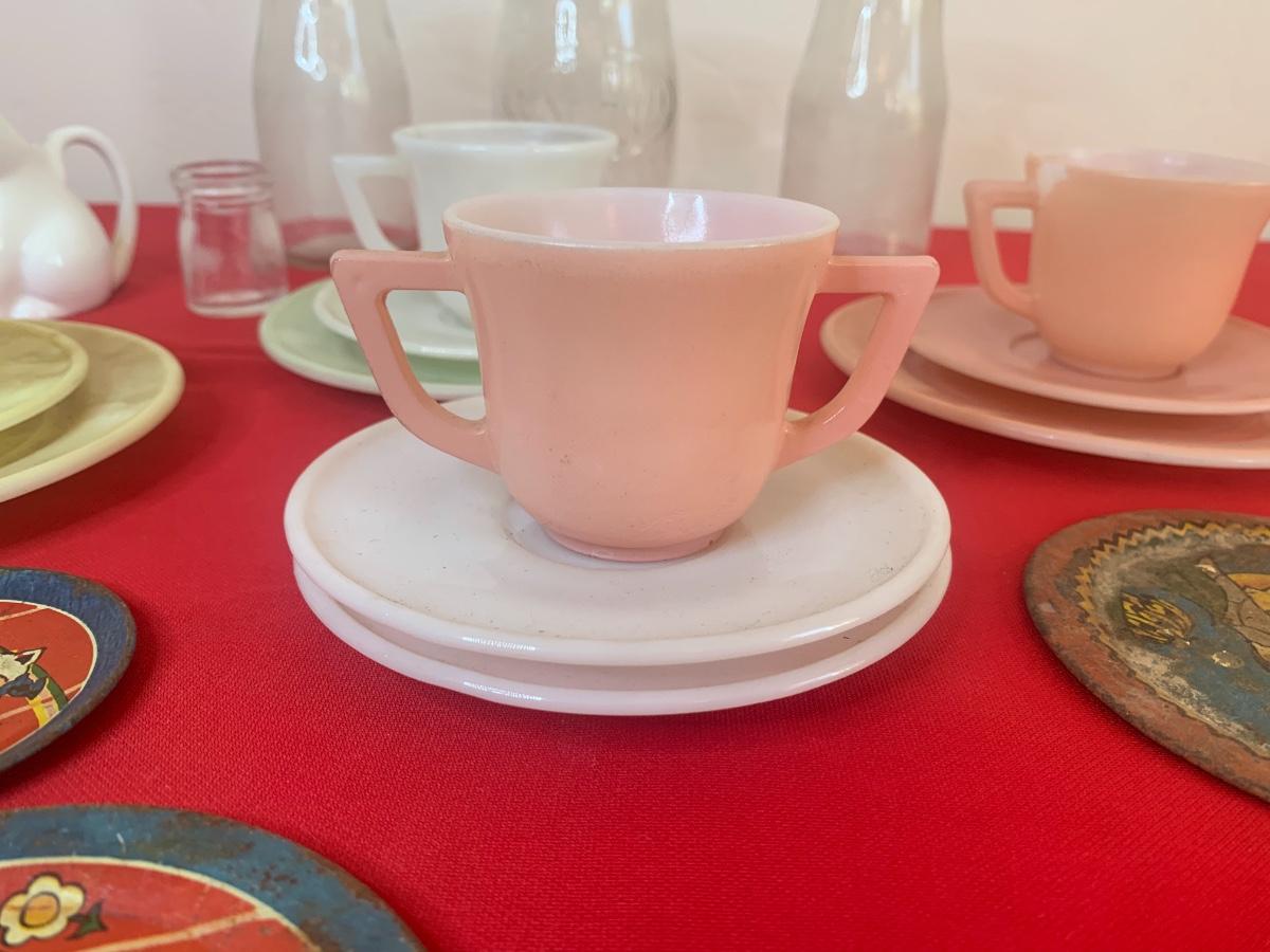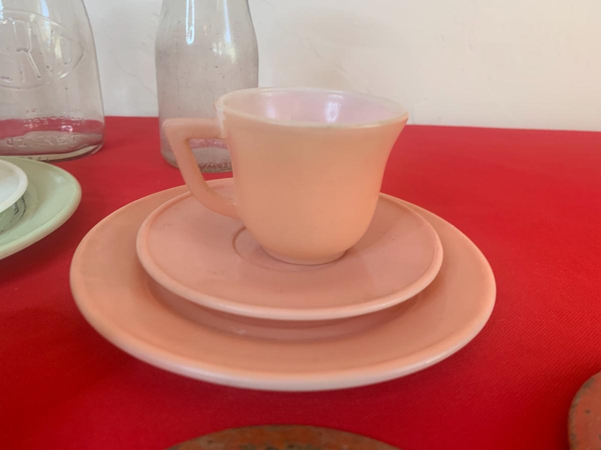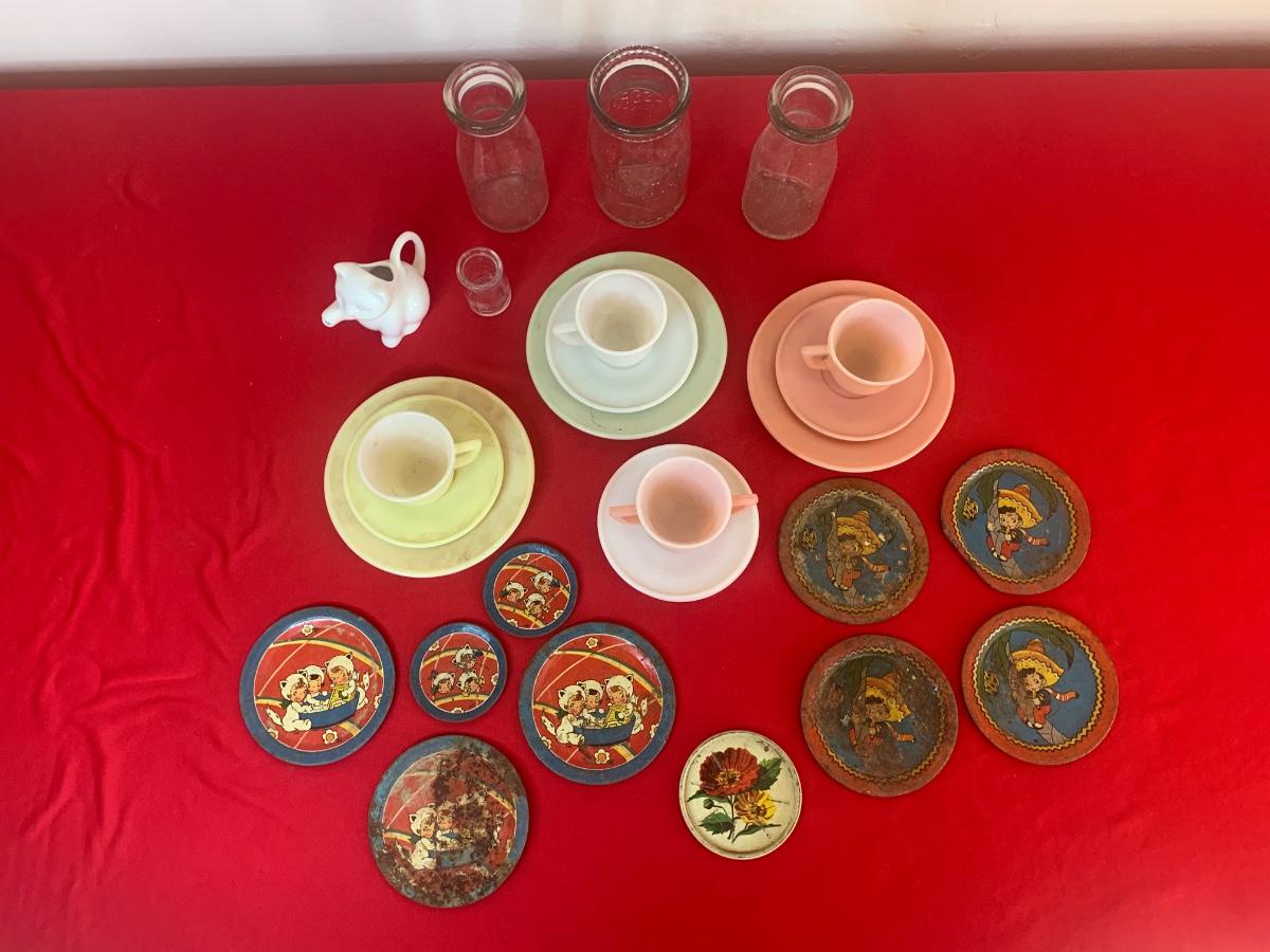 Lot includes a few 40s/50s Hazel Atlas milk glass child’s size tea cup sets, old milk bottles, mini cat creamer and some well loved tin dishes.