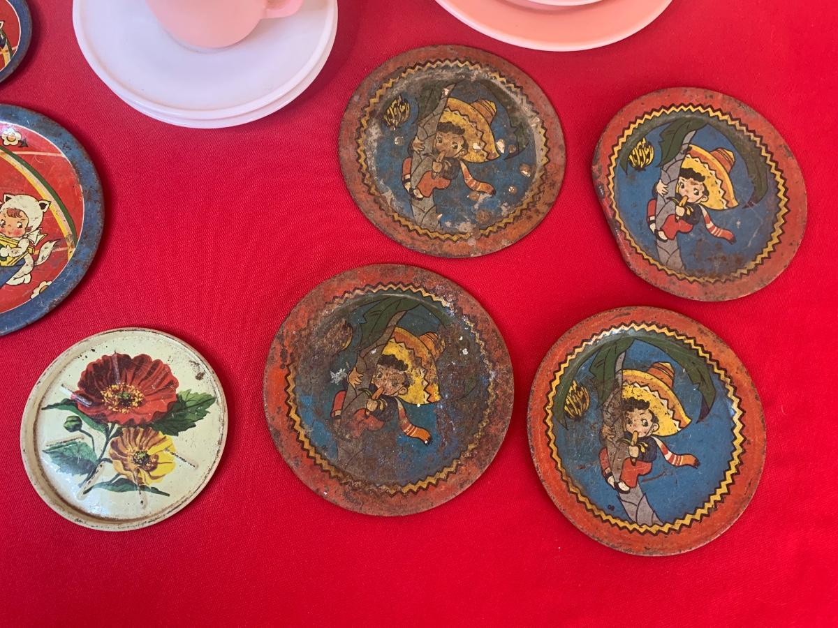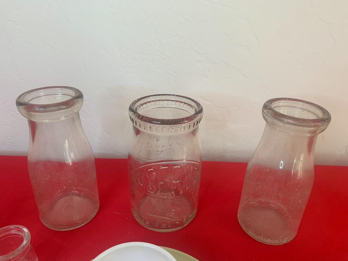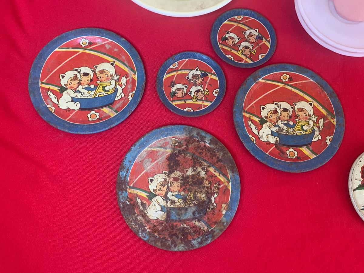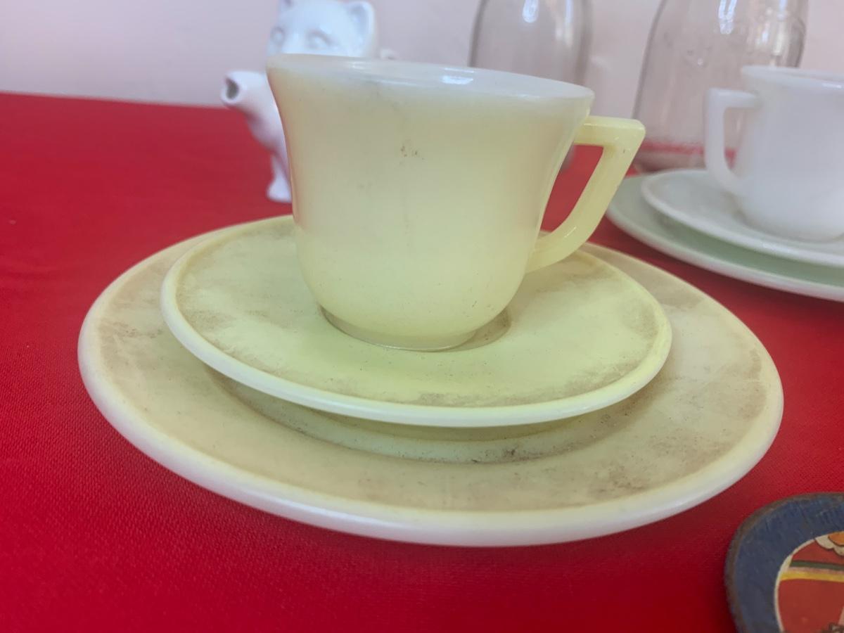Lot includes a few 40s/50s Hazel Atlas milk glass child’s size tea cup sets, old milk bottles, mini cat creamer and some well loved tin dishes.