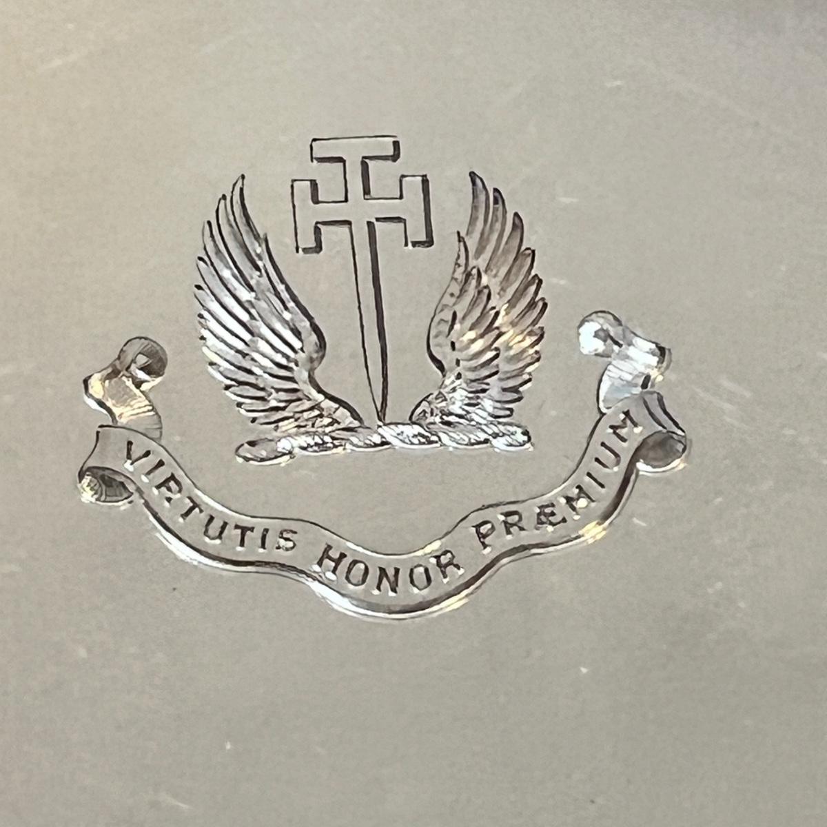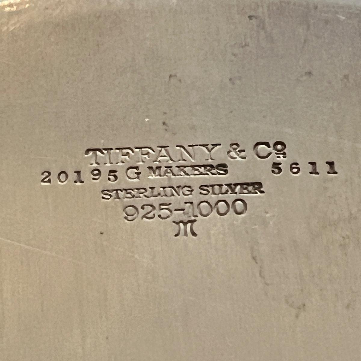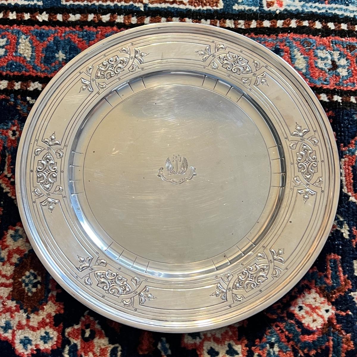This is an absolutely stunning lot of 12 Tiffany & Co. antique sterling silver plates with original Tiffany storage pouches. Stamped Tiffany & Co 20195G Makers 561 Sterling Silver 925-1000. The plates are 11" diameter and have an engraved line border with a scroll motif, engraved crest center with the Latin words "Virtutis Honor Praemim" which translates to "Esteem is the reward for virtue". Each plate weighs 540 grams for a total weight of the 12 - 6480 grams.