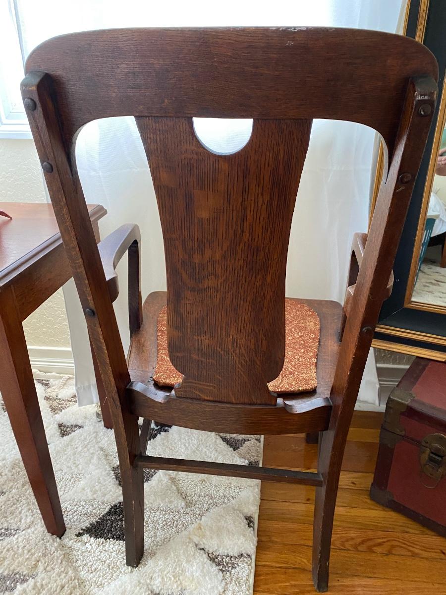 Antique Tiger Oak armchair with claw feet in front. Seat is approx 19-1/2w x 17d x 18h. Back of chair is 40”h. Very good condition
