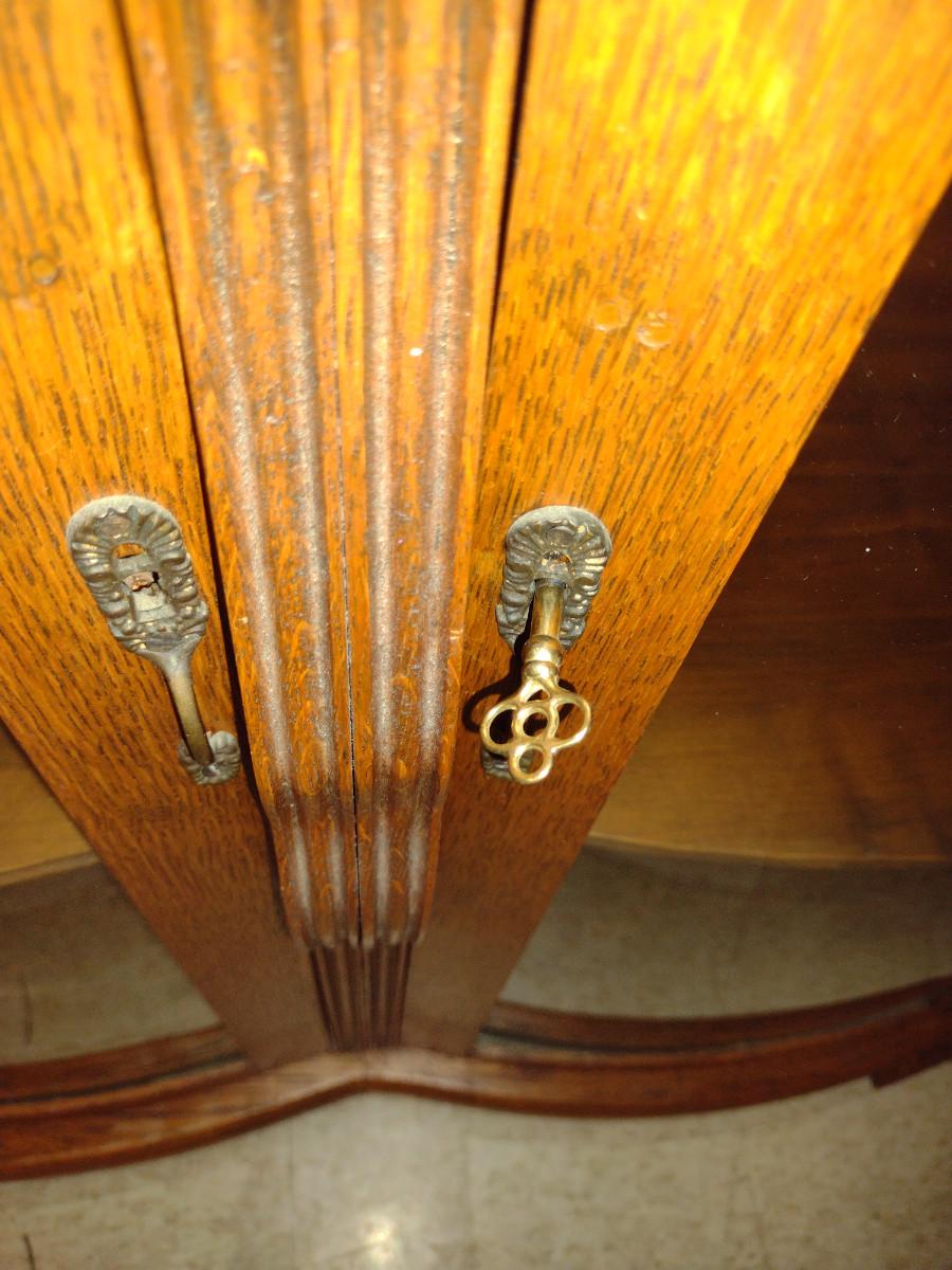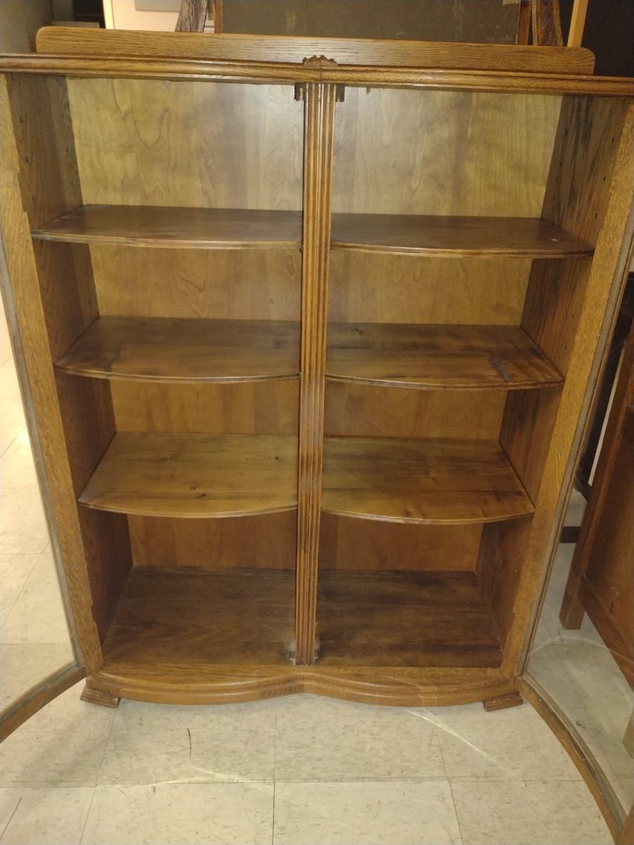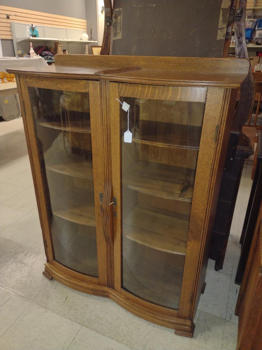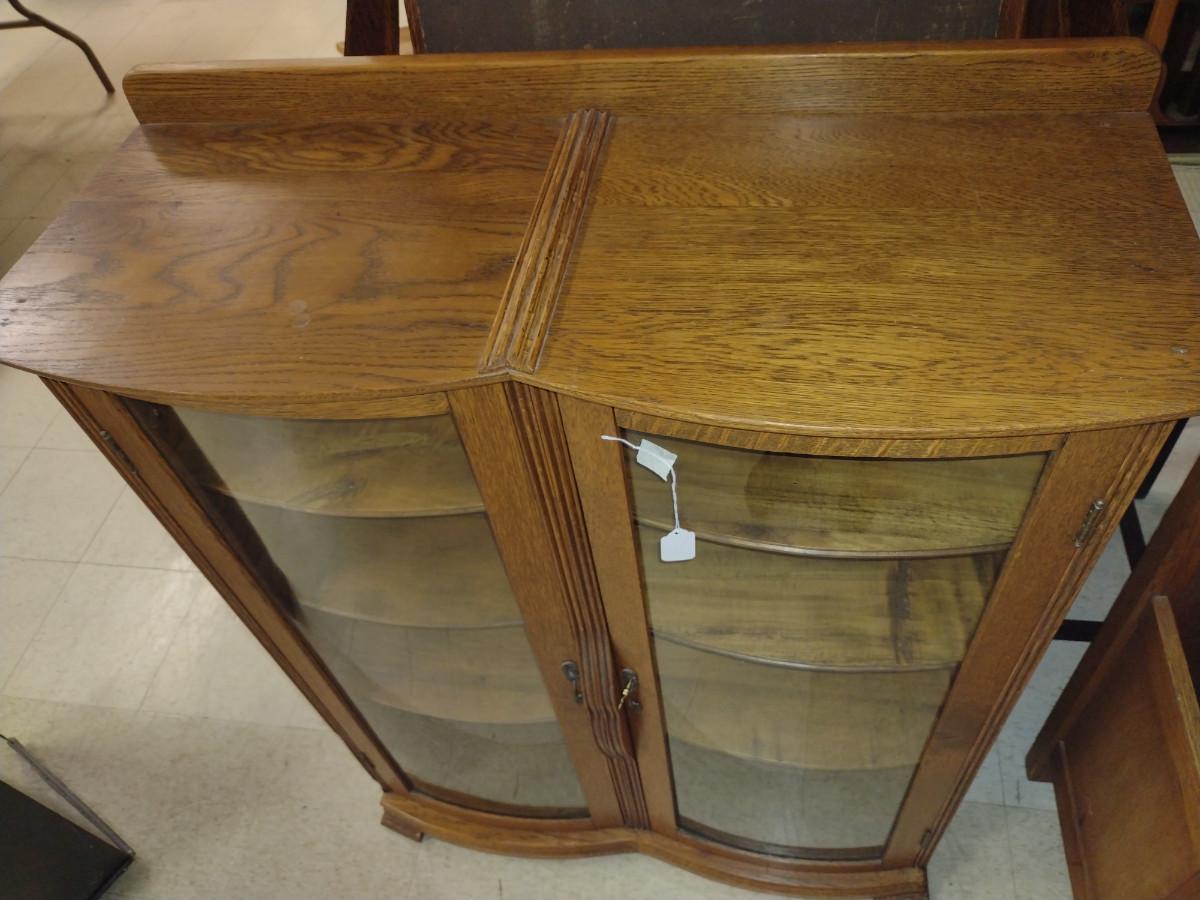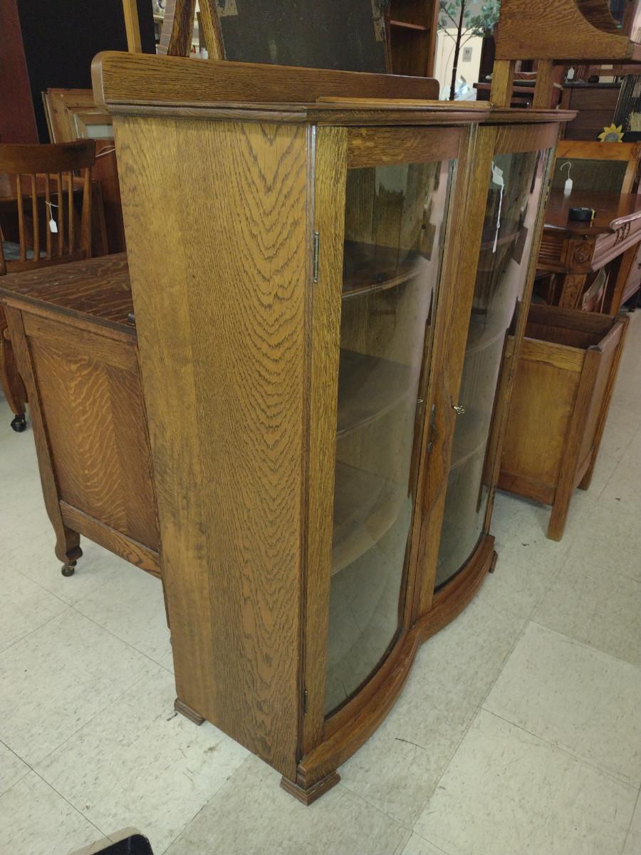 Antique Tiger Oak Curved Glass Double Door Display Cabinet with Key- Approx 35" x 14 1/4" x 43 1/4" Tall