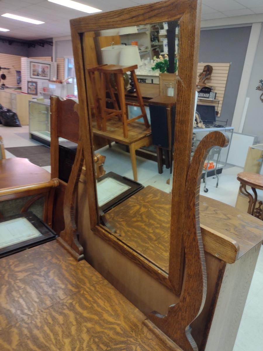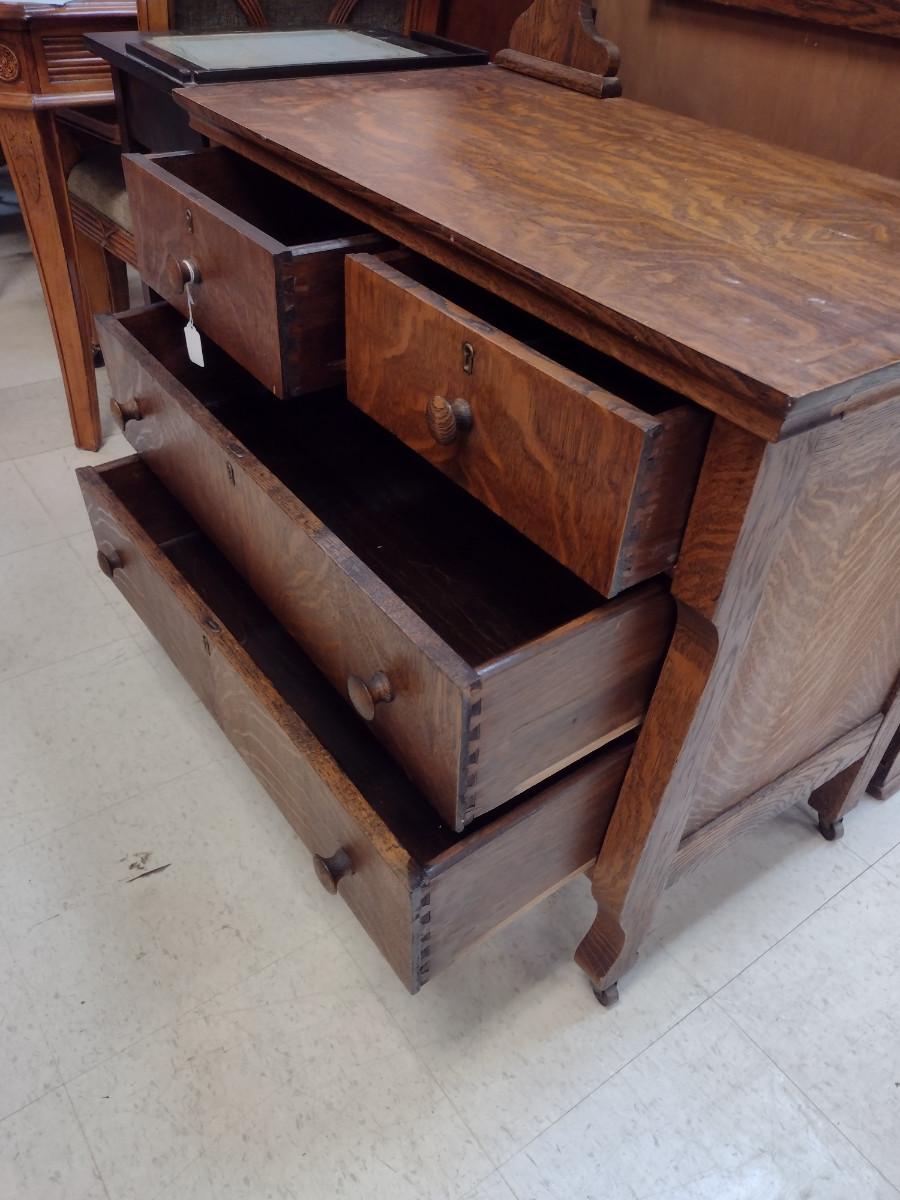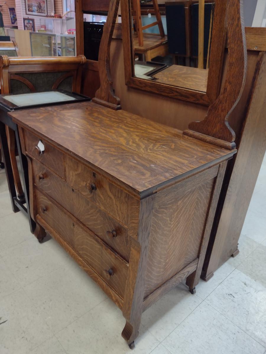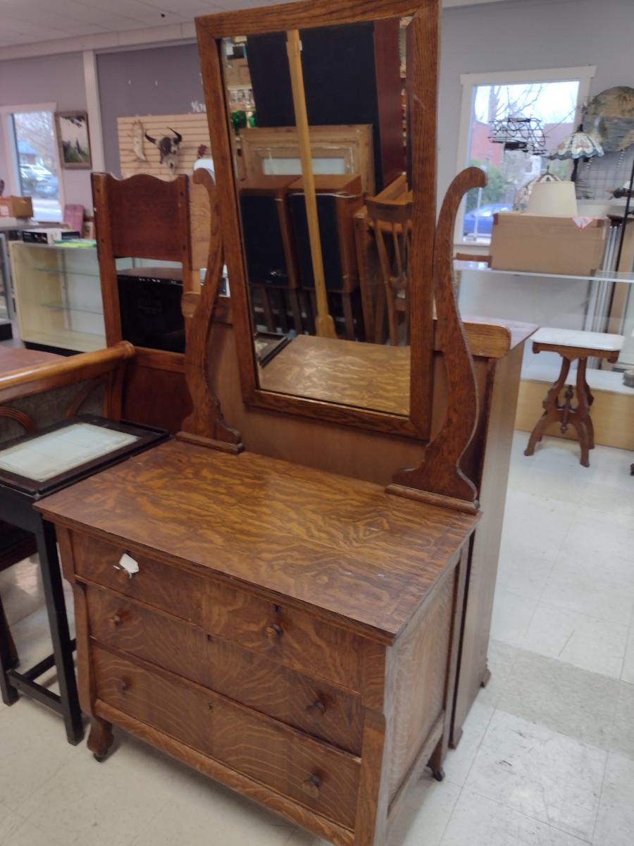 Antique Tiger Oak Dresser with Swiveling Mirror- Approx 34" x 19 1/2" x 29 3/4" Tall. Mirror is approx 20 3/4" wide and 34 3/4" tall.