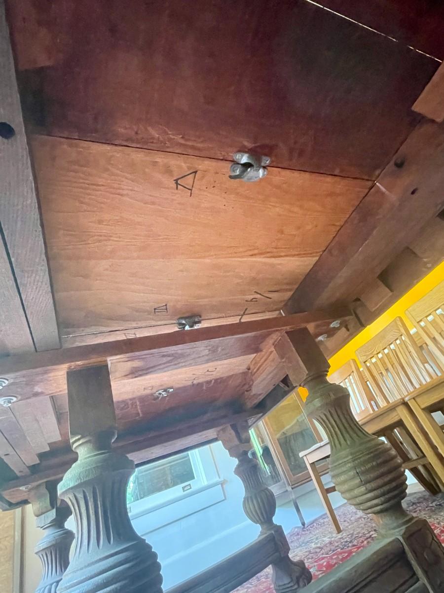 Table has a total of 7 leaves. Measures 29" tall x 53.5" long (without leaves) x 47.5" wide.