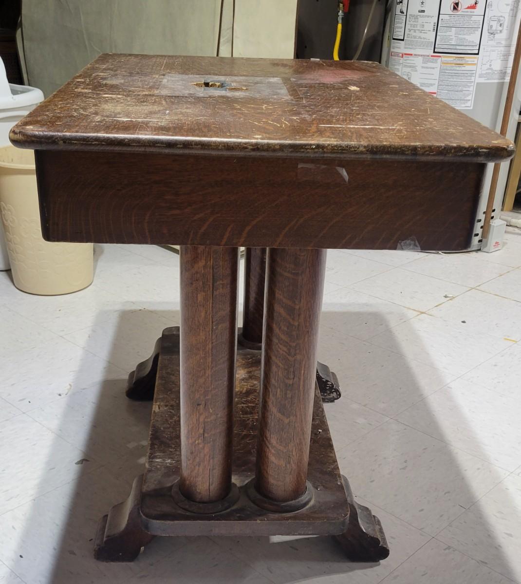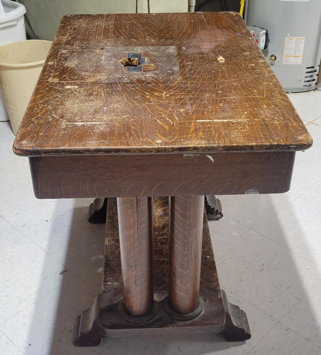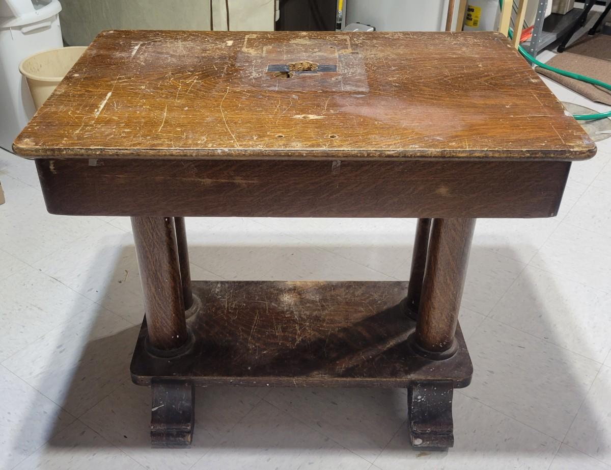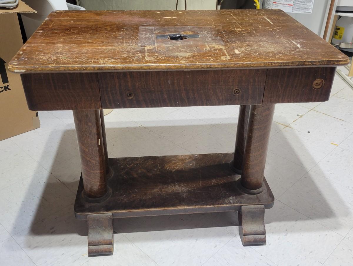 This was used in the craft room. There are a couple holes cut into the top. This table would be a good project piece for the D.I.Y.'er.