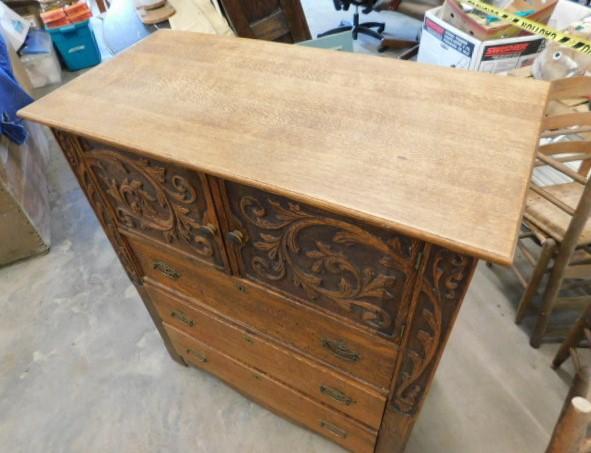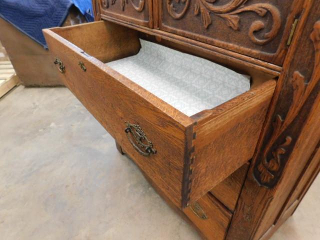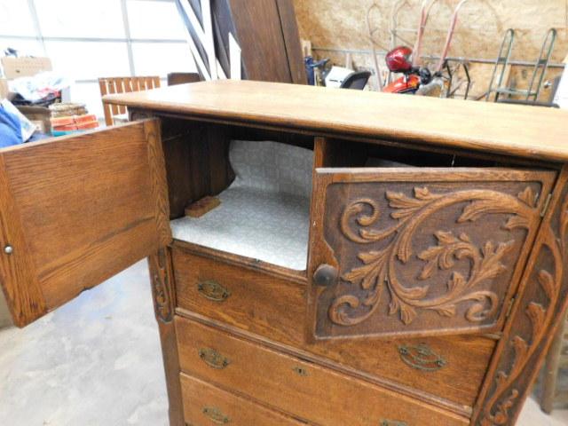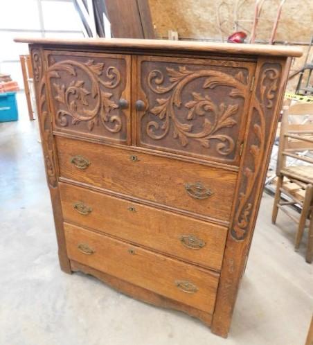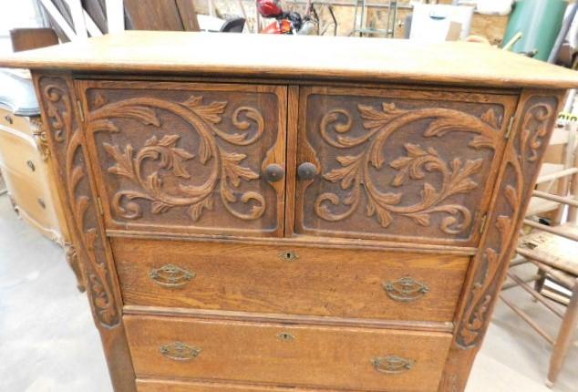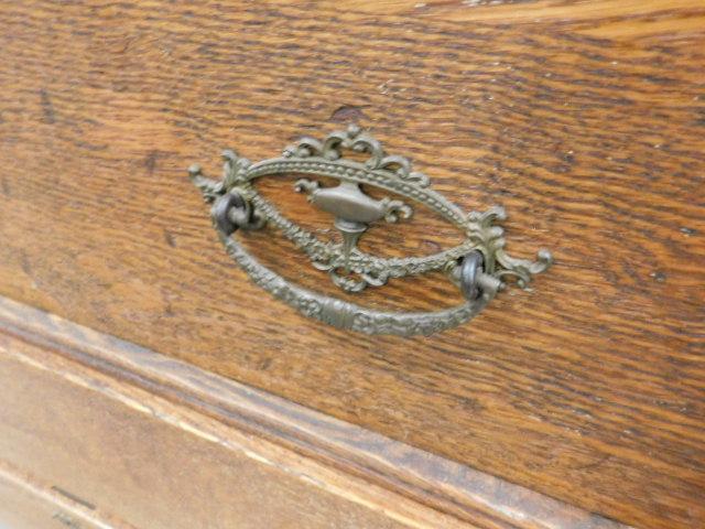 Antique Tiger Oak Three Drawer Dresser with Decorative Scroll Work 40"x20"x47"