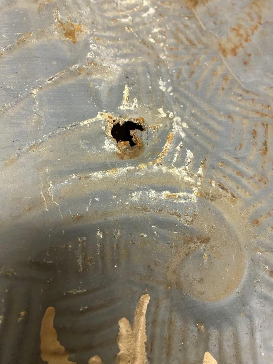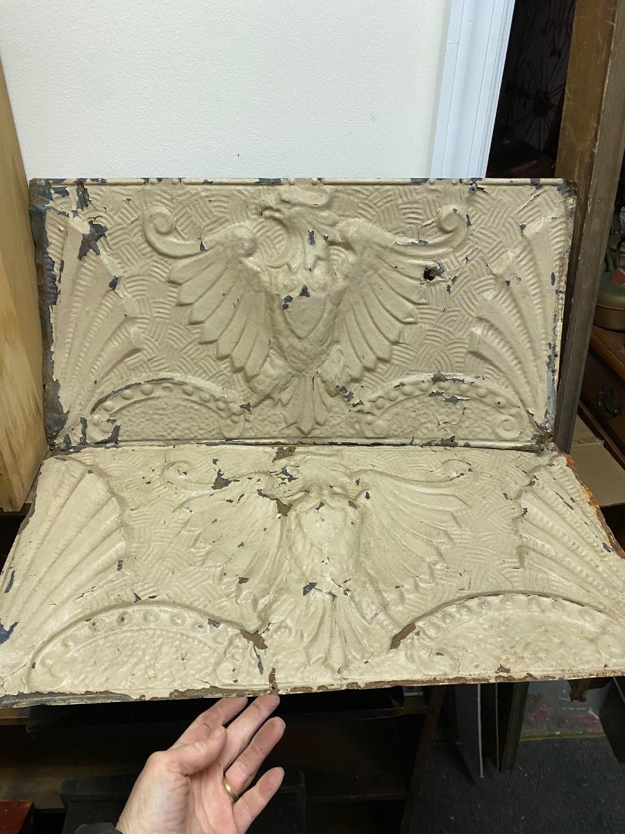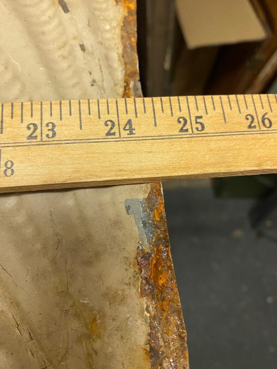 Antique Tin Ceiling Trim Panel. 2 panels 12. 24. Nice Chippy Paint Patina Galore!. This piece is a salvage piece and was taken out of a building very long ago. It displays paint chipping, rust, holes from nails, some splitting in the metal from the nails being removed. Being removed. And some ruffled up edges.