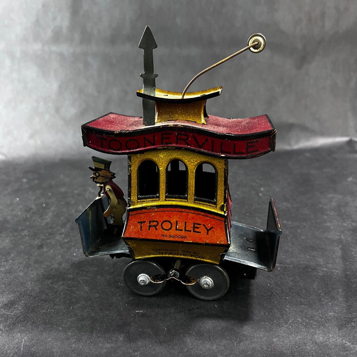 This antique Tin Wind-Up is a Toonerville Trolley. Produced in Germany, dated 1922. This lil' guy still has good action. could use some tweaking, it is over 100 years old. **Works, Video of Function on YouTube Video, Has Key** I'd say it "rambles" along. Please see photos for details and condition. **|** ::: Shipping is available on this lot. If you require shipping you must let us know at the close of the auction. We will coordinate with you after the item has been won. Shipping fees will include insurance up to or exceeding the value of all items being mailed. If you have any questions regarding this lot please contact the auctioneer either via this website, by direct email or by phone. PICK UP TIMES and other important information can be found in the TERMS and DESCRIPTION of the auction. Please take a look for pertinent information. Thanks!