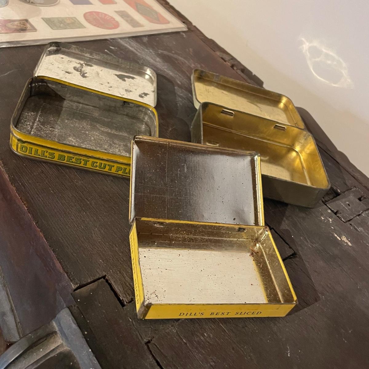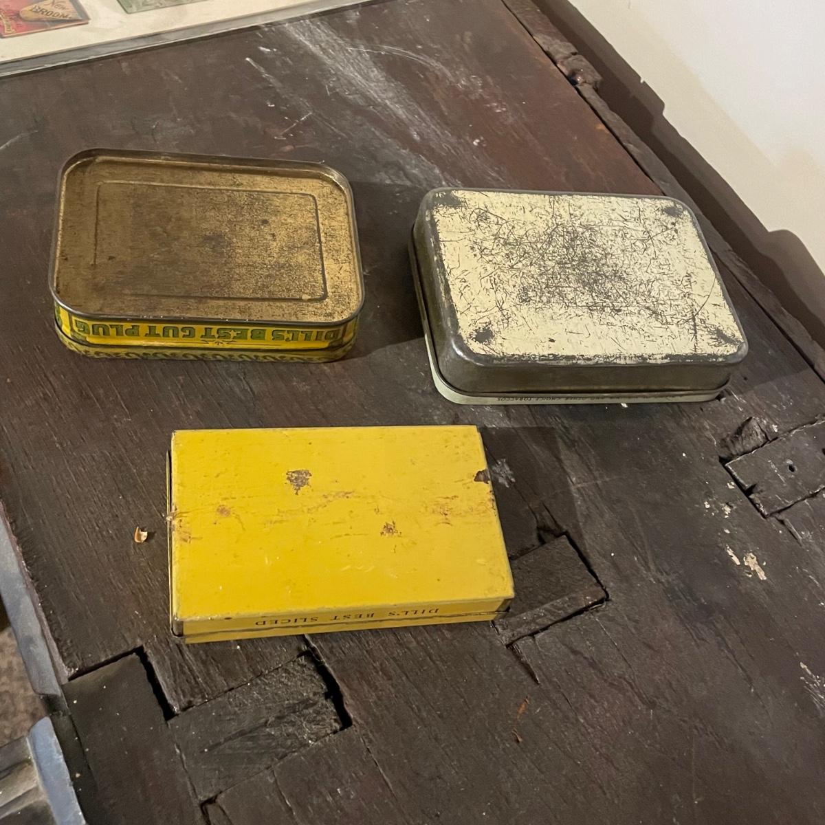 Fourteen antique tobacco tins along with a piece of card that measures 7.5” x 10” that contains tobacco paper labels.