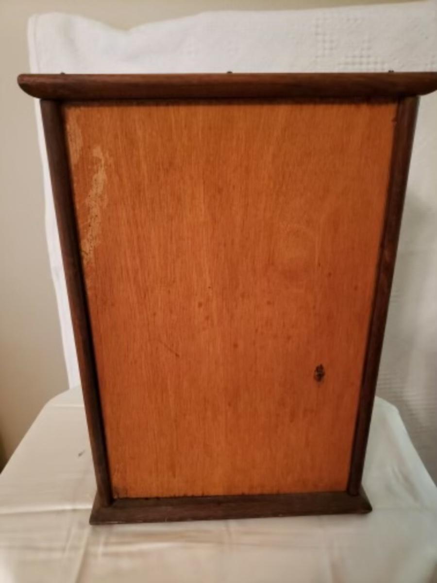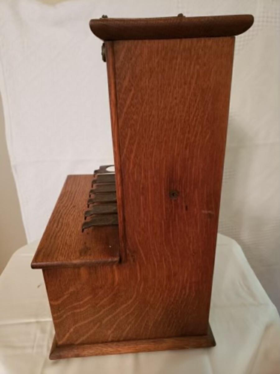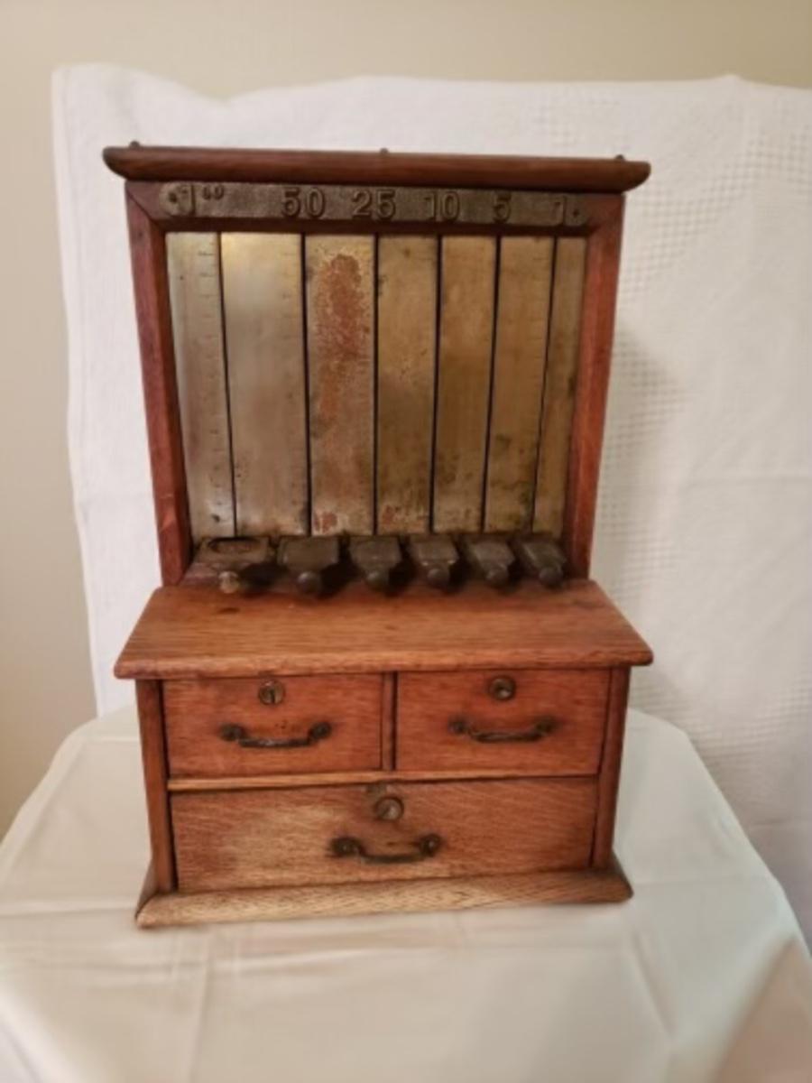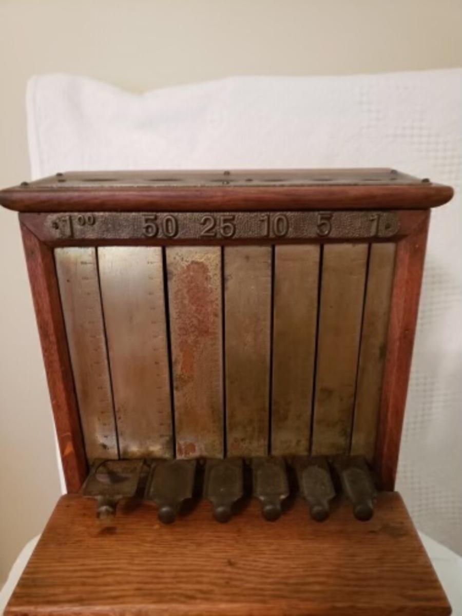 Antique Token Machine. Oak with 3 drawers. 18"H x 13W 10.5D. Very Good condition.