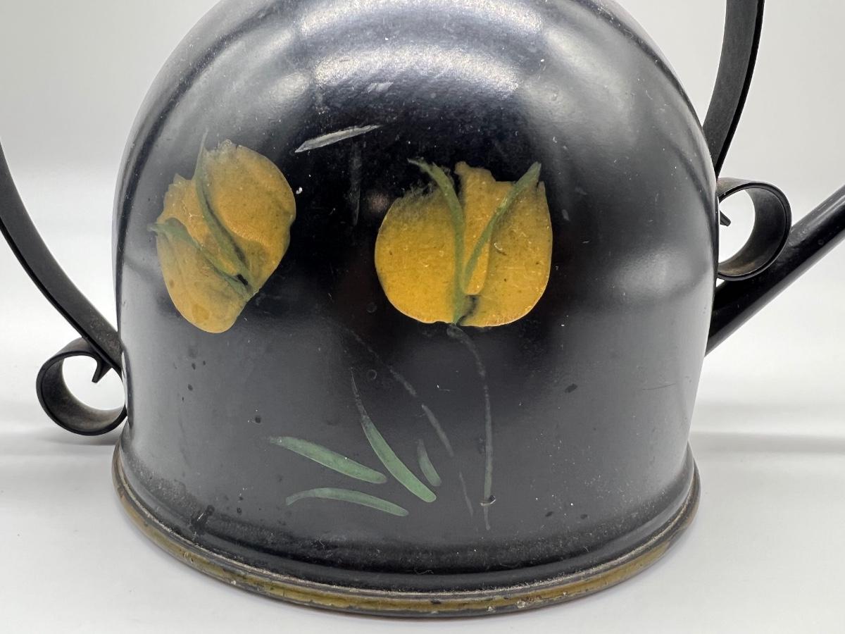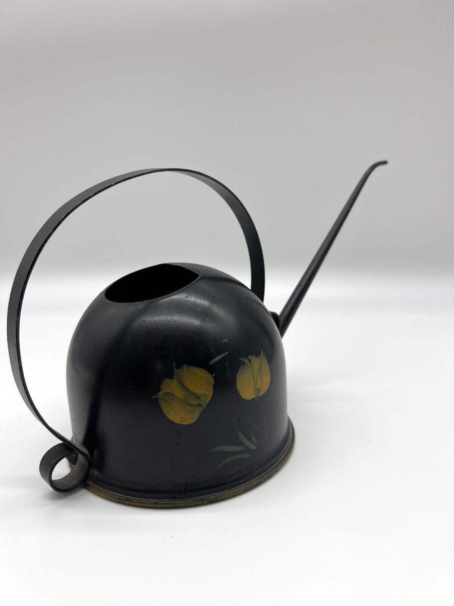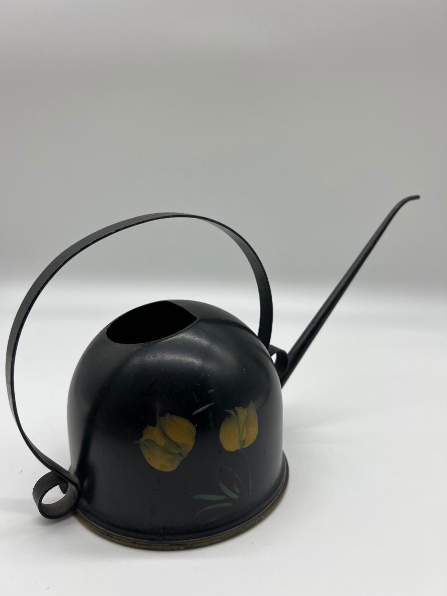 Grand Aunties Antique Tole Watering Can Hand painted Flower Metal Garden Can Black Tinwork. Measures 8 inches tall and 6 inches round at the bottom.