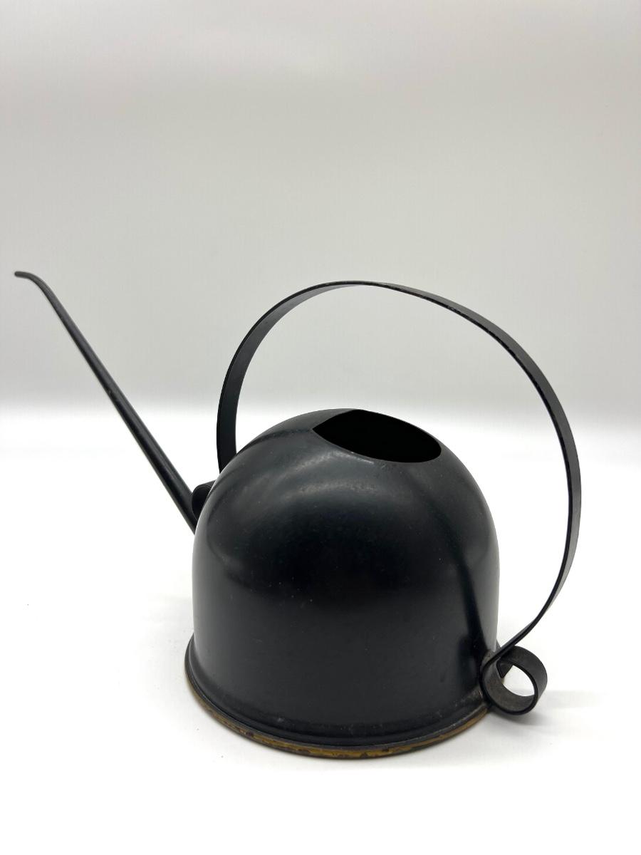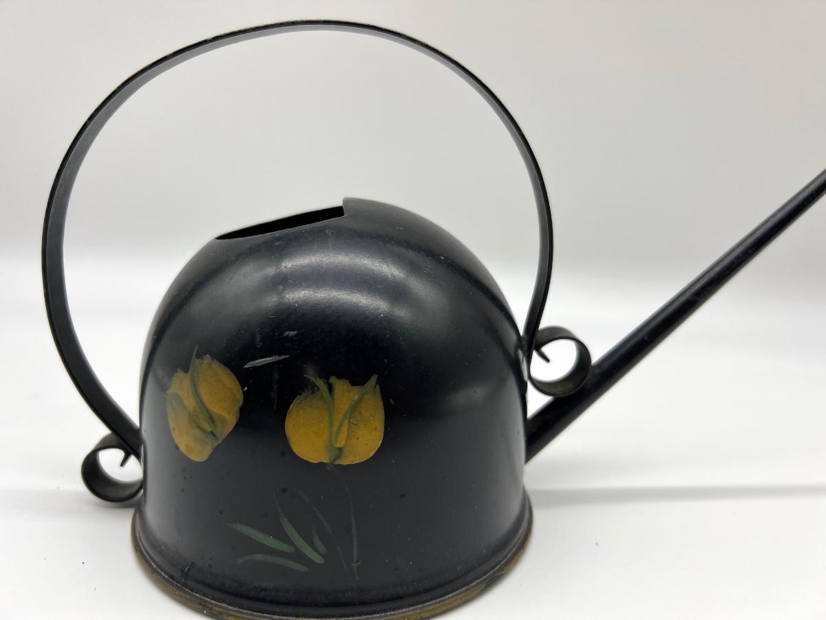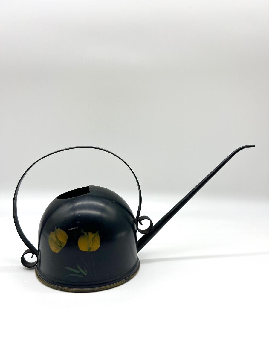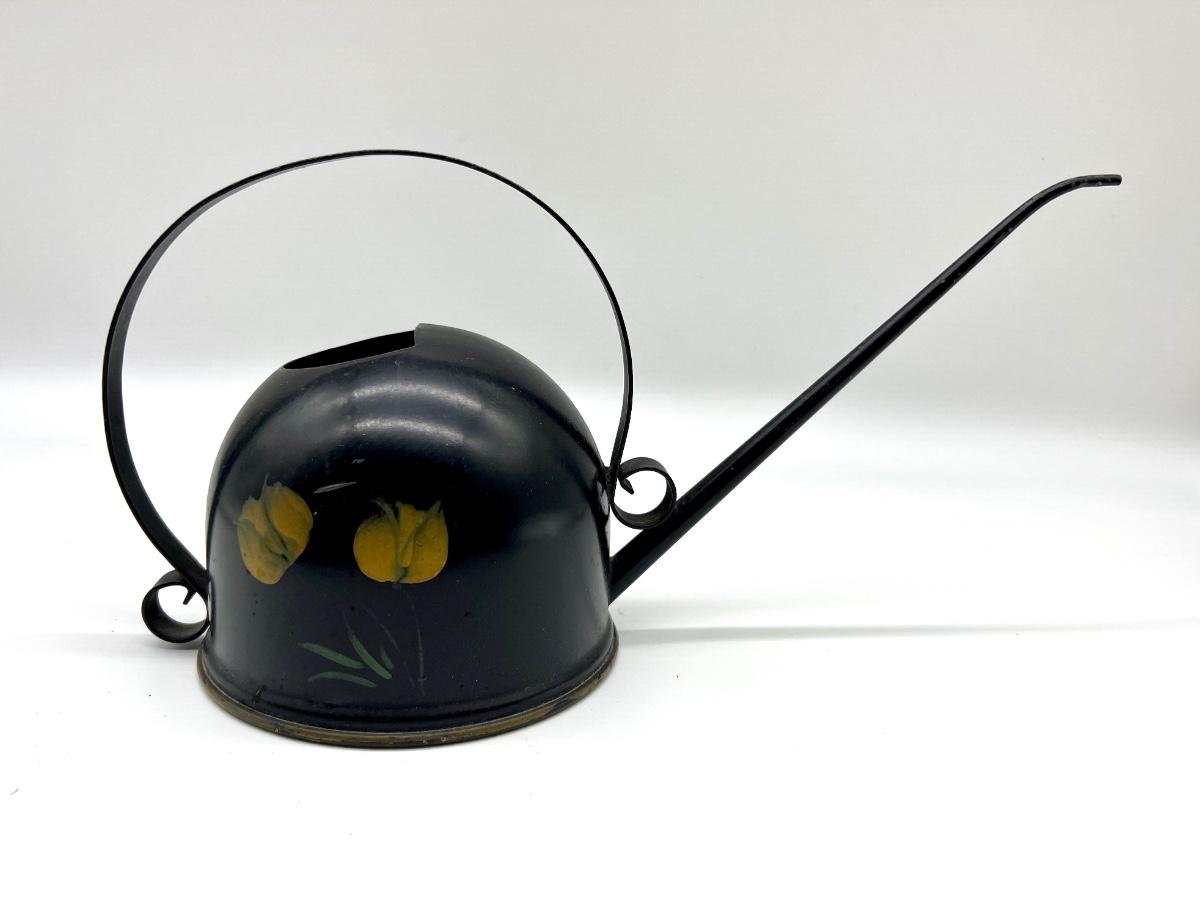 Grand Aunties Antique Tole Watering Can Hand painted Flower Metal Garden Can Black Tinwork. Measures 8 inches tall and 6 inches round at the bottom.