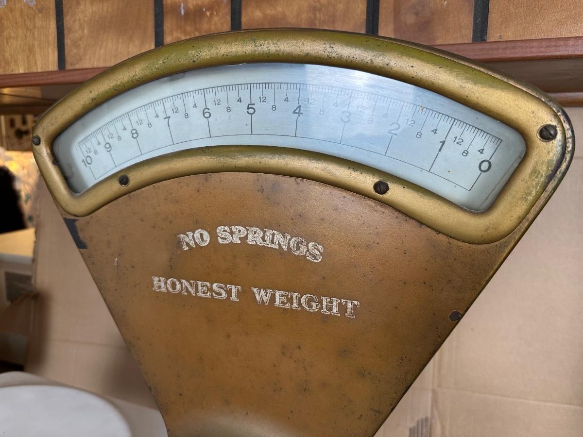 Original antique Toledo Scale Company cast iron counter scale with porcelain weighing tray. Marked “NO SPRINGS – HONEST WEIGHT.” Classic early grocery / butcher shop display piece. Mechanism present, inspection sticker visible.