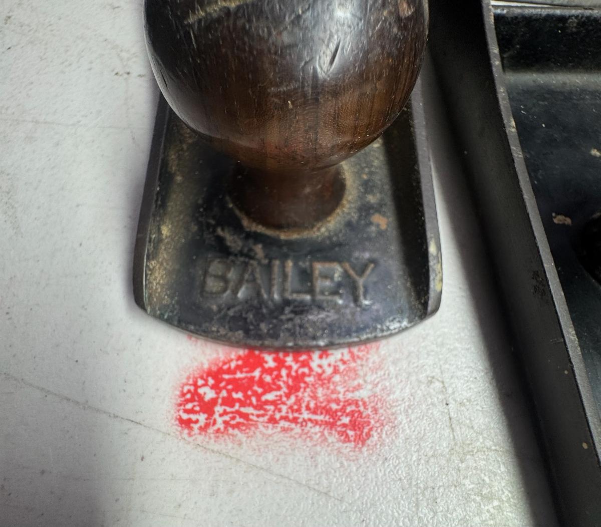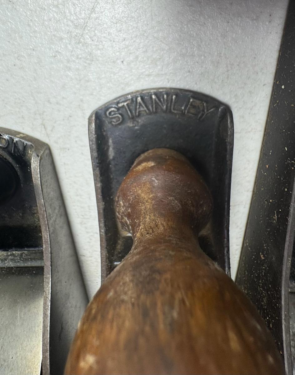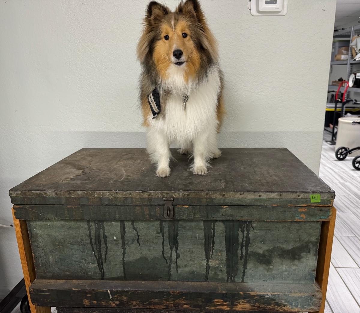 This is a wood chest with a tin top. Contents include saws, files, tape measures, block planes, brace, and more. The chest is attached to a wooden rolling cart. Measurement of chest: 38” x 22” x 16.5”. [JL]
